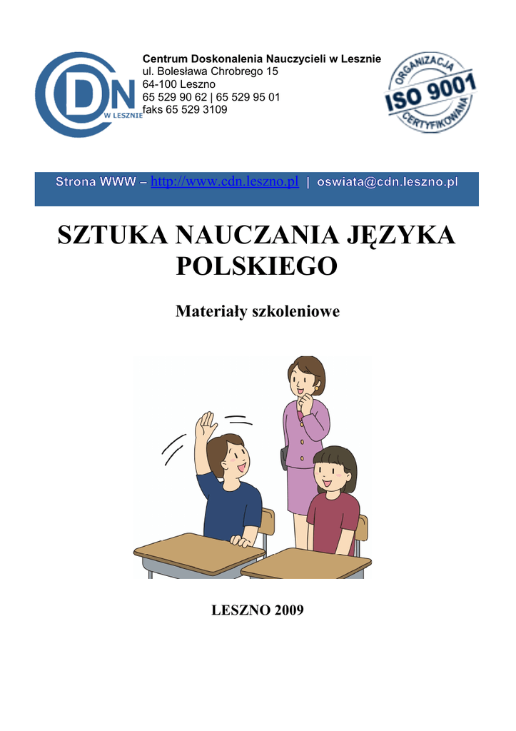 Centrum Doskonalenia Nauczycieli w Lesznie ul. Bolesława Chrobrego 15 64-100 Leszno 65 529 90 62 | 65 529 95 01 faks 65 529 3109 Strona WWW – http://www.cdn.leszno.pl | [email protected] SZTUKA NAUCZANIA JĘZYKA POLSKIEGO Materiały szkoleniowe LESZNO 2009 MATERIAŁY SZKOLENIOWE OPRACOWAŁA Iwona Gubańska SKŁAD KOMPUTEROWY Piotr Świdziński WYDAWCA CENTRUM DOSKONALENIA NAUCZYCIELI W LESZNIE 64-100 Leszno tel. 065 529 90 62 ul. Bolesława Chrobrego 15 e-mail: [email protected] CDN/0613-1/09 Nakład 31 egzemplarzy faks 065 529 31 09 www.cdn.leszno.pl Koleżankom i Kolegom, których trud nie zawsze można przełożyć na wymierne efekty tekst Andrzeja Waligórskiego dedykuje autorka opracowania. List w sprawie polonistów Polonista to nie zawód, lecz hobby, Polonistą być - nie życzę nikomu. Polonista po godzinach nie dorobi, Choćby zabrał robotę do domu. Polonista nie wędruje po mieszkaniach, Nie odzywa się wchodząc ze dworu: - Bardzo ładnie rozbieram zdania, Czy jest jakieś stare zdanie do rozbioru? Choćby szukał, racji i pretekstów I tak zawsze pozostanie na uboczu Mniej się ceni analizę tekstu Od banalnej analizy moczu... Cera blada, na portkach łaty, Rozmaite braki w kondycji, Oświeceniem nie oświecisz sobie chaty, Pozytywizm nie poprawi twej pozycji. Poloniście sterczą chude żebra Jak sztachety mizernego płotu, Gdy się jeden raz u Zuzi rozebrał, To się składał z orzeczenia i podmiotu. A jak inny zleciał kiedyś z ławki, Bo był gapa wyjątkowa i niezguła, To zostały zeń cztery przydawki, Dwa zaimki i partykuła...Polonista, niepoprawny romantyk, Nie największym się cieszy mirem, Ale ja mu - laury i akanty, Ale ja mu - kadzidło i mirrę! Ale ja go całuję w ramię, Ale ja go podziwiam i cenię, A ty przed nim na kolana, chamie, Cały w złocie i volkswagenie! Bo jeżeli jesteś i ja jestem, To dlatego, że stojący na warcie Polonista znużonym gestem Kartki książek wertował uparcie Za kajzera i za Hitlera, I za cara i za innych carów paru, I dlatego właśnie nie umiera Coś ważnego, co nazywa się Naród. Więc zamieszczam na końcu listu Ja, satyryk, błazen i ladaco, Zdanie proste: - Kocham polonistów! Rozwinięcie zdania: ...bo jest za co! Andrzej Waligórski (cyt. za: http://poezjabiedronki.bloog.pl...) Wstęp Czy można posiąść sztukę nauczania języka polskiego? Jeżeli potraktujemy ją jako rodzaj rzemiosła, to zapewne z czasem będzie to całkiem możliwe. Sadzę jednak, że owej sztuki – my poloniści – uczymy się nieustannie. Nie jest to cykl, który ma swój wyraźny koniec. Ta niewielka broszurka jest efektem spotkań z polonistami w CDN w Lesznie w ramach szkolenia „Sztuka nauczania języka polskiego”. Absolutnie nie uzurpuje sobie ona prawa do wyczerpania tematu, który przecież, co wcześniej wyraziłam, jest w istocie niewyczerpalny. Stanowi jedynie zarys problemu, zawiera pewne propozycje polonistycznych oddziaływań ujęte w bogatej literaturze przedmiotu, której bibliografia znajdzie się na końcu tego opracowania. W zderzeniu ze szkolną rzeczywistością autentycznych wyborów dotyczących sposobów nauczania musi już dokonać sam nauczyciel. W tym działaniu wcale nie musi literalnie pojmować przeróżnych metod i technik nauczania. Ma prawo ich nowelizowania i wykazania się kreatywnością. Dobrze byłoby, aby przyjął za maksymę swoich działań myśl Danuty Bernackiej: Nauczanie jest działalnością intencjonalną nauczyciela, który stara się wywołać u ucznia uczenie się (Bernacka D.,Od słowa do działania, Warszawa 2001, s. 9). Autorka książki Od słowa do działania przywołuje też słowa prof. K. Konarzewskiego, które doskonale oddaję charakter naszej – polonistów - pracy: Specjalista to ktoś, kto potrafi pracować bez wskazówek i nadzoru; ktoś, kto nie traci głowy, gdy zawodzą rutynowe metody, bo potrafi metody nie tylko stosować, lecz także – w razie potrzeby – tworzyć. Zapewne to na co dzień czynimy, ale też chyba nie ukrywamy, że niekiedy przydają nam się „podpowiedzi” i doświadczenia innych. Koleżankom i Kolegom, uczestnikom szkolenia w CDN w Lesznie, serdecznie dziękuję za udział w spotkaniach, zaangażowanie i „pomysły na język polski”. Iwona Gubańska I. Kim jesteś, polonisto? Kim musisz być? Chciałoby się odpowiedzieć bardzo prosto: prawie alfą i omegą. 1) Czy istnieją granice naszego przedmiotu? Chyba najtrafniejszą próbą odpowiedzi będą słowa Barbary Krydy: Ala - ma - kota i Wielka improwizacja, recepta lekarska i wyznania miłosne, komunikat meteorologiczny i Pieśń nad pieśniami, kołysankaśpiewanka nucona bez świadomości tekstu i referat o poszukiwaniu sensu w egzystencji, rytmika recytowanego tekstu, kształt widowiska i wymowa biografii artysty – gdzie są granice tego przedmiotu? (za: Rusek M. Kwestia stylu, w: Doskonalenie warsztatu nauczyciela polonisty, red. A. Janus-Sitarz, Kraków 2005, s. 206) 2) Autorefleksja – potrzebna zawsze. Nie chodzi o to, co robimy z dziećmi. Chodzi o to, kim jesteśmy. Żadna najdoskonalsza metoda nauczania nie będzie wystarczająca, jeśli my – sami ze sobą, nie jesteśmy „w domu”. Wszyscy jesteśmy uczniami, wszyscy się uczymy. Nauczyciel tylko wtedy może nauczać, jeśli potrafi również zakwestionować samego siebie. Rozwiązanie problemu nie polega na lepiej dostosowanych klasach szkolnych, ich wyposażeniu, systemie podziału na grupy, nowych technikach i metodach, choć one też mają swój wpływ. Rozwiązanie to leży w tobie.” (Whitmore, 1994) (za: Taraszkiewicz M., Jak uczyć lepiej, czyli refleksyjny praktyk w działaniu, Warszawa 1996, s. 20) Po zajęciach można zadać sobie takie np. pytania: na tej lekcji: dowiedziałam się/dowiedziałem się – nie dowiedziałam się/nie dowiedziałem się o sobie czegoś nowego; potrafiłam/potrafiłem – nie potrafiłam/nie potrafiłem pobudzić uczniów do myślenia; sam coś lepiej zrozumiałam/zr