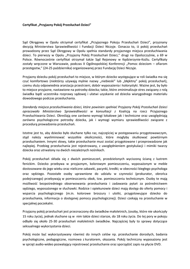 Certyfikat „Przyjazny Pokój Przesłuchań Dzieci” Sąd Okręgowy w Opolu otrzymał certyfikat „Przyjaznego Pokoju Przesłuchań Dzieci”, przyznany decyzją Ministerstwa Sprawiedliwości i Fundacji Dzieci Niczyje. Oznacza to, iż pokój przesłuchań prowadzony przez Sąd Okręgowy w Opolu spełnia standardy przyjaznego miejsca przesłuchiwania dzieci. To pierwszy w Opolu „Przyjazny Pokój Przesłuchań Dzieci,” drugi na Opolszczyźnie, a 69 w Polsce. Równocześnie certyfikat otrzymał także Sąd Rejonowy w Kędzierzynie-Koźlu. Certyfikaty zostały wręczone w Warszawie, podczas X Ogólnopolskiej Konferencji „Pomoc dzieciom – ofiarom przestępstw,” (24-25 października) organizowanej przez Fundację Dzieci Niczyje. Przyjazny dziecku pokój przesłuchań to miejsce, w którym dziecko występujące w roli świadka ma się czuć komfortowo (niektórzy używają mylnie nazwy „niebieski” lub „błękitny” pokój przesłuchań), czemu służy odpowiednia aranżacja przestrzeni, dobór wyposażenia i kolorystyki. Ważne jest, by było to miejsce przyjazne, nastawione na potrzeby dziecka; takie, które zminimalizuje stres związany z rolą świadka bądź uczestnika rozprawy sądowej i ułatwi uzyskanie od dziecka wiarygodnego materiału dowodowego podczas przesłuchania. Standardy miejsca przesłuchiwania dzieci, które powinien spełniać Przyjazny Pokój Przesłuchań Dzieci opracowało Ministerstwo Sprawiedliwości w konsultacji z Koalicją na rzecz Przyjaznego Przesłuchiwania Dzieci. Określają one zarówno wymogi lokalowe jak i techniczne oraz uwzględniają zarówno psychologiczne potrzeby dziecka, jak i wymogi wymiaru sprawiedliwości związane z procedurą prowadzenia przesłuchań. Istotne jest to, aby dziecko było słuchane tylko raz, najczęściej w postępowaniu przygotowawczym, stąd należy wyeliminować wszystkie okoliczności, które mogłyby skutkować powtórnym przesłuchaniem. Innymi słowy, takie przesłuchanie musi zostać przygotowane i przeprowadzone jak najlepiej. Przebieg przesłuchania jest rejestrowany, z uwzględnieniem gestykulacji i mimiki twarzy dziecka oraz utrwalony na dwóch niezależnych nośnikach. Pokój przesłuchań składa się z dwóch pomieszczeń, przedzielonych wyciszoną ścianą z lustrem fenickim. Dziecko przebywa w przyjaznym, kolorowym pomieszczeniu, wyposażonym w meble dostosowane do jego wieku oraz nieliczne zabawki, pacynki, kredki; w obecności biegłego psychologa oraz sędziego. Pozostałe osoby uprawnione do udziału w czynności (prokurator, obrońca podejrzanego) przebywają w pomieszczeniu obok, tzw. pomieszczeniu technicznym. Osoby te mają możliwość bezpośredniego obserwowania przesłuchania i zadawania pytań za pośrednictwem sędziego, wyposażonego w słuchawki. Rodzice i opiekunowie dzieci mają dostęp do oferty pomocy i wsparcia psychologicznego (m.in. kolorowe broszury i ulotki, przygotowujące dziecko do przesłuchania, informacja o dostępnej pomocy psychologicznej). Dzieci czekają na przesłuchanie w specjalnej poczekalni. Przyjazny pokój przesłuchań jest przeznaczony dla świadków małoletnich, (osoby, które nie ukończyły 15 roku życia), jednak słuchane są w nim także dzieci starsze, do 18 roku życia. Do tej pory w pokoju odbyło się około 25-30 przesłuchań małoletnich świadków. Najczęściej były to sprawy dotyczące seksualnego wykorzystania dzieci. Pokój może być wykorzystywany również do innych celów np. przesłuchanie dorosłych, badania psychologiczne, pedagogiczne, rozmowa z kuratorem, okazania. Pokój techniczny wyposażony jest w sprzęt audio-wideo pozwalający rejestrować przesłuchanie oraz sporządzić zapis na płycie DVD. Co daje przyznanie certyfikatu? Fundacja Dzieci Niczyje wymienia następujące korzyści: Po 1. - jest to dowód na spełnianie wysokich standardów dot. miejsca przesłuchiwania dzieci. Po 2. - umieszczenie certyfikowanych pokoi na stronie Fundacji w ramach prowadzonego programu "Dziecko - świadek szczególnej troski" oraz Ministerstwa Sprawiedliwości, co pomaga promować pokój przesłuchań. Po 3. - przesłanie wykazu pokoi, które otrzymały certyfikat do odpowiednich sądów i prokuratur, co ułatwi nawiązanie ściślejszej współpracy z nimi. Po 4. - uzyskanie rekomendacji od Fundacji Dzieci Niczyje i Ministerstwa Sprawiedliwości co do potrzeby przeprowadzenia zmian w wyposażeniu lub funkcjonowaniu pokoju.