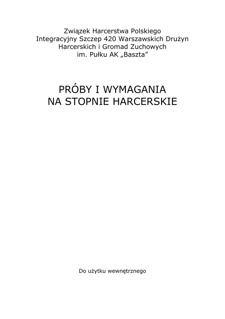 Związek Harcerstwa Polskiego Integracyjny Szczep 420 Warszawskich Drużyn Harcerskich i Gromad Zuchowych im. Pułku AK „Baszta” PRÓBY I WYMAGANIA NA STOPNIE HARCERSKIE Do użytku wewnętrznego Opracowano na podstawie Uchwały nr 40/XXXII Rady Naczelnej ZHP z dn. 15 czerwca 2003 r. w sprawie przyjęcia instrumentu metodycznego – stopnie harcerskie. Opracowanie: Tomasz Wachowicz i spółka :) Zatwierdzono podczas Rady Szczepu z dn. …………. Wszelkie uwagi prosimy zgłaszać na adres: [email protected] Imię i nazwisko:…………………………………………………………………………… Data urodzenia: …………………………………………………………………………… Drużyna: ……………………………………………………………………………………… Data pierwszej zbiórki: …………………………………………………… Data przyjęcie do środowiska: ……………………………………… Data złożenia Przyrzeczenia Harcerskiego: …………………… Zdobyte stopnie: Stopień ochotniczka młodzik tropicielka wywiadowca pionierka odkrywca samarytanka ćwik Harcerka / Harcerz Orli Harcerka / Harcerz Rzeczypospolitej rozkaz i data otwarcia rozkaz i data zamknięcia potwierdzenie Próba Środowiska Poznaję swoją drużynę, jej zwyczaje, obrzędy i tradycje. Chcę zostać do niej przyjęty. Jestem gotowy wstąpić w szeregi Integracyjnego Szczepu 420 Warszawskich Drużyn Harcerskich i Gromad Zuchowych im. Pułku AK „Baszta” Wymagania próby: 1. 2. 3. 4. 5. 6. 7. 8. 9. 10. 11. 12. 13. 14. 15. Systematycznie uczestniczyłem/am w zbiórkach drużyny/zastępu przez co najmniej 3 miesiące. Wraz z drużynowym zapoznałem/am się z treścią Prawa i Przyrzeczenia Harcerskiego, opowiedziałem/am przy tym co rozumie przez poszczególne punkty prawa. Staram się postępować zgodnie z Prawem Harcerskim. Potrafię przywitać się, przedstawić i zameldować po harcersku. Założyłem/am notatnik harcerski, w którym notuję poznane elementy wyszkolenia harcerskiego oraz śpiewnik z co najmniej 8 piosenkami harcerskimi w tym „Bratnie słowo”, „Hymn ZHP” i „Płonie ognisko”. Wiem co to jest zastęp i drużyna. Rozróżnia funkcje w drużynie (sznury) Skompletowałem/am mundur harcerski, dbam o niego i prawidłowo go noszę. Znam nazwę zastępu, drużyny oraz szczepu. Wiem jakie są barwy i numer drużyny/szczepu. Wiem kto jest bohaterem drużyny i szczepu. Znam tradycje, obrzędy i zwyczaje swojej drużyny. Znam sieć alarmową zastępu, sprawnie staję na zbiórki alarmowe. Znam podstawową musztrę harcerza. Postawę zasadniczą „baczność”, swobodną „spocznij” oraz zwroty. Znam imiona i nazwiska swoich bezpośrednich przełożonych. Wiem jak się z nimi skontaktować. Wiem kto jest bohaterem Hufca ZHP Praga Południe i jak wygląda jego godło. Spełniłem/am dobry uczynek. Potrafię w bezpieczny sposób oraz najkrótsza drogą dotrzeć na miejsce zbiórki. Złożyłem/am wniosek o przyjęcie do drużyny harcerskiej. Próba harcerki – harcerza (3 - 6 mcy) Staram się zasłużyć na miano harcerki/harcerza. Chcę poznać harcerstwo i dostosować się do jego wymagań, określonych w prawie i Przyrzeczeniu Harcerskim. Chcę przebywać w zastępie (patrolu) i drużynie. Warunki dopuszczenia do próby: Chcę być harcerką / harcerzem. Zostałem/am przyjęty/a do środowiska. Ukończyłem/am 10 lat. Złożyłem wniosek o otwarcie próby harcerki /harcerza. Wymagania próby: Systematycznie uczestniczyłem/am w zbiórkach drużyny/zastępu przez 6 miesięcy. Znam na pamięć Prawo i Przyrzeczenie Harcerskie. Wiem do czego mnie one zobowiązują i opowiem o tym drużynowemu. Swój śpiewnik uzupełniłem/am o 5 nowych piosenek w tym „Balladę na złe drogi”. W notatniku przeznaczyłem/am specjalnie 2 strony na wypisanie Prawa i Przyrzeczenia Harcerskiego. Potrafię w 3 min ubrać się w mundur galowy. Wiem kto jest założycielem skautingu oraz gdzie i kiedy odbył się pierwszy obóz skautowy. Wiem, kto założył pierwsze drużyny skautowe w Polsce i jak wiadomość o skautingu dotarła do Polski. Znam symbolikę krzyża harcerskiego, opowiem co przez nią rozumiem. Wiem kto i kiedy go zaprojektował oraz na czym się wzorował. Znam symbolikę lilijki harcerskiej i opowiem co przez nią rozumie. Wiem czym są organizacje WOSM i WAGGS oraz jakie są ich symbole. Znam symbolikę lilijki skautowej (chł) i koniczynki skautowej (dz). Znam hymn ZHP i potrafię go zaśpiewać. Wie kto jest jego autorem. Na kartce rozrysuję strukturę ZHP. Wiem jaki sznur funkcyjny noszą: komendant i zastępca komendanta szczepu,hufca oraz chorągwi, naczelnik ZHP i jego zastępca. Potrafię podać genezę harcerskiego „Czuwaj!” i do czego ono zobowiązuje. Oprócz siebie potrafię zameldować również zastęp. Znam podstawową musztrę harcerską. Oprócz postaw baczność, spocznij oraz zwrotów potrafię stanąć w dwuszeregu, poruszać się w kolumnie dwójkowej, odliczać oraz wiem co zrobić na komendę wystąp/wstąp. W mundurze noszę zawsze zapasowe guziki od munduru, igłę i nici (w kolorach błękitnym, czerwonym, czarnym i białym), zapałki i draskę zabezpieczone przez wilgocią, agrafki, kartkę papieru i coś do pisania. Wykonałem/am z zastępem przynajmniej jedno zadanie zespołowe lub projekt. W domu przez 7 dni będę wykonywał określony obowiązek. Przejdę co najmniej 5 km błękitnym szlakiem i przedstawię na to dowód. Ochotniczka – Młodzik (6 – 9 mcy) Z ochotą poznaję smak harcerskiej przygody. W swoim postępowaniu kieruję się Prawem Harcerskim. Pamiętam o codziennym dobrym uczynku. Chętnie zdobywam nowe wiadomości i umiejętności przydatne w zastępie, drużynie, domu i szkole. Jestem zaradna/y, dzielna/y i pogodna/y. Warunki dopuszczenia do próby: Zostałem/am przyjety/a do środowiska. Złożyłem/am Przyrzeczenie Harcerskie. Mam zarejest
