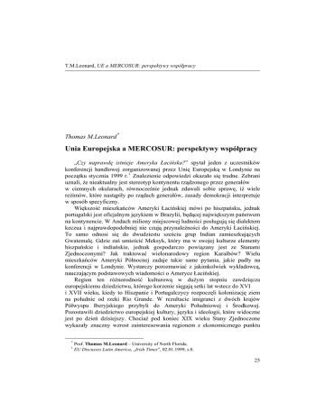 T.M.Leonard, UE a MERCOSUR: perspektywy współpracy Thomas M.Leonard * Unia Europejska a MERCOSUR: perspektywy współpracy „Czy naprawdę istnieje Ameryka Łacińska?” spytał jeden z uczestników konferencji handlowej zorganizowanej przez Unię Europejską w Londynie na początku stycznia 1999 r. 1 Znalezienie odpowiedzi okazało się trudne. Zebrani uznali, że nieaktualny jest stereotyp kontynentu rządzonego przez generałów w ciemnych okularach, równocześnie jednak zdawali sobie sprawę, iż wiele reżimów, które nastąpiły po rządach generałów, zasady demokracji interpretuje w sposób specyficzny. Większość mieszkańców Ameryki Łacińskiej mówi po hiszpańsku, jednak portugalski jest oficjalnym językiem w Brazylii, będącej największym państwem na kontynencie. W Andach miliony miejscowej ludności posługują się dialektem keczua i najprawdopodobniej nie czują przynależności do Ameryki Łacińskiej. To samo odnosi się do dwudziestu sześciu grup Indian zamieszkujących Gwatemalę. Gdzie zaś umieścić Meksyk, który ma w swojej kulturze elementy hiszpańskie i indiańskie, jednak gospodarczo powiązany jest ze Stanami Zjednoczonymi? Jak traktować wielonarodowy region Karaibów? Wielu mieszkańców Ameryki Północnej zadaje takie same pytania, jakie padły na konferencji w Londynie. Wystarczy porozmawiać z jakimkolwiek wykładowcą, nauczającym podstawowych wiadomości o Ameryce Łacińskiej. Region ten różnorodność kulturową w dużym stopniu zawdzięcza europejskiemu dziedzictwu, którego korzenie sięgają setki lat wstecz do XVI i XVII wieku, kiedy to Hiszpanie i Portugalczycy rozpoczęli kolonizację ziem na południe od rzeki Rio Grande. W rezultacie imigranci z dwóch krajów Półwyspu Iberyjskiego przybyli do Ameryki Południowej i Środkowej. Pozostawili dziedzictwo europejskiej kultury, języka i ideologii, które widoczne jest po dzień dzisiejszy. Chociaż pod koniec XIX wieku Stany Zjednoczone wykazały znaczny wzrost zainteresowania regionem z ekonomicznego punktu * 1 Prof. Thomas M.Leonard – University of North Florida. EU Discusses Latin America, „Irish Times”, 02.01.1999, s.8. 25 Studia Europejskie, 1/2001 widzenia, jednak aż do II wojny światowej mocarstwa europejskie, zwłaszcza Wielka Brytania i Niemcy, nadal odgrywały główną rolę w handlu i inwestycjach. W 1945 r., po porażce Niemiec i ruinie gospodarczej Wielkiej Brytanii, ekonomiczna próżnia w Ameryce Łacińskiej otworzyła drzwi do gospodarczej penetracji regionu Stanom Zjednoczonym. Ponadto po 1945 roku kwestie polityczne związane z „zimną wojną” przyczyniły się do amerykańskiej hegemonii w regionie. 2 Powojenna obecność Stanów Zjednoczonych w Ameryce Łacińskiej zmniejszyła zainteresowanie Europy tym regionem. Pod koniec lat 50. kilka krajów europejskich odnowiło stare kontakty z państwami tego obszaru, zwłaszcza z Argentyną, Brazylią i Meksykiem, jednak nie miało to przełożenia na późniejsze inwestycje. Pomimo powstania Europejskiej Wspólnoty Gospodarczej w 1957 r. Europa nie poczyniła skoordynowanego wysiłku zmierzającego do wprowadzenia w życie programu pomocy ekonomicznej, ani też nie rozważała możliwości ewentualnej współpracy gospodarczej. Dopiero w 1971 r., w rezultacie działań Specjalnej Komisji Koordynacyjnej ds. Ameryki Łacińskiej (Comisión Especial de Coordinación Latinamericano – CELA), EWG wykazała większe zainteresowanie. Rok 1971 ogłoszono „Rokiem Ameryki Łacińskiej” i stworzono „mechanizm dialogu” dla corocznych dyskusji z ambasadorami krajów latynoamerykańskich w Brukseli. Jednak trudno było mówić o prawdziwym postępie. Kilka czynników uniemożliwiało rozwój znaczących stosunków gospodarczych między Europą a Ameryką Łacińską w latach 60. i 70., w tym problemy wewnętrzne EWG i niekorzystny wpływ „szoków naftowych” z lat 70., jak również kłopoty w samej Ameryce Łacińskiej. Przykładowo, wczesne próby współpracy w regionie, takie jak Stowarzyszenie Wolnego Handlu Ameryki Łacińskiej (Latin American Free Trade Association – LAFTA) z 1960 r., Wspólny Rynek Ameryki Środkowej (Central American Common Market – CACM) z 1961 r., Karaibska Wspólnota i Wspólny Rynek (Caribbean Free Trade Association - CARICOM) z 1965 r., borykały się z problemami własnej tożsamości i w najlepszym razie były zwiastunem przyszłej współpracy. Owo dwudziestolecie było świadkiem rządów brutalnych reżimów wojskowych w większości państw latynoamerykańskich. Ich nacjonalistyczna polityka 2 Historia gospodarcza Ameryki Łacińskiej została przedstawiona w: J.H.Coatsworth, A.M. Taylor, Latin America and the World Economy Since 1800, Cambridge 1998 oraz V.BulmerThomas, The Economic History of Latin America Since Independence, London 1994. Por. także doskonałą pracę nt. obecności brytyjskiej: R.Miller, Britain and Latin America in the Nineteenth and Twentieth Centuries, London 1993 oraz opracowania poruszające stosunki Ameryka Łacińska-Stany Zjednoczone w pierwszych latach „zimnej wojny”: D.M.Coerver, L.B.Hall, Tangled Destinies: Latin America and the United States, Albuquerque 1999, rozdz. 5; M.T.Gilderhus, The Second Century: U.S.-Latin American Relations Since 1889, Wilmington 2000, rozdz. 4 i 5; P.H.Smith, Talons of the Eagle: Dynamics of United States-Latin American Relations, 2nd ed., New York 2000, rozdz. 5-8. 26 T.M.Leonard, UE a MERCOSUR: perspektywy współpracy ekonomiczna nie stanowiła dobrej podstawy do współpracy w celu nawiązania stosunków gospodarczych poza regionem, zaś wyjątkiem było tu tylko Chile. 3 Stosunki między Europą a Ameryką Łacińską uległy dalszemu zaostrzeniu w rezultacie wojny o Falklandy/Malwiny w kwietniu 1982 r., kiedy to Wspólnoty Europejskie poparły Wielką Brytanię podczas krótkotrwałego, acz krwawego konfliktu z Argentyną. Wprawdzie w wyniku wojny przywrócono demokratyczne rządy w Argen