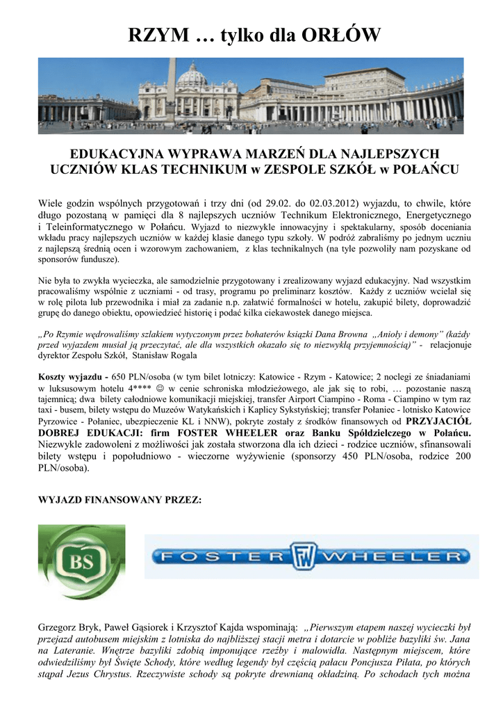 RZYM … tylko dla ORŁÓW EDUKACYJNA WYPRAWA MARZEŃ DLA NAJLEPSZYCH UCZNIÓW KLAS TECHNIKUM w ZESPOLE SZKÓŁ w POŁAŃCU Wiele godzin wspólnych przygotowań i trzy dni (od 29.02. do 02.03.2012) wyjazdu, to chwile, które długo pozostaną w pamięci dla 8 najlepszych uczniów Technikum Elektronicznego, Energetycznego i Teleinformatycznego w Połańcu. Wyjazd to niezwykle innowacyjny i spektakularny, sposób doceniania wkładu pracy najlepszych uczniów w każdej klasie danego typu szkoły. W podróż zabraliśmy po jednym uczniu z najlepszą średnią ocen i wzorowym zachowaniem, z klas technikalnych (na tyle pozwoliły nam pozyskane od sponsorów fundusze). Nie była to zwykła wycieczka, ale samodzielnie przygotowany i zrealizowany wyjazd edukacyjny. Nad wszystkim pracowaliśmy wspólnie z uczniami - od trasy, programu po preliminarz kosztów. Każdy z uczniów wcielał się w rolę pilota lub przewodnika i miał za zadanie n.p. załatwić formalności w hotelu, zakupić bilety, doprowadzić grupę do danego obiektu, opowiedzieć historię i podać kilka ciekawostek danego miejsca. „Po Rzymie wędrowaliśmy szlakiem wytyczonym przez bohaterów ksiązki Dana Browna „Anioły i demony” (każdy przed wyjazdem musiał ją przeczytać, ale dla wszystkich okazało się to niezwykłą przyjemnością)” - relacjonuje dyrektor Zespołu Szkół, Stanisław Rogala Koszty wyjazdu - 650 PLN/osoba (w tym bilet lotniczy: Katowice - Rzym - Katowice; 2 noclegi ze śniadaniami w luksusowym hotelu 4**** w cenie schroniska młodzieżowego, ale jak się to robi, … pozostanie naszą tajemnicą; dwa bilety całodniowe komunikacji miejskiej, transfer Airport Ciampino - Roma - Ciampino w tym raz taxi - busem, bilety wstępu do Muzeów Watykańskich i Kaplicy Sykstyńskiej; transfer Połaniec - lotnisko Katowice Pyrzowice - Połaniec, ubezpieczenie KL i NNW), pokryte zostały z środków finansowych od PRZYJACIÓŁ DOBREJ EDUKACJI: firm FOSTER WHEELER oraz Banku Spółdzielczego w Połańcu. Niezwykle zadowoleni z możliwości jak została stworzona dla ich dzieci - rodzice uczniów, sfinansowali bilety wstępu i popołudniowo - wieczorne wyżywienie (sponsorzy 450 PLN/osoba, rodzice 200 PLN/osoba). WYJAZD FINANSOWANY PRZEZ: Grzegorz Bryk, Paweł Gąsiorek i Krzysztof Kajda wspominają: „Pierwszym etapem naszej wycieczki był przejazd autobusem miejskim z lotniska do najbliższej stacji metra i dotarcie w pobliże bazyliki św. Jana na Lateranie. Wnętrze bazyliki zdobią imponujące rzeźby i malowidła. Następnym miejscem, które odwiedziliśmy był Święte Schody, które według legendy był częścią pałacu Poncjusza Piłata, po których stąpał Jezus Chrystus. Rzeczywiste schody są pokryte drewnianą okładziną. Po schodach tych można poruszać się jedynie na kolanach! Odwiedziliśmy także stadion olimpijski, który dziś wykorzystują drużyny AS ROMA i LAZIO. Na długo zostanie nam w pamięci wystawa BodyWorlds - ekspozycja, wystawiana na całym świecie od 1995 r., prezentujących plastynaty, głównie … ludzkich zwłok. Pomysłodawcą i twórcą ekspozycji jest Gunther von Hagens. Wystawy BodyWorlds budzą ogromne zainteresowanie widzów - ekspozycje na całym świecie obejrzało ponad 30 milionów osób. Długo zastanawialiśmy się gdzie leży granica pomiędzy nauką i sztuką, a kolację zjedliśmy bardzo … późno”. „Trudno opowiedzieć a co dopiero opisać to co zobaczyłem, jednakże postaram się wyrazić emocje które przy tym towarzyszyły. Watykan i plac św. Piotra - po prostu coś niesamowitego - w zdumienie wprawiał fakt, ile pracy i czasu zostało włożone by stworzyć tak wspaniałą budowlę, do której rocznie napływa miliony ludzi z każdej części świata. Kolumnada otaczająca plac, egipski obelisk po środku i dwie fontanny sprawiały naprawdę niesamowite wrażenie, które dopełniała bazylika św. Piotra, która zdumiewała bogactwem i przepychem wnętrza. Ogromne rzeźby ewangelistów, groby papieży (m. in. Jana Pawła II) umacniały pewność że to miejsce święte. To co zobaczyłem było niezwykłe i na pewno zostanie w mej pamięci na długo” - podsumowuje wyjazd Daniel Ziemniak. „Odwiedziliśmy kościoły Santa Maria della Vittoria i Santa Maria del Popolo. Pierwszy z nich zaciekwił nas, ze względu na słynną rzeźbę "Ekstaza św. Teresy" stworzoną w XVII w. przez Berniniego. Drugi z wymienionych kościołów został zbudowany w stylu romańskim. Mieliśmy możliwość oglądać w nim piękne obrazy i dzieła sztuki sakralnej”- opowiadają Marcin Markowski i Rafał Laska „W Rzymie zwiedziliśmy wiele ciekawych zabytków m.in Koloseum i Bazylikę św. Piotra w Watykanie. Jednym z najciekawszych miejsc były ogromne Muzea Watykańskie, zawierające najbogatszą kolekcję dzieł sztuki na całym świecie. Znajduje się w nich niezliczona ilość dzieł największych mistrzów, których dokładne obejrzenie zajęłoby bardzo dużo czasu. Widzieliśmy tam zbiory obrazów, map, ksiąg oraz pomieszczenia ozdobione freskami. Wszystkich oczarowała Kaplica Sykstyńska, ozdobiona freskami Michała Anioła, a także Sala Sobieskiego z obrazem Jana Matejki przedstawiającym Jana III Sobieskiego po zwycięstwie pod Wiedniem”- mówi Kamil Błasiak z II A TE „Spacerując ulicą Via dei Fori Imperali z zafascynowaniem oglądaliśmy XII- wieczny kościół Santa Maria in Aracoeli udekorowany barokowymi freskami i nagrobkami oraz kopię skradzionej uzdrawiającej i powszechnie czczonej figurki Santa Bambino. Idąc dalej podziwialiśmy ogromny pomnik Wiktora Emanuela II (króla, który zjednoczył Włochy), zwany Ołtarzem Ojczyzny lub złośliwie -„maszyną do pisania”. Następnie starymi, lecz ruchliwymi uliczkami wiecznego miasta zmierzaliśmy do Panteonu. W Panteonie zafascynowała nas kopuła z oculusem o średnicy 9 m, którą uznaliśmy za cud architektoniczny. Wieczorem dotarliśmy do Fontanny Czterech Rzek. Następnie star