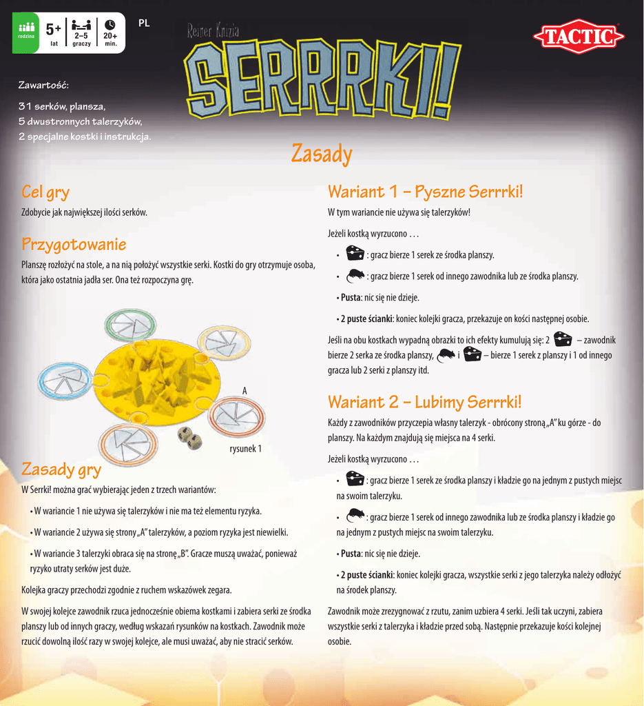 rodzina 5+ lat PL 2–5 graczy 20+ min. Zawartość: 31 serków, plansza, 5 dwustronnych talerzyków, 2 specjalne kostki i instrukcja. Zasady Cel gry Wariant 1 – Pyszne Serrrki! Zdobycie jak największej ilości serków. W tym wariancie nie używa się talerzyków! Jeżeli kostką wyrzucono … Przygotowanie Planszę rozłożyć na stole, a na nią położyć wszystkie serki. Kostki do gry otrzymuje osoba, która jako ostatnia jadła ser. Ona też rozpoczyna grę. •: gracz bierze 1 serek ze środka planszy. •: gracz bierze 1 serek od innego zawodnika lub ze środka planszy. • Pusta: nic się nie dzieje. • 2 puste ścianki: koniec kolejki gracza, przekazuje on kości następnej osobie. Jeśli na obu kostkach wypadną obrazki to ich efekty kumulują się: 2 – zawodnik bierze 2 serka ze środka planszy, i – bierze 1 serek z planszy i 1 od innego gracza lub 2 serki z planszy itd. A rysunek 1 Zasady gry W Serrki! można grać wybierając jeden z trzech wariantów: • W wariancie 1 nie używa się talerzyków i nie ma też elementu ryzyka. • W wariancie 2 używa się strony „A” talerzyków, a poziom ryzyka jest niewielki. • W wariancie 3 talerzyki obraca się na stronę „B”. Gracze muszą uważać, ponieważ ryzyko utraty serków jest duże. Kolejka graczy przechodzi zgodnie z ruchem wskazówek zegara. W swojej kolejce zawodnik rzuca jednocześnie obiema kostkami i zabiera serki ze środka planszy lub od innych graczy, według wskazań rysunków na kostkach. Zawodnik może rzucić dowolną ilość razy w swojej kolejce, ale musi uważać, aby nie stracić serków. Wariant 2 – Lubimy Serrrki! Każdy z zawodników przyczepia własny talerzyk - obrócony stroną „A” ku górze - do planszy. Na każdym znajdują się miejsca na 4 serki. Jeżeli kostką wyrzucono … • : gracz bierze 1 serek ze środka planszy i kładzie go na jednym z pustych miejsc na swoim talerzyku. • : gracz bierze 1 serek od innego zawodnika lub ze środka planszy i kładzie go na jednym z pustych miejsc na swoim talerzyku. • Pusta: nic się nie dzieje. • 2 puste ścianki: koniec kolejki gracza, wszystkie serki z jego talerzyka należy odłożyć na środek planszy. Zawodnik może zrezygnować z rzutu, zanim uzbiera 4 serki. Jeśli tak uczyni, zabiera wszystkie serki z talerzyka i kładzie przed sobą. Następnie przekazuje kości kolejnej osobie. Jeżeli podczas gry na talerzyku znajdą się 4 serki, zawodnik ściąga je z talerzyka i kładzie przed sobą. Jego kolejka kończy się i przekazuje on kości następnej osobie. Jeśli na obu kostkach wypadną obrazki to ich efekty kumulują się: 2 – zawodnik bierze 2 serki ze środka planszy, i – bierze 1 serek z planszy i 1 od innego gracza lub 2 serki z planszy itd. Nie można w jednej kolejce zebrać więcej niż 4 serki, nawet gdy kości pokazują taki wynik. Piąty serek należy pozostawić na swoim miejscu. Jeśli na obu kostkach wypadną obrazki to ich efekty kumulują się: 2 – zawodnik bierze 2 serki ze środka planszy, i – bierze 1 serek z planszy i 1 od innego gracza lub 2 serki z planszy itd. Koniec gry Gra kończy się, gdy na środku planszy zabraknie serków. Zawodnik, który ma przed sobą najwięcej serków, zostaje zwycięzcą! Level 3 – Uczta Serrrowa! Każdy z zawodników przyczepia własny talerzyk - obrócony stroną „B” ku górze - do planszy. Można na nim trzymać dowolną ilość serków. Jeżeli kostką wyrzucono … • : gracz bierze 1 serek ze środka planszy i kładzie go na swoim talerzyku. • : gracz bierze 1 serek od innego zawodnika lub z planszy i kładzie go na swoim talerzyku. B • Pusta: nic się nie dzieje. • 2 puste ścianki: koniec kolejki gracza, wszystkie serki na jego talerzyku należy odłożyć na środek planszy. rysunek 2 Zawodnik może zrezygnować z rzutu. Jeśli tak uczyni, zabiera wszystkie serki z talerzyka i kładzie przed sobą. Następnie przekazuje kości osobie po swojej lewej stronie. 40842 A