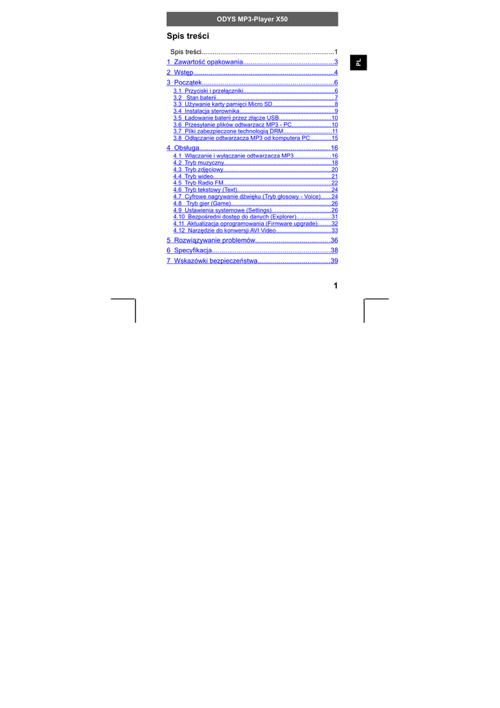 ODYS MP3-Player X50 Spis treści 2 Wstęp..........................................................................4 3 Początek......................................................................6 3.1 3.2 3.3 3.4 3.5 3.6 3.7 3.8 Przyciski i przełączniki.......................................................6 Stan baterii........................................................................7 Używanie karty pamięci Micro SD......................................8 Instalacja sterownika..........................................................9 Ładowanie baterii przez złącze USB................................10 Przesyłanie plików odtwarzacz MP3 - PC........................10 Pliki zabezpieczone technologią DRM.............................11 Odłączanie odtwarzacza MP3 od komputera PC.............15 4 Obsługa.....................................................................16 4.1 Włączanie i wyłączanie odtwarzacza MP3.......................16 4.2 Tryb muzyczny.................................................................18 4.3 Tryb zdjęciowy..................................................................20 4.4 Tryb wideo........................................................................21 4.5 Tryb Radio FM..................................................................22 4.6 Tryb tekstowy (Text).........................................................24 4.7 Cyfrowe nagrywanie dźwięku (Tryb głosowy - Voice)......24 4.8 Tryb gier (Game).............................................................26 4.9 Ustawienia systemowe (Settings)....................................26 4.10 Bezpośredni dostęp do danych (Explorer).....................31 4.11 Aktualizacja oprogramowania (Firmware upgrade)........32 4.12 Narzędzie do konwersji AVI Video..................................33 5 Rozwiązywanie problemów.......................................36 6 Specyfikacja..............................................................38 7 Wskazówki bezpieczeństwa......................................39 1 PL Spis treści......................................................................1 1 Zawartość opakowania................................................3 ODYS MP3-Player X50 PL Warunki gwarancji ................................................41 2 ODYS MP3-Player X50 Przed rozpoczęciem użytkowania należy sprawdzić czy w opakowaniu znajdują się wszystkie poniższe przedmioty. Jeśli zawartość jest niekompletna, należy skontaktować się ze sprzedawcą. ODYS MP3 player X50 Kabel USB Słuchawki Karta gwarancyjna CD-ROM (oprogramowanie i sterowniki) Instrukcja obsługi 3 PL 1 Zawartość opakowania ODYS MP3-Player X50 PL 2 Wstęp Dziękujemy za wybranie naszego produktu. Przed rozpoczęciem użytkowania prosimy uważnie przeczytać niniejszą instrukcję, co pozwoli na najpełniejsze wykorzystanie funkcji urządzenia oraz zagwarantuje jego długie, bezawaryjne użytkowanie. Instrukcję należy zachować, informacje w niej zawarte mogą okazać się także przydatne w przyszłości. Niniejsze urządzenie to przenośny cyfrowy odtwarzacz audio, który pozwala na odtwarzanie utworów w formatach MP3 i WMA, nagrywanie dźwięków i zapisywanie różnych typów plików. Nowoczesny kolorowy wyświetlacz pozwala na przeglądanie cyfrowych zdjęć i filmów. Ostrzeżenie Przed rozpoczęciem użytkowania odtwarzacza MP3 konieczne jest przeczytanie ogólnych wskazówek bezpieczeństwa w części 7. Szczególną uwagę należy zwrócić na bezpieczne zakończenie transferu danych między odtwarzaczem MP3 i komputerem, zawarte w rozdziale 3.7. Właściwości produktu • • • • • • • 4 Kolorowy wyświetlacz TFT 2.4” (320 x 240 pikseli) 260,000 kolorów Szybki transfer danych przez USB 2.0 Obsługiwane formaty: MP3, WMA, WAV, JPEG, BMP, AVI Wbudowana bateria litowo-jonowa Regulowana funkcja oszczędzania energii, jasność i przechodzenie w stan uśpienia Słuchaj muzyki podczas gry lub czytania e-booka Urządzenie może być wykorzystane do przenoszenia danych ODYS MP3-Player X50 • • • • • Możliwość aktualizacji oprogramowania firmware (pobieranie nowego oprogramowania przez internet) Przejrzyste animowane menu, z intuicyjnymi ikonkami i symbolami pozwala na łatwą obsługę urządzenia Kilka trybów odtwarzania i korekcji dźwięku (3D surround) Wyświetlanie tekstów piosenek Cyfrowe nagrywanie z mikrofonem i odtwarzaniem głosu Dostępne wielojęzyczne menu PL • Obsługa URL: http://www.odys.de Sprawdzaj naszą stronę by uzyskać najnowsze wiadomości dotyczące tego odtwarzacza a także innych urządzeń naszej produkcji i o samej firmie. Na stronie są także dostępne wszystkie aktualizacje oprogramowania firmware odtwarzacza MP3. W przypadku jakichkolwiek pytań lub wątpliwości, zachęcamy do zapoznania się z działem FAQ na naszej stronie lub do skontaktowania się z serwisem przez e-mail [email protected]. 5 ODYS MP3-Player X50 3 Początek PL 3.1 Przyciski i przełączniki Przed użyciem odtwarzacza MP3 zapoznaj się z funkcjami przycisków i przełączników. Przycisk On/off standby / A-B / funkcja Hold Uchwyt na pasek Menu M VOL + poprzedni Wyświetlacz 2,4” Złącze USB Mikrofon następny VOL − głośność Odtwarzaj Gniazdo słuchawkowe ON / OFF Gniazdo karty micro SD Główny przełącznik On/off Podstawowe funkcje Przycisk On/off standby: Przycisk On/off (standby), powtórzenie A/B Funkcja Hold (wciśnij razem z przyciskiem play) Przycisk menu: Przełączanie na funkcję menu, wybór opcji/plików : Zwiększanie głośności (VOL +), w górę : Zmniejszanie głośności (VOL -), w dół 6 ODYS MP3-Player X50 Szybkie przewijanie do przodu, następny plik, wybór : opcji Przewijanie do tyłu, poprzedni plik, wyjście z menu Przycisk Play: Odtwarzanie, pauza Główny przełącznik On/off: Przycisk On/off (Resetowanie odtwarzacza w przypadku wystąpienia błędów lub nieprawidłowego działania) PL : Należy zwrócić uwag