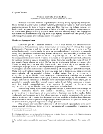 Krzysztof Paczos Wolność człowieka a wiedza Boża Fragment książki Niewiele mniejszy od aniołów, Gdańsk 2005, ss. 129-143. Wolność człowieka widziana w perspektywie wiedzy Bożej wydaje się iluzoryczna. Skoro bowiem Bóg zna wyniki ludzkich wyborów, człowiek nie wydaje się być wolnym, lecz zdeterminowanym do tych wyborów, które zna Bóg. Narzuca się jednak pytanie, czy konieczność, przygodność, przypadkowość widziana z ludzkiej perspektywy jest tym samym, co konieczność, przygodność czy przypadkowość widziana od strony Boga. Inne frapujące w tym kontekście pytanie brzmi: czy Bóg przewiduje wybory ludzkie w ten sam sposób, w jaki człowiek potrafi czasem przewidzieć przyszłe wydarzenia? Konieczne i przypadkowe Konieczne jest to – zdaniem Tomasza – co w swej naturze jest zdeterminowane jednoznacznie do bycia (in sua natura determinatum est solum ad esse)1. Istnieją dwa rodzaje konieczności. Pierwszy z nich to k o n i e c z n o ś ć w y n i k a j ą c a z p r a w a . Ten rodzaj konieczności przeciwstawia się temu, co przypadłościowe, i pochodzi z wymagania samej istoty jakiejś rzeczywistości (np. istota kuli wymaga, aby wszystkie jej średnice były równe). Drugi rodzaj to k o n i e c z n o ś ć w y n i k a j ą c a z d z i a ł a n i a 2. Jest to rodzaj zdarzeń niekoniecznych w sensie pierwszym, a więc przypadłościowych. Zdarzenia te wynikają bowiem z tego, że tak zaistniały pewne fakty, tak ułożyły się pewne siły itd. W ten sposób Ziemia obraca się wokół Słońca. Jest to konieczność jedynie względna, gdyż Ziemia ze swej istoty nie ma takiej konieczności, aby obracać się w ten sposób, ale z zaistniałych przyczyn można w sposób jednoznaczny przewidzieć skutek. Konieczność wynikająca z działania odnosi się do zdarzeń bardziej lub mniej skrycie przypadłościowych. Może być ona trojakiego rodzaju. Po pierwsze, może być to konieczność, która zawsze się urzeczywistnia, jak na przykład codzienny wschód słońca. Jest to w y d a r z e n i e s k r y c i e p r z y p a d ł o ś c i o w e (contingens ut in omnibus3). Naśladuje ono w pewien zewnętrzny sposób konieczność wynikającą z prawa, ale nie osiąga jej niezawodności. Po drugie, konieczność wynikająca z działania może się urzeczywistniać bardzo często, jak na przykład w wypadku pąka, który niemal zawsze wydaje kwiat. Takie wydarzenie w istocie swej jest jednak przypadłościowe, więc możemy je nazwać w y d a r z e n i e m w y r a ź n i e p r z y p a d ł o ś c i o w y m (contingens ut in pluribus). Jeszcze inny rodzaj wydarzenia przypadłościowego, a jednocześnie koniecznego na zasadzie zaistnienia faktów (na zasadzie działania), stanowi w y d a r z e n i e p r z y p a d k o w e (contingens ut in paucioribus). Zachodzi ono bardzo rzadko. Takie wydarzenie jest konieczne, gdyż jest zdeterminowane w swoich przyczynach, ale jest ono skrycie konieczne, tak iż trudne jest do przewidzenia ze względu na bardzo skomplikowane okoliczności lub wielość czynników wpływających na to wydarzenie. Na przykład trudne jest do przewidzenia to, że pisklę wypadnie ze swego gniazda4. Bóg, chociaż zna wszystkie wydarzenia w ich przyczynach i jako jedyna istota jest w stanie ogarnąć niezliczoną liczbę przyczyn warunkujących poszczególne wydarzenia, to 1 In Libros Perihermeneias, I, 14, 8. 2 J. Maritain, Réflexions sur la Nécessité et la Contingens, w: tenże, Raison et raisons, s. 46. Maritain używa tu francuskich terminów: nécessité de droit i nécessité de fait. 3 Ten łaciński termin wprowadził, dla uzupełnienia Tomaszowej terminologii, Jacques Maritain. Zob.: tamże, s. 51– 53. jednak jako Pierwsza Przyczyna wszystkiego nie jest jakimś zegarmistrzem, jak chcieli deiści, świat natomiast nie jest żadnym zegarem czy maszyną. Świat jest raczej republiką natur różnego rodzaju, a bezbłędna boska przyczynowość przez samo to, iż jest transcendentna, sprawia, że poszczególne wydarzenia dochodzą do swego istnienia według sobie właściwych warunków: konieczne wydarzenia w sposób konieczny, przypadłościowe – przypadłościowo, a przypadkowe – przypadkowo5. Wydarzenie wolności ludzkiej nie jest zdeterminowane przez wydarzenia je poprzedzające. Jest to więc wydarzenie przypadłościowe, jednak nie jest ono ani wyraźnie, ani jawnie przypadłościowe. Nie jest to też wydarzenie przypadkowe. Jest to wydarzenie przypadłościowe w sposób w o l n y (contingens ad utrumlibet). Jest ono takie, że – jak powiada Tomasz – ani w jedną stronę (to znaczy w stronę swego zaistnienia), ani w drugą stronę (w stronę swego nieistnienia) samo z siebie się nie skłania, lecz zależy od wolnej decyzji jakiegoś bytu obdarzonego wolą (non magis se habent ad unam partem, quam ad aliam, et ista procedunt ex electione)6. rodzaj wydarzenia pod względem konieczności konieczne z istoty rzeczy „konieczne” z zaistnienia faktu niekonieczne rodzaj wydarzenia pod względem przypadłościowości przykład nieprzypadłościowe non contingens skrycie przypadłościowe contingens ut in ominibus wyraźnie przypadłościowe contingens ut in pluribus przypadkowe contingens ut in paucioribus przypadłościowe w sposób wolny contingens ad utrumlibet wszystkie średnice koła są równe słońce zawsze wschodzi i zachodzi pąk niemal zawsze wydaje kwiat pisklę wypadło ze swego gniazda ktoś wybrał tę, a nie inną szkołę dla siebie Boska przedwiedza Trudność w rozumieniu, czym może być boska wiedza odnosząca się do przyszłych wydarzeń, wynika między innymi z tego, że nasz intelekt dostrzega przyczynowanie rzeczy jako coś rozłożonego w czasie, a nie potrafi jednocześnie wniknąć w porządek ontyczny, w którym jedne wydarzenia wynikają z drugich. W naszej wiedzy pewność wyklucza możliwość przygodności (przypadkowości) wydarzeń, których ta wiedza ma dotyczyć. Inaczej realizuje się to w