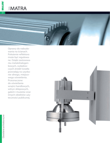 Seria MATRA 226 Oświetlenie architektoniczne Oprawy do nabudowania na ścianach. Położenie reflektora może być regulowane. Dzięki zastosowaniu metalohalogenkowych, wyładowczych źródeł światła pozwalają na uzyskanie silnego, miejscowego oświetlenia. Przeznaczone do oświetlania wnętrz handlowych, witryn sklepowych, galerii i muzeów oraz innych obiektów użyteczności publicznej. 1. Oświetlenie architektoniczne • wnętrzowe 227 1.8. Oprawy ścienne • nabudowane Rodzaj materiału: obudowa – stal reflektor – stop aluminium odbłyśnik – aluminium klosz/dyfuzor – szkło Współczynnik mocy biernej: cosφ ≥ 0,85 Rodzaj zapłonu: indukcyjny 1m G12 IP 20 2.5mm2 70W 150W 70W 150W 4,62kg 5,47kg 5,20kg 5,85kg MATRA 10 Nr art. Oprawa ścienna, ruchoma Moc Kolor Cena netto PLN OS-MAT107-73 1 x 70W srebrny 485,00 OS-MAT115-73 1 x 150W srebrny 543,00 Moc Kolor Cena netto PLN Model Indeks 0646 MATRA 10 0647 MATRA 10 MATRA 20 Nr art. Oprawa ścienna, ruchoma Model Indeks 0648 MATRA 20 OS-MAT207-73 1 x 70W srebrny 515,00 0649 MATRA 20 OS-MAT215-73 1 x 150W srebrny 574,00 Oświetlenie architektoniczne ~230V MH-12