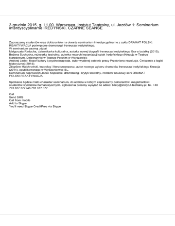 3 grudnia 2015, g. 11.00, Warszawa, Instytut Teatralny, ul. Jazdów 1: Seminarium interdyscyplinarne IREDYŃSKI. CZARNE SEANSE Zapraszamy studentów oraz doktorantów na otwarte seminarium interdyscyplinarne z cyklu DRAMAT POLSKI. REAKTYWACJA poświęcone dramaturgii Ireneusza Iredyńskiego. W seminarium wezmą udział: Małgorzata Raducha, dziennikarka kulturalna, autorka nowej biografii Ireneusza Iredyńskiego Gra w butelkę (2015); Bożena Suchocka, reżyserka teatralna, autorka nowych inscenizacji sztuk Iredyńskiego (Kreacja w Teatrze Narodowym, Dziewczynki w Teatrze Polskim w Warszawie); Andrzej Leder, filozof kultury i psychoterapeuta, autor wydanej ostatnio pracy Prześniona rewolucja. Ćwiczenie z logiki historycznej (2014); Zbigniew Majchrowski, teatrolog i literaturoznawca, autor nowego wyboru dramatów Ireneusza Iredyńskiego Kreacja (2014), opublikowanego w Wydawnictwie IBL. Seminarium poprowadzi Jacek Kopciński, dramatolog i krytyk teatralny, redaktor naukowy serii DRAMAT POLSKI.REAKTYWACJA. Spotkanie będzie miało charakter seminarium, do udziału w którym zapraszamy doktorantów, magistrantów i studentów wydziałów humanistycznych. Zgłoszenia prosimy wysyłać na adres: [email protected], tel. +48 791 877 377+48 791 877 377. Call Send SMS Call from mobile Add to Skype You'll need Skype CreditFree via Skype