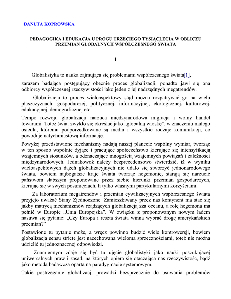 DANUTA KOPROWSKA PEDAGOGIKA I EDUKACJA U PROGU TRZECIEGO TYSIĄCLECIA W OBLICZU PRZEMIAN GLOBALNYCH WSPÓŁCZESNEGO ŚWIATA 1 Globalistyka to nauka zajmująca się problemami współczesnego świata[1], zarazem badająca postępujący obecnie proces globalizacji, ponadto jawi się ona odbiorcy współczesnej rzeczywistości jako jeden z jej nadrzędnych megatrendów. Globalizacja to proces wieloaspektowy stąd można rozpatrywać go na wielu płaszczyznach: gospodarczej, politycznej, informacyjnej, ekologicznej, kulturowej, edukacyjnej, demograficznej etc. Tempo rozwoju globalizacji narzuca międzynarodowa migracja i wolny handel towarami. Toteż świat zwykło się określać jako „globalną wioskę”, w znaczeniu małego osiedla, któremu podporządkowane są media i wszystkie rodzaje komunikacji, co powoduje natychmiastową informację. Powyżej przedstawione mechanizmy nadają naszej planecie wspólny wymiar, tworząc w ten sposób wspólnie żyjące i pracujące społeczeństwo kierujące się intensyfikacją wzajemnych stosunków, a odznaczające mnogością wzajemnych powiązań i zależności międzynarodowych. Jednakowoż należy bezprecedensowo stwierdzić, iż w wyniku wieloaspektowych dążeń globalizacyjnych nie udało się stworzyć jednonarodowego świata, bowiem najbogatsze kraje świata tworząc hegemonię, starają się narzucić państwom słabszym proponowane przez siebie kierunki przemian gospodarczych, kierując się w swych posunięciach, li tylko własnymi partykularnymi korzyściami. Za laboratorium megatrendów i przemian cywilizacyjnych współczesnego świata przyjęto uważać Stany Zjednoczone. Zamieszkiwany przez nas kontynent ma stać się jakby matrycą mechanizmów rządzących globalizacją zza oceanu, a rolę hegemona ma pełnić w Europie „Unia Europejska”. W związku z proponowanym nowym ładem nasuwa się pytanie: „Czy Europa i reszta świata winna wybrać drogę amerykańskich przemian?” Postawione tu pytanie może, a wręcz powinno budzić wiele kontrowersji, bowiem globalizacja sensu stricte jest nacechowana wieloma sprzecznościami, toteż nie można udzielić tu jednoznacznej odpowiedzi. Znamiennym zdaje się być tu ujęcie globalistyki jako nauki poszukującej uniwersalnych praw i zasad, na których opiera się otaczająca nas rzeczywistość, bądź jako metoda badawcza oparta na paradygmacie systemowym. Takie postrzeganie globalizacji prowadzi bezsprzecznie do usuwania problemów globalnych poprzez: 1) rozpoznanie natury sprzeczności, 2) zrównoważenie sprzeczności, 3) asymetryczne uspójnienie, 4) transfer zrównoważonej i asymetrycznie uspójnionej sprzeczności w kierunku nadwyżki i redukcji sensu.[2] 2 Jak zmienne mogą okazać się koleje globalnego społeczeństwa, ze względu na miejsce, które zajmują w nim sprzeczności określa konkluzja J. Gniteckiego, który stwierdza: Nie rozpoznane i w porę nie zrównoważone sprzeczności stają się zagrożeniem dla całej ludzkości. Z kolei rozpoznane i w porę zrównoważone sprzeczności stają się szansą dla całej ludzkości na rozwój wzwyż i przekraczanie górnych możliwości przez każdego człowieka.[3] Zastosowanie uniwersalnych praw i zasad w rozwiązywaniu globalnych problemów współczesnego świata oddaje strukturę współczesnej globalistyki: a) rozpoznawanie problemów globalnych, b) rozumienie sensu i znaczenia problemów globalnych, c) rozpoznawanie problemów globalnych w oparciu o uniwersalne prawa i zasady. Obok pojęcia globalistyka plasuje się pojęcie globalizm będący nowym nurtem refleksji filozoficznej nad edukacją.[4] Współcześni globaliści starają się określić podstawowe problemy edukacji globalnej wnikając w nią in medias res, by jednak owe zamierzenia można zrealizować, należałoby wyszczególnić cechy osobowości uniwersalistycznie jawiącego się człowieka. Z. Melosik twierdzi, iż: 1) respektuje [on] idee pluralizmu kulturowego, 2) posługuje się dialogiem w relacjach społecznych, 3) zwalcza technokratyzm i konsumeryzm, 4) posiada zdolności antycypacyjne postrzegania rozwoju świata, 5) dysponuje umiejętnością alternatywnego prognozowania procesów globalnych, 6) posiada gotowość do działań dynamicznych i myślenia w konwencji systemowej, 7) potwierdza zgodność własnej tożsamości z problemami świata i posiadaniem autentycznych dyspozycji do współdziałania w jego doskonaleniu.[5] J. Gnitecki z kolei prezentuje osiem etapów rozwoju refleksji pedagogicznej: 1) etap refleksji oparty na mądrości wychowania, 2) etap pajdagogiki, 3) 4) 5) etap pedagogiki inspirowanej myślą filozoficzną, psychologiczną, socjologiczną itp., etap pedagogiki „czystej” nawiązującej do myśli fenomenologicznej, etap rozwoju pedagogiki, w której inspirowana jest ona i jednocześnie inspiruje odnośne nauki humanistyczne, 3 6) etap pedagogiki uniwersalistycznej, 7) etap pedagogiki transcedentalnej, 8) etap pedagogiki transcendentalno – uniwersalistycznej.[6] W pięciu wyżej wymienionych etapach refleksji pedagogicznej realizm zastąpiono idealizmem, toteż proces wychowania nie spełniał zamierzonego celu, a wiedza z niego emanująca była nacechowana ortodoksyjnością w wymiarze heterodoksji bądź heterogeniczności. Zaistniały stan oświaty, a ukazany w szkieletowym zarysie powyżej, prowadził do regresji edukacyjnej na gruncie rodzimym i globalnym zarazem, co bez wątpienia miało wpływ na rodzącą się patologię edukacyjną. Aby, więc ów niekorzystny stan zmienić należy dokonać przełomu formacyjnego w tworzeniu wiedzy o procesie wychowawczym, popierając ją refleksją pedagogiczną, a wtedy uzyskamy wzorzec modelu procesu wychowawczego. Warunkiem sine qua non w kształtowaniu nowego typu wiedzy o edukacji w przestrzeni edukacyjnej są: ambiwalencja, idiosynkrazja, decentracja i uwiedzenie. Z kolei,[7] łączne zrównoważenie asymetryczne, uspójnienie, transfer i partycypacja to kategorie w