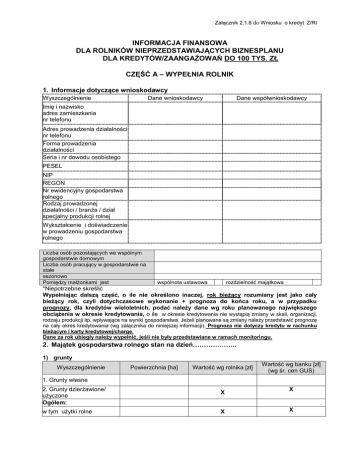 Załącznik 2.1.8 do Wniosku o kredyt Z/RI INFORMACJA FINANSOWA DLA ROLNIKÓW NIEPRZEDSTAWIAJĄCYCH BIZNESPLANU DLA KREDYTÓW/ZAANGAŻOWAŃ DO 100 TYS. ZŁ CZĘŚĆ A – WYPEŁNIA ROLNIK 1. Informacje dotyczące wnioskodawcy Wyszczególnienie Dane współwnioskodawcy Dane wnioskodawcy Imię i nazwisko adres zamieszkania nr telefonu Adres prowadzenia działalności nr telefonu Forma prowadzenia działalności Seria i nr dowodu osobistego PESEL NIP REGON Nr ewidencyjny gospodarstwa rolnego Rodzaj prowadzonej działalności / branża / dział specjalny produkcji rolnej Wykształcenie i doświadczenie w prowadzeniu gospodarstwa rolnego Liczba osób pozostających we wspólnym gospodarstwie domowym Liczba osób pracujący w gospodarstwie na stałe sezonowo Pomiędzy małżonkami jest wspólnota ustawowa rozdzielność majątkowa *Niepotrzebne skreślić Wypełniając dalszą część, o ile nie określono inaczej, rok bieżący rozumiany jest jako cały bieżący rok, czyli dotychczasowe wykonanie + prognoza do końca roku, a w przypadku prognozy, dla kredytów wieloletnich, podać należy dane wg roku planowanego największego obciążenia w okresie kredytowania, o ile w okresie kredytowania nie wystąpią zmiany w skali, organizacji, rodzaju produkcji itp. wpływające na wyniki gospodarstwa. Jeżeli planowane są zmiany należy przedstawić prognozę na cały okres kredytowania (wg załącznika do niniejszej informacji). Prognoza nie dotyczy kredytu w rachunku bieżącym i karty kredytowej/charge. Dane za rok ubiegły należy wypełnić, jeśli nie były przedstawiane w ramach monitoringu. 2. Majątek gospodarstwa rolnego stan na dzień……………….. 1) grunty Wyszczególnienie Powierzchnia [ha] Wartość wg rolnika [zł] Wartość wg banku [zł] (wg śr. cen GUS) 1. Grunty własne 2. Grunty dzierżawione/ użyczone Ogółem: w tym użytki rolne X X X X 2) budynki i maszyny Wartość w zł (podać wg czego określono wartość np. wg polisy, rzeczoznawcy itp.) Wyszczególnienie Budynki w tym mieszkalny: Maszyny i urządzenia w tym samochód/-chody osobowe: 3) inwentarz żywy Wyszczególnienie ( wymienić zwierzęta wg rodzajów) Rok bieżący Ilość (w szt.) Wartość w zł Prognoza na okres kredytowania Ilość (w szt.) Wartość w zł Stado podstawowe: ………………………………….. ………………………………….. ………………………………….. Stado obrotowe: …………………………………. …………………………………. …………………………………. Razem X 4) pozostały majątek ( wymienić rodzaj i wartość) Wyszczególnienie Należności z tytułu dopłat bezpośrednich Zapasy* :…………………………………………..... ………………………………………………………… …………………………………………………………. Produkcja roślinna w toku Gotówka Lokaty Inne ( w tym majątek niezwiązany z gospodarstwem rolnym) Wartość w zł +ewentualny komentarz *wyszczególnić czego dotyczą 5) informacja o zobowiązaniach Zadłużenie z tytułu zaciągniętych kredytów, pożyczek, przyznanych limitów, kart kredytowych, udzielonych poręczeń w innych bankach nie posiadam/y zobowiązań w innych bankach nazwa instytucji finansującej rodzaj zobowiązania Posiadam/y zobowiązania w kwocie ogółem: Udzieliliśmy poręczeń kwocie ogółem: ZOBOWIĄZANIA WŁASNE kwota i waluta wg umowy aktualna kwota pozostająca do spłaty 2 okres kredytowania od…do ………………………..zł ………………………..zł miesięczna rata rodzaj zabezpieczenia UDZIELONE PORĘCZENIA 3. Planowane przedsięwzięcie inwestycyjne Dla kredytów unijnych Elementy inwestycji RAZEM Udział % Koszt całkowity inwestycji 1 brutto/netto Środki własne Kredyt/Kredyt Koszty unijny kwalifikowane Dotacja Termin realizacji 100% Zaawansowanie na dzień …………………. …………………………..zł…………………% 4. Prowadzona produkcja 1) produkcja roślinna i zwierzęca Dane za rok bieżący Dane za ostatni zakończony rok Obszar uprawy (ha)/ilość sprzedanych szt. zwierząt/posiadanych krów mlecznych Ilość sprzedanyc h ton/litrów /kg żywca Średnia cena zł/t, l, kg Przychód zł/tys. zl2 Obszar uprawy (ha)/ilość sprzedanych szt. zwierząt/ posiadanych krów mlecznych np. pszenica 10 ha 40 t 800 zł/t 32000 zł 8 ha np. krowy 10 szt. 7500 l 1,40 zł/l 10500 zł 12 szt. Rodzaj produkcji roślinnej i zwierzęcej np. pszenica, ziemniaki, tuczniki, prosięta, krowy 1 Niepotrzebne skreślić, wartość netto dla płatników podatku VAT, wartość brutto dla pozostałych podmiotów. 3 2) przychody i koszty Wyszczególnienie Rok ubiegły zł/tys. zł2 Rok bieżący zł/tys. zł2 Prognoza na okres kredytowania zł/tys. zł23 Przychody ogółem Przychody z tytułu produkcji roślinnej Przychody z tytułu produkcji zwierzęcej Przychody z tytułu dopłat bezpośrednich i innych dopłat 4. Pozostałe przychody z tytułu………………………………… B. Koszty uzyskania przychodu 1) zakup pasz 2) zakup zwierząt 3) opieka weterynaryjna 4) zakup materiału siewnego 5) zakup nawozu 6) zakup środków ochrony roślin 7) zakup paliwa 8) zakup usług produkcyjnych 9) czynsze dzierżawne 10) składka KRUS/ZUS 11) płace i ZUS 12) podatek rolny 13) inne podatki 14) ubezpieczenia 15) energia elektryczna 16) zakup opału 17) odsetki od kredytów 18) inne koszty C. Wynik na działalności / Dochód brutto (A-B) D. Dochody spoza gospodarstwa Koszty utrzymania rodziny …….. osób E. Raty kredytów inwestycyjnych KOMENTARZ WNIOSKODAWCY NT. SYTUACJI EKONOMICZNO-FINANSOWEJ GOSPODARSTWA OSIĄGNIĘTEGO WYNIKU FINANSOWEGO (INFORMACJA PODAWANA FAKULTATYWNIE) A. 1. 2. 3. ROLNEGO, Bank Spółdzielczy w ………. (dalej bank) zgodnie z art. 24 ust. 1 Ustawy z dnia 29 sierpnia 1997 r. o ochronie danych osobowych (j. t. Dz. U. z 2002 r., nr 101, poz. 926, z późn. zm.) informuje, iż j