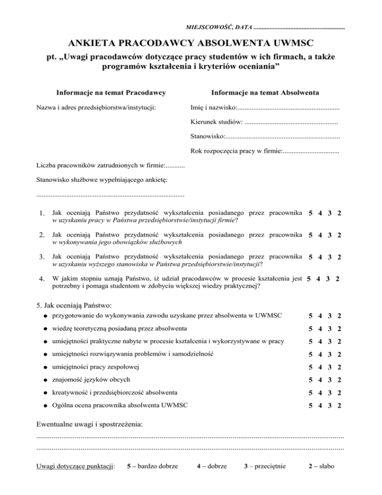 MIEJSCOWOŚĆ, DATA ......................................................... ANKIETA PRACODAWCY ABSOLWENTA UWMSC pt. „Uwagi pracodawców dotyczące pracy studentów w ich firmach, a także programów kształcenia i kryteriów oceniania” Informacje na temat Pracodawcy Nazwa i adres przedsiębiorstwa/instytucji: Informacje na temat Absolwenta Imię i nazwisko:.......................................................... Kierunek studiów: ..................................................... Stanowisko:................................................................. Rok rozpoczęcia pracy w firmie:................................ Liczba pracowników zatrudnionych w firmie:........... Stanowisko służbowe wypełniającego ankietę: .................................................................................... 1. Jak oceniają Państwo przydatność wykształcenia posiadanego przez pracownika 5 4 3 2 w uzyskaniu pracy w Państwa przedsiębiorstwie/instytucji firmie? 2. Jak oceniają Państwo przydatność wykształcenia posiadanego przez pracownika 5 4 3 2 w wykonywania jego obowiązków służbowych 3. Jak oceniają Państwo przydatność wykształcenia posiadanego przez pracownika 5 4 3 2 w uzyskaniu wyższego stanowiska w Państwa przedsiębiorstwie/instytucji? 4. W jakim stopniu uznają Państwo, iż udział pracodawców w procesie kształcenia jest 5 4 3 2 potrzebny i pomaga studentom w zdobyciu większej wiedzy praktycznej? 5. Jak oceniają Państwo: ● przygotowanie do wykonywania zawodu uzyskane przez absolwenta w UWMSC 5 4 3 2 ● wiedzę teoretyczną posiadaną przez absolwenta 5 4 3 2 ● umiejętności praktyczne nabyte w procesie kształcenia i wykorzystywane w pracy 5 4 3 2 ● umiejętności rozwiązywania problemów i samodzielność 5 4 3 2 ● umiejętności pracy zespołowej 5 4 3 2 ● znajomość języków obcych 5 4 3 2 ● kreatywność i przedsiębiorczość absolwenta 5 4 3 2 ● Ogólna ocena pracownika absolwenta UWMSC 5 4 3 2 Ewentualne uwagi i spostrzeżenia: ................................................................................................................................................................ ................................................................................................................................................................ Uwagi dotyczące punktacji: 5 – bardzo dobrze 4 – dobrze 3 – przeciętnie 2 – słabo
