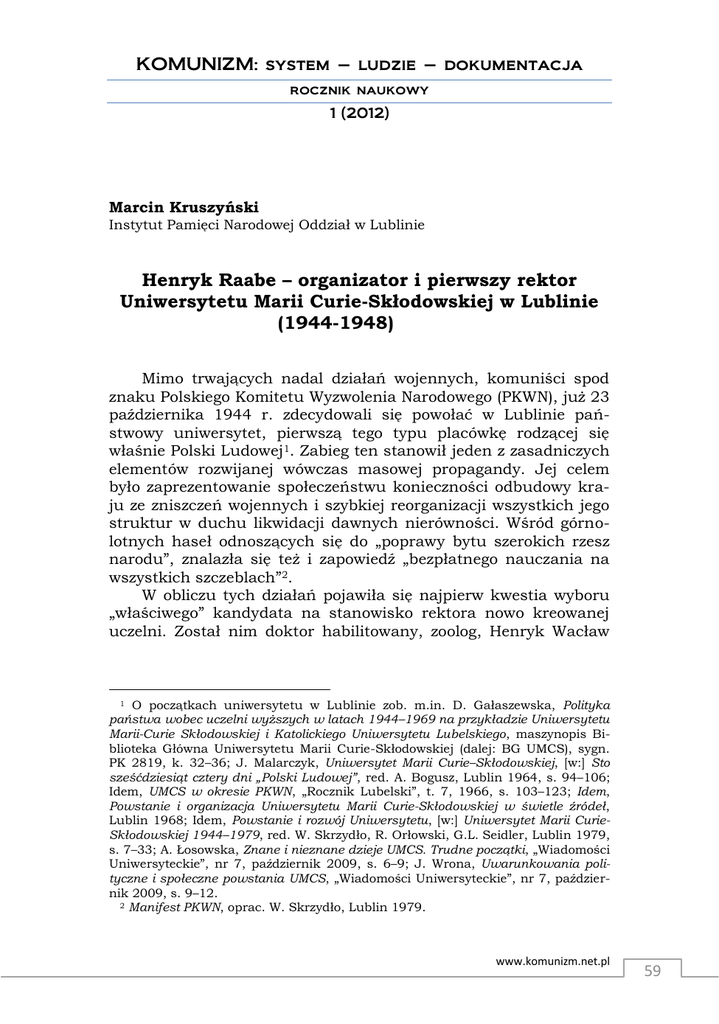 KOMUNIZM: system – ludzie – dokumentacja rocznik naukowy 1 (2012) Marcin Kruszyński Instytut Pamięci Narodowej Oddział w Lublinie Henryk Raabe – organizator i pierwszy rektor Uniwersytetu Marii Curie-Skłodowskiej w Lublinie (1944-1948) Mimo trwających nadal działań wojennych, komuniści spod znaku Polskiego Komitetu Wyzwolenia Narodowego (PKWN), już 23 października 1944 r. zdecydowali się powołać w Lublinie państwowy uniwersytet, pierwszą tego typu placówkę rodzącej się właśnie Polski Ludowej1. Zabieg ten stanowił jeden z zasadniczych elementów rozwijanej wówczas masowej propagandy. Jej celem było zaprezentowanie społeczeństwu konieczności odbudowy kraju ze zniszczeń wojennych i szybkiej reorganizacji wszystkich jego struktur w duchu likwidacji dawnych nierówności. Wśród górnolotnych haseł odnoszących się do „poprawy bytu szerokich rzesz narodu”, znalazła się też i zapowiedź „bezpłatnego nauczania na wszystkich szczeblach”2. W obliczu tych działań pojawiła się najpierw kwestia wyboru „właściwego” kandydata na stanowisko rektora nowo kreowanej uczelni. Został nim doktor habilitowany, zoolog, Henryk Wacław 1 O początkach uniwersytetu w Lublinie zob. m.in. D. Gałaszewska, Polityka państwa wobec uczelni wyższych w latach 1944–1969 na przykładzie Uniwersytetu Marii-Curie Skłodowskiej i Katolickiego Uniwersytetu Lubelskiego, maszynopis Biblioteka Główna Uniwersytetu Marii Curie-Skłodowskiej (dalej: BG UMCS), sygn. PK 2819, k. 32–36; J. Malarczyk, Uniwersytet Marii Curie–Skłodowskiej, [w:] Sto sześćdziesiąt cztery dni „Polski Ludowej”, red. A. Bogusz, Lublin 1964, s. 94–106; Idem, UMCS w okresie PKWN, „Rocznik Lubelski”, t. 7, 1966, s. 103–123; Idem, Powstanie i organizacja Uniwersytetu Marii Curie-Skłodowskiej w świetle źródeł, Lublin 1968; Idem, Powstanie i rozwój Uniwersytetu, [w:] Uniwersytet Marii CurieSkłodowskiej 1944–1979, red. W. Skrzydło, R. Orłowski, G.L. Seidler, Lublin 1979, s. 7–33; A. Łosowska, Znane i nieznane dzieje UMCS. Trudne początki, „Wiadomości Uniwersyteckie”, nr 7, październik 2009, s. 6–9; J. Wrona, Uwarunkowania polityczne i społeczne powstania UMCS, „Wiadomości Uniwersyteckie”, nr 7, październik 2009, s. 9–12. 2 Manifest PKWN, oprac. W. Skrzydło, Lublin 1979. www.komunizm.net.pl 59 Marcin KruszyŃski Raabe3. Postać przedwojennego socjalisty, człowieka lewicy, lecz nie członka Polskiej Partii Robotniczej (PPR), naukowca o poglądach zdecydowanie materialistycznych 4, czy wreszcie badacza dyskryminowanego w okresie dwudziestolecia międzywojennego za swoje przekonania, spełniała wszelkie kryteria stawiane przez ówczesne władze. Osoba z taką przeszłością, po pierwsze bowiem potwierdzała „polityczną otwartość” idących za Armią Czerwoną działaczy komunistycznych. Po drugie zaś, nie mniej ważne, stanowiła bezpośredni dowód na to, jak można wykorzystać szansę na realizację wreszcie kariery zawodowej i własnych ambicji. Wszystko to dzięki, rzecz jasna, nowym gospodarzom Polski. Raabe więc, może jak nikt inny wtedy, świetnie nadawał się by zostać „twarzą oświaty”. Dodajmy, tej lepszej oświaty, z dominującą marksistowską orientacją metodologiczną, w państwie, w którym zadba się w końcu o wyrównanie szans edukacyjnych. Pytanie tylko czy on sam był tego do końca świadom. Celem niniejszego tekstu będzie przedstawienie głównym kierunków działań rektora Raabego z lat 1944–1948, tj. w okresie kiedy przewodził on uniwersytetowi. A zadania jakie przed nim stanęły, nie należały do najłatwiejszych. Nie ma dzisiaj wszak wątpliwości, że uczelnia powstała – i nie będzie w tym sformułowaniu nadmiernej przesady – właściwie od podstaw. Stąd, wydaje mi się, iż w pełni uzasadniony był tutaj wybór jej patrona. Chociaż pojawiały się pomysły, by placówce nadać imię m.in. Mikołaja Kopernika lub PKWN-u, to przeważyła jednak „kandydatura” Marii Curie-Skłodowskiej5, której pierwsze laboratorium mieściło się przecież w lichej szopie z przeciekającym dachem 6. Przechodząc teraz do analizy właściwego tematu moich rozważań, rozpocząć ją wypada najpierw od kilku uwag natury ogólnej. 3 O nim zob.: G. Brzęk, Henryk Raabe 1882–1951, Lublin 1983; Idem, Raabe Henryk Wacław, Polski Słownik Biograficzny, t. XXIX/3, z. 122, Wrocław 1986, s. 533–535; M. Wawer, Henryk Raabe, [w:] Słownik biograficzny miasta Lublina, red. T. Radzik, J. Skarbek, A. A. Witusik, t. I, Lublin 1993, s. 223–224; L. Maliszewski, Rectoribus Universitatis Mariae Curie-Skłodowska in Memoriam, Lublin 2011, s. 15–37. 4 W pierwszych latach po śmierci Raabego, pisząc o nim, głównie ten właśnie fakt podkreślano. J. Wolska, Henryk Raabe i jego działalność naukowa, [w:] Księga pamiątkowa dziesięciolecia Uniwersytetu Marii Curie – Skłodowskiej w Lublinie 1944–1954, Lublin 1955, s. 33–48. 5 O tym więcej zob.: M. Kruszyński, Maria Curie-Skłodowska i uniwersytet jej imienia – Lublin, rok 1944, „Annales UMCS”, vol. LXVI, z. 1, sec. F, Lublin 2011, s. 139–146. 6 O. Wołczek, Maria Skłodowska-Curie, Warszawa 1985, s. 26. 60 www.komunizm.net.pl Henryk Raabe – organizator i pierwszy rektor UMCS Po pierwsze, działaniom Raabego towarzyszyła niechęć mieszkańców Lublina, a przynajmniej większości z nich7. I nie chodzi tutaj wyłącznie o to, iż generalnie z nieufnością odnoszono się do przedstawicieli nowego rządu8. W Lublinie funkcjonowała już jedna uczelnia – Katolicki Uniwersytet Lubelski (KUL) i dla dużej części Lublinian, Uniwersytet Marii Curie-Skłodowskiej (UMCS), miał być jej ideologicznym konkurentem i ideologiczną przeciwwagą. Wszystkich celów powołania UMCS nie da się ująć w jednym zdaniu, ale na pewno powyższy pogląd streszczał intencje członków PKWN9. Działo się tak, mimo iż sam Raabe od początku widział „swój un