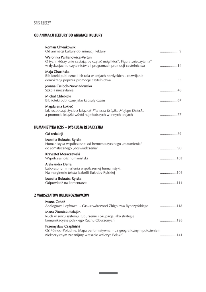 SPIS RZECZY OD ANIMACJI LEKTURY DO ANIMACJI KULTURY Roman Chymkowski Od animacji kultury do animacji lektury .................. 9 Weronika Parfianowicz-Vertun O tych, którzy „nie czytają, by czytać mógł ktoś”. Figura „nieczytania” w dyskusjach o czytelnictwie i programach promocji czytelnictwa ..................14 Maja Chacińska Biblioteki publiczne i ich rola w krajach nordyckich – rozwijanie demokracji poprzez promocję czytelnictwa ..................33 Joanna Cieloch-Niewiadomska Szkoła nieczytania ..................48 Michał Chlebicki Biblioteki publiczne jako kapsuły czasu ..................67 Magdalena Łokieć Jak rozpocząć życie z książką? Pierwsza Książka Mojego Dziecka a promocja książki wśród najmłodszych w innych krajach ..................77 HUMANISTYKA DZIŚ – DYSKUSJA REDAKCYJNA Od redakcji ..................89 Izabella Bukraba-Rylska Humanistyka współczesna: od hermeneutycznego „rozumienia” do somatycznego „doświadczenia” ..................90 Krzysztof Moraczewski Współczesność humanistyki .................103 Aleksandra Derra Laboratorium myślenia współczesnej humanistyki. Na marginesie tekstu Izabelli Bukraby-Rylskiej .................108 Izabella Bukraba-Rylska Odpowiedź na komentarze .................114 Z WARSZTATÓW KULTUROZNAWCÓW Iwona Gródź Analogowe i cyfrowe… Casus twórczości Zbigniewa Rybczyńskiego .................118 Marta Zimniak-Hałajko Ruch w sercu systemu. Oburzenie i okupacja jako strategie komunikacyjne polskiego Ruchu Oburzonych .................126 Przemysław Czapliński Oś Północ–Południe. Mapa performatywna – „z geograficznym położeniem niekorzystnym zacznijmy wreszcie walczyć Polski” .................141 OMÓWIENIA Piotr Grochowski W poszukiwaniu internetowego dowcipu .................162 Marek Wołyński Łącząc naukę ze sztuką .................167 Piotr Zańko Recenzja książek Raperzy kontra filomaci i Antologia Polskiego Rapu .................174 Paweł Konar Trudne o hip-hopie pisanie .................180 CONTENS FROM ANIMATION OF READING TO ANIMATION OF CULTURE Roman Chymkowski From animation of reading to animation of culture ................... 9 Weronika Parfianowicz-Vertun About those who “do not read so that others could”. “Non-reading” discourse in discussions regarding the readership and the programmes, the aim of which is to promote reading. ...................14 Maja Chacińska Nordic States and their Public Libraries – Good Practice in Readership Building ...................33 Joanna Cieloch-Niewiadomska Non-reading School ...................48 Michał Chlebicki Public Libraries – Capsules of Time ...................67 Magdalena Łokieć How can one begin his life with a book? The First Book For My Child – promotion of books among the youngest in other countries” ...................77 HUMANITIES TODAY – DISCUSSION OF THE EDITING TEAM From editorial office ...................89 Izabella Bukraba-Rylska Contemporary humanities: from hermeneutic “understanding” to somatic “experiencing” ...................90 Krzysztof Moraczewski Contemporary humanities .................103 Aleksandra Derra Laboratory of thought of the contemporary humanities. Referring to the articlee by Izabella Bukraba-Rylska .................188 Izabela Bukraba-Rylska Response to the comments .................114 CULTURAL STUDIES WORSHOPS Iwona Gródź Analog and digital – Case of art by Zbigniew Rybczynski .................118 Marta Zimniak-Hałajko Movement – in the heart of the system. Occupation and outrage - communication strategies of the Polish Movement of the Outraged. .................126 Przemysław Czapliński North-South Axis. Performative map with an “unbeneficial geographical location of the ‘let’s start the fight’ Poland” .................141 EXPLANATIONS Piotr Grochowski Internet memes as a key to understand the cyber-culture .................162 Marek Wołyński Connecting science and art. Book Review – Patricia Leavy’s Method Meets Art: Art-Based Research Practice .................167 Piotr Zańko Book Reviews: Raperzy kontra filomaci [Rappers vs. Filomates] and Antologia Polskiego Rapu [Anthology of the Polish Rap] .................174 Paweł Konar Tough hip-hop tales .................180