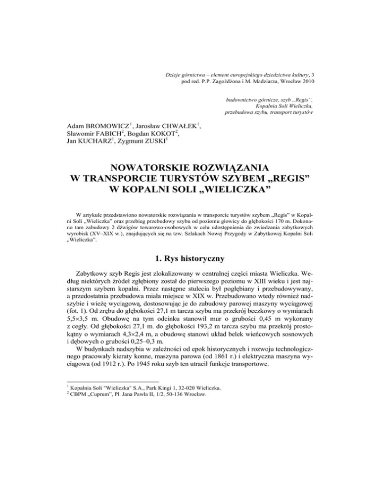 Dzieje górnictwa – element europejskiego dziedzictwa kultury, 3 pod red. P.P. Zagożdżona i M. Madziarza, Wrocław 2010 budownictwo górnicze, szyb „Regis”, Kopalnia Soli Wieliczka, przebudowa szybu, transport turystów Adam BROMOWICZ 1 , Jarosław CHWAŁEK1, Sławomir FABICH2, Bogdan KOKOT2, Jan KUCHARZ1, Zygmunt ZUSKI1 NOWATORSKIE ROZWIĄZANIA W TRANSPORCIE TURYSTÓW SZYBEM „REGIS” W KOPALNI SOLI „WIELICZKA” W artykule przedstawiono nowatorskie rozwiązania w transporcie turystów szybem „Regis” w Kopalni Soli „Wieliczka” oraz przebieg przebudowy szybu od poziomu głowicy do głębokości 170 m. Dokonano tam zabudowy 2 dźwigów towarowo-osobowych w celu udostępnienia do zwiedzania zabytkowych wyrobisk (XV–XIX w.), znajdujących się na tzw. Szlakach Nowej Przygody w Zabytkowej Kopalni Soli „Wieliczka”. 1. Rys historyczny Zabytkowy szyb Regis jest zlokalizowany w centralnej części miasta Wieliczka. Według niektórych źródeł zgłębiony został do pierwszego poziomu w XIII wieku i jest najstarszym szybem kopalni. Przez następne stulecia był pogłębiany i przebudowywany, a przedostatnia przebudowa miała miejsce w XIX w. Przebudowano wtedy również nadszybie i wieżę wyciągową, dostosowując je do zabudowy parowej maszyny wyciągowej (fot. 1). Od zrębu do głębokości 27,1 m tarcza szybu ma przekrój beczkowy o wymiarach 5,5×3,5 m. Obudowę na tym odcinku stanowił mur o grubości 0,45 m wykonany z cegły. Od głębokości 27,1 m. do głębokości 193,2 m tarcza szybu ma przekrój prostokątny o wymiarach 4,3×2,4 m, a obudowę stanowi układ belek wieńcowych sosnowych i dębowych o grubości 0,25–0,3 m. W budynkach nadszybia w zależności od epok historycznych i rozwoju technologicznego pracowały kieraty konne, maszyna parowa (od 1861 r.) i elektryczna maszyna wyciągowa (od 1912 r.). Po 1945 roku szyb ten utracił funkcje transportowe. 1 2 Kopalnia Soli "Wieliczka" S.A., Park Kingi 1, 32-020 Wieliczka. CBPM „Cuprum”, Pl. Jana Pawła II, 1/2, 50-136 Wrocław. Nowatorskie rozwiązania w transporcie turystów szybem „Regis” w Kopalni Soli „Wieliczka” 31 Z uwagi na bardzo zły stan obudowy szybu w latach 90. XX w., podjęte zostały starania dla rozpoczęcia jego przebudowy. Fot. 1. Nadszybie szybu „Regis” od strony wschodniej (widok po roku 1945). Photo. 1. „Regis” shaft top from E (after 1945) 2. Informacja o projekcie „Szlaki Nowej Przygody w Zabytkowej Kopalni Soli „Wieliczka”, w ramach którego będą realizowana prace adaptacyjne w szybie Regis Kopalnia Soli Wieliczka od 2004 roku prowadziła starania w celu pozyskania środków unijnych na zakończenie prac umożliwiających przywrócenie szybu Regis do ruchu – tym razem już tylko turystycznego. W 2009 roku kopalnia podpisała z Polską Organizacją Turystyki pre-umowę na sfinansowanie tego projektu w ramach Działania 6.4 Programu Operacyjnego Innowacyjna Gospodarka. Projekt ten pozwoli przybliżyć turystom historię kopalni w pierwszych wiekach jej istnienia oraz metody eksploatacji złoża solnego, a także sposoby zabezpieczania komór, odwadniania wyrobisk, wentylacji i oświetlenia podziemi. Umożliwi przedstawienie zwiedzającym unikatowej budowy geologicznej wielickiego złoża. Odwiedzający będą mogli się poczuć się jak współcześni eksploratorzy, którzy wyposażeni w lampy górnicze, kaski oraz pochłaniacze, będą poznawali tajniki przyrody, geologii i technik górniczych. Projekt wygeneruje konkurencyjny, innowacyjny, ponadregionalny produkt turystyczny – atrakcyjnie przedstawioną, unikalną trasę geoturystyczną, która równocześnie będzie bezpieczna dla turystów i środowiska naturalnego. 32 A. BROMOWICZ, J. CHWAŁEK, S. FABICH, B. KOKOT, J. KUCHARZ, Z. ZUSKI Szczególnym walorem nowego produktu będzie jego usytuowanie w zabytkowych wnętrzach Kopalni Soli „Wieliczka”, wpisanej na listę Światowego Dziedzictwa Kulturowego i Naturalnego UNESCO oraz uznanej przez Prezydenta RP za Pomnik Historii, a także w szybie Regis mającym średniowieczne założeniach. Ponadto turyści będą mogli zwiedzać wyrobiska górnicze zachowane w stanie pierwotnym. Po zakończeniu planowanych prac zabezpieczających zaistnieje możliwość udostępnienia ok. 12 komór zlokalizowanych na poziomach I i II, 10 ciągów wyrobisk chodnikowych na poziomach I–III i szybika międzypoziomowego. Prace te, w połączeniu z uruchomieniem urządzenia wyciągowego w szybie Regis, wpłyną na poprawę bezpieczeństwa ruchu zakładu górniczego, jak również zapewnią możliwość prowadzenia ruchu turystycznego w przypadku awarii czy remontu szybów Kinga i Daniłowicz, w których obecnie są zainstalowane ekspoatowane już od dziesięcioleci urządzenia wyciągowe. 3. Wykonany zakres przebudowy szybu Przebudowę szybu Regis rozpoczęto w roku 1995, po opracowaniu niezbędnych dokumentacji i uzyskaniu stosownych pozwoleń na budowę od organów nadzoru górniczego i budowlanego oraz konserwatora zabytków. W pierwszej kolejności wykonane zostały prace przygotowawcze, związane z organizacją i uzbrojeniem placu budowy oraz wykonaniem głowicy szybowej, stanowiącej jednocześnie fundament dla trzonu prowadniczego wieży wyciągowej. Wykonawcą robót była PeBeKa Lubin – specjalistyczna firma górnicza posiadająca duże doświadczenie w budownictwie szybowym, natomiast generalnym projektantem przebudowy szybu był KGHM CUPRUM sp. z o.o. CBR we Wrocławiu. 3.1. Przebudowa głowicy szybowej Głowicę szybu wykonano jako konstrukcję żelbetową o średnicy wewnętrznej 5,0 m i wysokości 8,2 m. W trakcie wykonania głowicy wykonano również wloty do kanału wentylacyjnego i kanału grzewczego oraz kanały dla kabli energetycznych i rurociągu odwadniającego. Kanały wykonano w obudowie żelbetowej z hydroizolacją z folii „SIKAPLAN 9–V Tunel”. Po wykonaniu głowicy szybowej posadowiono na niej wieżę tymczasowego wyciągu kubłowego