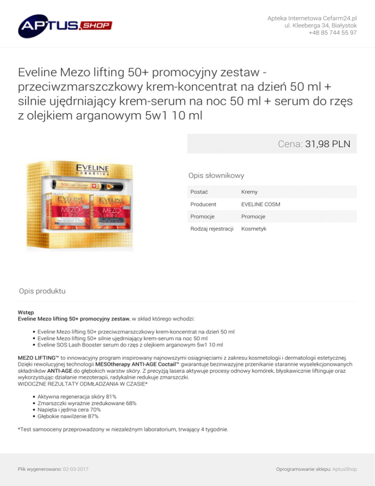 Apteka Internetowa Cefarm24.pl ul. Kleeberga 34, Białystok +48 85 744 55 97 Eveline Mezo lifting 50+ promocyjny zestaw przeciwzmarszczkowy krem-koncentrat na dzień 50 ml + silnie ujędrniający krem-serum na noc 50 ml + serum do rzęs z olejkiem arganowym 5w1 10 ml Cena: 31,98 PLN Opis słownikowy Postać Kremy Producent EVELINE COSM Promocje Promocje Rodzaj rejestracji Kosmetyk Opis produktu Wstęp Eveline Mezo lifting 50+ promocyjny zestaw, w skład którego wchodzi: Eveline Mezo lifting 50+ przeciwzmarszczkowy krem-koncentrat na dzień 50 ml Eveline Mezo lifting 50+ silnie ujędrniający krem-serum na noc 50 ml Eveline SOS Lash Booster serum do rzęs z olejkiem arganowym 5w1 10 ml MEZO LIFTING™ to innowacyjny program inspirowany najnowszymi osiągnięciami z zakresu kosmetologii i dermatologii estetycznej. Dzięki rewolucyjnej technologii MESOtherapy ANTI-AGE Coctail™ gwarantuje bezinwazyjne przenikanie starannie wyselekcjonowanych składników ANTI-AGE do głębokich warstw skóry. Z precyzją lasera aktywuje procesy odnowy komórek, błyskawicznie liftinguje oraz wykorzystując działanie mezoterapii, radykalnie redukuje zmarszczki. WIDOCZNE REZULTATY ODMŁADZANIA W CZASIE* Aktywna regeneracja skóry 81% Zmarszczki wyraźnie zredukowane 68% Napięta i jędrna cera 70% Głębokie nawilżenie 87% *Test samooceny przeprowadzony w niezależnym laboratorium, trwający 4 tygodnie. Plik wygenerowano: 02-03-2017 Oprogramowanie sklepu: AptusShop Apteka Internetowa Cefarm24.pl ul. Kleeberga 34, Białystok +48 85 744 55 97 Charakterystyka Eveline Mezo lifting 50+ przeciwzmarszczkowy krem-koncentrat na dzień Bogata, skoncentrowana formuła, oparta na technologii bezinwazyjnego odmładzania, została stworzona z myślą o codziennej pielęgnacji skóry po 50. roku życia. Multifunkcyjna kompozycja składników aktywnych doskonale zwalcza wszystkie oznaki starzenia się skóry, pobudza odnowę komórkową, silnie liftinguje i dostarcza unikalnych składników odżywczych. Składniki CZĄSTECZKOWY KWAS HIALURONOWY – wyjątkowe połączenie 3 rozmiarów cząsteczek zapewnia radykalną redukcję długości, szerokości i głębokości zmarszczek. Gwarantuje zaawansowane działanie odmładzające i liftingujące. IDEAL CONTURE® – nowatorski kompleks aminokwasów o silnym działaniu antyoksydacyjnym, niweluje oznaki zmęczenia. MATRIXYL®SYNTHE’6™ peptyd najnowszej generacji, wypełnia zmarszczki i przywraca gęstość skóry. PHYTOCellTec™ – biologicznie czynne komórki macierzyste jabłoni szwajcarskiej, które wspomagają funkcje komórek macierzystych w skórze i pobudzają procesy regeneracyjne skóry obciążonej brakiem snu oraz długotrwałym stresem. OLEJEK ARGANOWY – zawiera koktajl witamin i minerałów dzięki czemu sprawia, że skóra staje się gładka, jędrna i sprężysta. Eveline Mezo lifting 50+ silnie ujędrniający krem-serum na noc Bogaty krem, oparty na technologii bezinwazyjnego odmładzania, został stworzony z myślą o intensywnej, nocnej pielęgnacji skóry po 50. roku życia. Skoncentrowana formuła, wzbogacona aktywną formą PRO-Retinolu A, przywraca skórze witalność, intensywnie regeneruje i nawilża. Multifunkcyjna kompozycja składników aktywnych skutecznie modeluje kontur twarzy i redukuje wszystkie typy zmarszczek. Sładniki PRO-RETINOL A – witamina młodości, która przedłuża żywotność i stymuluje podziały komórek skóry. Odnawia włókna kolagenu i elastyny, dzięki czemu przywraca skórze jędrność, precyzyjnie wygładza i skutecznie rozjaśnia przebarwienia. 3-CZĄSTECZKOWY KWAS HIALURONOWY – wyjątkowe połączenie 3 rozmiarów cząsteczek zapewnia radykalną redukcję długości, szerokości i głębokości zmarszczek. Gwarantuje zaawansowane działanie odmładzające i liftingujące. OLEJEK ARGANOWY – zawarty w nim koktajl witamin i minerałów sprawia, że skóra staje się gładka, jędrna i sprężysta. OVALISS™ – aktywator modelujący kontury twarzy, maksymalnie wygładza i napina skórę szyi i dekoltu, co sprawia, że skutecznie eliminuje efekt podwójnego podbródka. ESSENSKIN™ - wzmacnia i odbudowuje strukturę skóry, poprawia jej gęstość oraz redukuje zmarszczki i bruzdy. Eveline SOS Lash Booster serum do rzęs z olejkiem arganowym 5w1 SOS multifunkcyjne serum do rzęs 5w1 to innowacyjny produkt, który łączy w sobie właściwości serum odbudowującego, aktywatora wzrostu włosa oraz bazy pod tusz. Nowatorska formuła bogata w zaawansowane składniki aktywne działające w synergii z olejkiem arganowym wykazuje silne działanie regenerujące i odżywcze. Doskonale pogrubia i zagęszcza rzęsy. Profesjonalna, specjalnie zaprojektowana elastyczna szczoteczka i satynowa konsystencja serum sprawią, że twoje oczy natychmiast nabiorą hipnotyzującego spojrzenia. Preparat nie zawiera substancji zapachowych. Polecany również dla osób noszących szkła kontaktowe i mających wrażliwe oczy. Wyselekcjonowane składniki aktywne bioHyaluron Complex dzięki wysokiej zawartości kwasu hialuronowego natychmiast wnika w strukturę rzęs, intensywnie nawilża, wygładza i stymuluje ich wzrost. Luxury of youth complexTM bogaty w drogocenny olejek arganowy, doskonale regeneruje, odżywia i wzmacnia rzęsy. Skutecznie odbudowuje i chroni włókna włosa przed działaniem szkodliwych czynników zewnętrznych. D-panthenol (prowitamina B5) natychmiast wnika w głąb rzęs, nawilża, wygładza i pogrubia włókno włosa, nadaje połysk, chroni, regeneruje i wzmacnia rzęsy od nasady aż po same końce. Stosowanie Eveline Mezo lifting 50+ przeciwzmarszczkowy krem-koncentrat na dzień Codziennie rano nanieść krem na oczyszczoną skórę twarzy, szyi i dekoltu. Doskonały pod makijaż. Kompleksową pielęgnację twarzy Plik wygenerowano: 02-03-2017 Oprogramowanie sklepu: AptusShop Apteka Internetowa Cefarm24.pl ul. Kleeberga 34, Białystok +48 85 744 55 97 zapewni równoległe stosowanie kremu na noc 50+ z serii ME