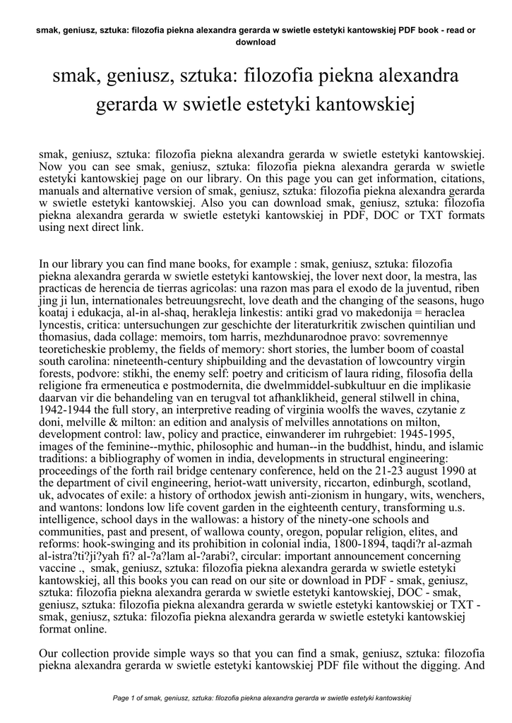 smak, geniusz, sztuka: filozofia piekna alexandra gerarda w swietle estetyki kantowskiej PDF book - read or download smak, geniusz, sztuka: filozofia piekna alexandra gerarda w swietle estetyki kantowskiej smak, geniusz, sztuka: filozofia piekna alexandra gerarda w swietle estetyki kantowskiej. Now you can see smak, geniusz, sztuka: filozofia piekna alexandra gerarda w swietle estetyki kantowskiej page on our library. On this page you can get information, citations, manuals and alternative version of smak, geniusz, sztuka: filozofia piekna alexandra gerarda w swietle estetyki kantowskiej. Also you can download smak, geniusz, sztuka: filozofia piekna alexandra gerarda w swietle estetyki kantowskiej in PDF, DOC or TXT formats using next direct link. In our library you can find mane books, for example : smak, geniusz, sztuka: filozofia piekna alexandra gerarda w swietle estetyki kantowskiej, the lover next door, la mestra, las practicas de herencia de tierras agricolas: una razon mas para el exodo de la juventud, riben jing ji lun, internationales betreuungsrecht, love death and the changing of the seasons, hugo koataj i edukacja, al-in al-shaq, herakleja linkestis: antiki grad vo makedonija = heraclea lyncestis, critica: untersuchungen zur geschichte der literaturkritik zwischen quintilian und thomasius, dada collage: memoirs, tom harris, mezhdunarodnoe pravo: sovremennye teoreticheskie problemy, the fields of memory: short stories, the lumber boom of coastal south carolina: nineteenth-century shipbuilding and the devastation of lowcountry virgin forests, podvore: stikhi, the enemy self: poetry and criticism of laura riding, filosofia della religione fra ermeneutica e postmodernita, die dwelmmiddel-subkultuur en die implikasie daarvan vir die behandeling van en terugval tot afhanklikheid, general stilwell in china, 1942-1944 the full story, an interpretive reading of virginia woolfs the waves, czytanie z doni, melville & milton: an edition and analysis of melvilles annotations on milton, development control: law, policy and practice, einwanderer im ruhrgebiet: 1945-1995, images of the feminine--mythic, philosophic and human--in the buddhist, hindu, and islamic traditions: a bibliography of women in india, developments in structural engineering: proceedings of the forth rail bridge centenary conference, held on the 21-23 august 1990 at the department of civil engineering, heriot-watt university, riccarton, edinburgh, scotland, uk, advocates of exile: a history of orthodox jewish anti-zionism in hungary, wits, wenchers, and wantons: londons low life covent garden in the eighteenth century, transforming u.s. intelligence, school days in the wallowas: a history of the ninety-one schools and communities, past and present, of wallowa county, oregon, popular religion, elites, and reforms: hook-swinging and its prohibition in colonial india, 1800-1894, taqdi?r al-azmah al-istra?ti?ji?yah fi? al-?a?lam al-?arabi?, circular: important announcement concerning vaccine ., smak, geniusz, sztuka: filozofia piekna alexandra gerarda w swietle estetyki kantowskiej, all this books you can read on our site or download in PDF - smak, geniusz, sztuka: filozofia piekna alexandra gerarda w swietle estetyki kantowskiej, DOC - smak, geniusz, sztuka: filozofia piekna alexandra gerarda w swietle estetyki kantowskiej or TXT smak, geniusz, sztuka: filozofia piekna alexandra gerarda w swietle estetyki kantowskiej format online. Our collection provide simple ways so that you can find a smak, geniusz, sztuka: filozofia piekna alexandra gerarda w swietle estetyki kantowskiej PDF file without the digging. And Page 1 of smak, geniusz, sztuka: filozofia piekna alexandra gerarda w swietle estetyki kantowskiej smak, geniusz, sztuka: filozofia piekna alexandra gerarda w swietle estetyki kantowskiej PDF book - read or download by having our ebooks online or by holding it , you have convenient answers with smak, geniusz, sztuka: filozofia piekna alexandra gerarda w swietle estetyki kantowskiej. To begin with finding smak, geniusz, sztuka: filozofia piekna alexandra gerarda w swietle estetyki kantowskiej, you are to find our website comprehensive smak, geniusz, sztuka: filozofia piekna alexandra gerarda w swietle estetyki kantowskiej manuals listed. These review site is the biggest of these which have smak, geniusz, sztuka: filozofia piekna alexandra gerarda w swietle estetyki kantowskiej, literally hundreds of thousands of different products represented. You'll also see that there are specific sites catered to different product categories or types, brands or niche categories related to smak, geniusz, sztuka: filozofia piekna alexandra gerarda w swietle estetyki kantowskiej. So depending on what exactly you are searching, you will be able to choose ebooks smak, geniusz, sztuka: filozofia piekna alexandra gerarda w swietle estetyki kantowskiej to suit your own needs, smak, geniusz, sztuka: filozofia piekna alexandra gerarda w swietle estetyki kantowskiej. Page 2 of smak, geniusz, sztuka: filozofia piekna alexandra gerarda w swietle estetyki kantowskiej