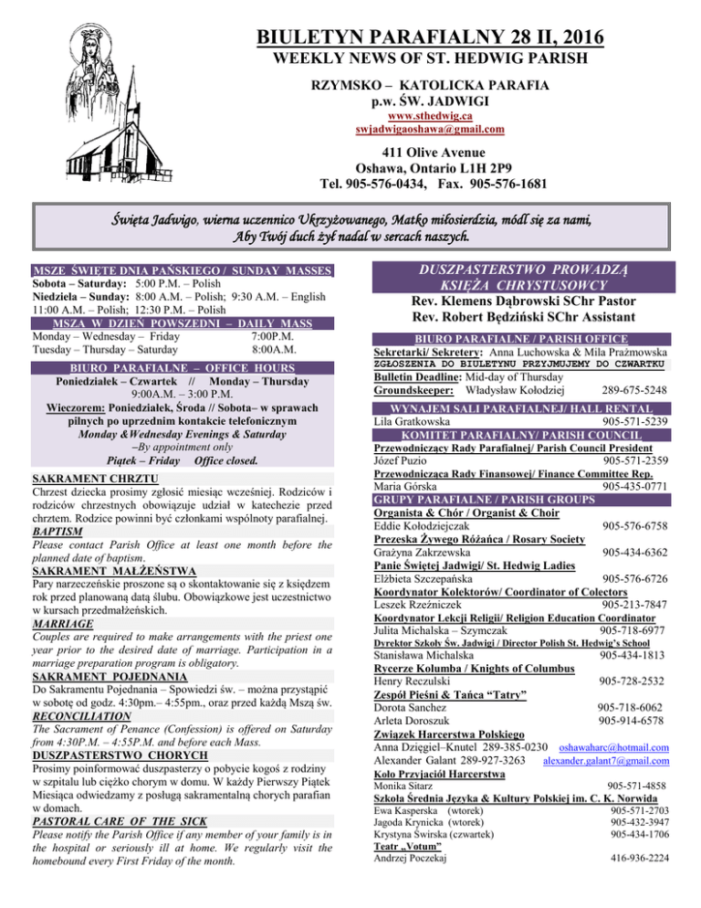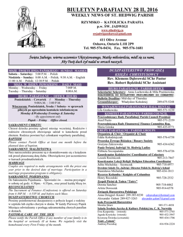 BIULETYN PARAFIALNY 28 II, 2016 WEEKLY NEWS OF ST. HEDWIG PARISH RZYMSKO – KATOLICKA PARAFIA p.w. ŚW. JADWIGI www.sthedwig.ca [email protected] 411 Olive Avenue Oshawa, Ontario L1H 2P9 Tel. 905-576-0434, Fax. 905-576-1681 Święta Jadwigo, wierna uczennico Ukrzyżowanego, Matko miłosierdzia, módl się za nami, Aby Twój duch żył nadal w sercach naszych. MSZE ŚWIĘTE DNIA PAŃSKIEGO / SUNDAY MASSES Sobota – Saturday: 5:00 P.M. – Polish Niedziela – Sunday: 8:00 A.M. – Polish; 9:30 A.M. – English 11:00 A.M. – Polish; 12:30 P.M. – Polish MSZA W DZIEŃ POWSZEDNI – DAILY MASS Monday – Wednesday – Friday 7:00P.M. Tuesday – Thursday – Saturday 8:00A.M. BIURO PARAFIALNE – OFFICE HOURS Poniedziałek – Czwartek // Monday – Thursday 9:00A.M. – 3:00 P.M. Wieczorem: Poniedziałek, Środa // Sobota– w sprawach pilnych po uprzednim kontakcie telefonicznym Monday &Wednesday Evenings & Saturday –By appointment only Piątek – Friday Office closed. SAKRAMENT CHRZTU Chrzest dziecka prosimy zgłosić miesiąc wcześniej. Rodziców i rodziców chrzestnych obowiązuje udział w katechezie przed chrztem. Rodzice powinni być członkami wspólnoty parafialnej. BAPTISM Please contact Parish Office at least one month before the planned date of baptism. SAKRAMENT MAŁŻEŃSTWA Pary narzeczeńskie proszone są o skontaktowanie się z księdzem rok przed planowaną datą ślubu. Obowiązkowe jest uczestnictwo w kursach przedmałżeńskich. MARRIAGE Couples are required to make arrangements with the priest one year prior to the desired date of marriage. Participation in a marriage preparation program is obligatory. SAKRAMENT POJEDNANIA Do Sakramentu Pojednania – Spowiedzi św. – można przystąpić w sobotę od godz. 4:30pm.– 4:55pm., oraz przed każdą Mszą św. RECONCILIATION The Sacrament of Penance (Confession) is offered on Saturday from 4:30P.M. – 4:55P.M. and before each Mass. DUSZPASTERSTWO CHORYCH Prosimy poinformować duszpasterzy o pobycie kogoś z rodziny w szpitalu lub ciężko chorym w domu. W każdy Pierwszy Piątek Miesiąca odwiedzamy z posługą sakramentalną chorych parafian w domach. PASTORAL CARE OF THE SICK Please notify the Parish Office if any member of your family is in the hospital or seriously ill at home. We regularly visit the homebound every First Friday of the month. DUSZPASTERSTWO PROWADZĄ KSIĘŻA CHRYSTUSOWCY Rev. Klemens Dąbrowski SChr Pastor Rev. Robert Będziński SChr Assistant BIURO PARAFIALNE / PARISH OFFICE Sekretarki/ Sekretery: Anna Luchowska & Mila Prażmowska ZGŁOSZENIA DO BIULETYNU PRZYJMUJEMY DO CZWARTKU Bulletin Deadline: Mid-day of Thursday Groundskeeper: Władysław Kołodziej 289-675-5248 WYNAJEM SALI PARAFIALNEJ/ HALL RENTAL Lila Gratkowska 905-571-5239 KOMITET PARAFIALNY/ PARISH COUNCIL Przewodniczący Rady Parafialnej/ Parish Council President Józef Puzio 905-571-2359 Przewodnicząca Rady Finansowej/ Finance Committee Rep. Maria Górska 905-435-0771 GRUPY PARAFIALNE / PARISH GROUPS Organista & Chór / Organist & Choir Eddie Kołodziejczak 905-576-6758 Prezeska Żywego Różańca / Rosary Society Grażyna Zakrzewska 905-434-6362 Panie Świętej Jadwigi/ St. Hedwig Ladies Elżbieta Szczepańska 905-576-6726 Koordynator Kolektorów/ Coordinator of Colectors Leszek Rzeźniczek 905-213-7847 Koordynator Lekcji Religii/ Religion Education Coordinator Julita Michalska – Szymczak 905-718-6977 Dyrektor Szkoły Św. Jadwigi / Director Polish St. Hedwig’s School Stanisława Michalska 905-434-1813 Rycerze Kolumba / Knights of Columbus Henry Reczulski 905-728-2532 Zespół Pieśni & Tańca “Tatry” Dorota Sanchez 905-718-6062 Arleta Doroszuk 905-914-6578 Związek Harcerstwa Polskiego Anna Dzięgiel–Knutel 289-385-0230 [email protected] Alexander Galant 289-927-3263 [email protected] Koło Przyjaciół Harcerstwa Monika Sitarz 905-571-4858 Szkoła Średnia Języka & Kultury Polskiej im. C. K. Norwida Ewa Kasperska (wtorek) Jagoda Krynicka (wtorek) Krystyna Świrska (czwartek) Teatr „Votum” Andrzej Poczekaj 905-571-2703 905-432-3947 905-434-1706 416-936-2224 INTENCJE MSZALNE NA TRZECIĄ NIEDZIELĘ WIELKIEGO POSTU MASS INTENTIONS FOR THE 3RD SUNDAY OF LENT FEBRUARY / LUTY 27, SATURDAY – SOBOTA 5:00PM Dziękczynna za 25 lat małżeństwa, z prośbą o dalsze Boże błogosławieństwo, opiekę Matki Bożej i potrzebne łaski dla Marcina i Danuty FEBRUARY / LUTY 28, SUNDAY– NIEDZIELA 8:00am O Boże łaski i dary Ducha Św. dla Łukasza i Maggie – Rodzice 9:30am †† Harold i Rita Tindale – Son with Family 11:00am † Kazimiera Superson (4 rocz. śm.) – Rodzina 12:30PM O wypełnienie się woli Bożej, potrzebne łaski i zdrowie dla Teresy Wiśniewskiej – A. & S. Lasek 4:00PM Gorzkie Żale FEBRUARY / LUTY 29, MONDAY – PONIEDZIAŁEK 7:00PM †† Stanisława Puścik i Wawrzyniec Gawlik – Rodzina Gawlik MARCH / MARZEC 1, TUESDAY – WTOREK 8:00am † Aniela Bukowiec – Córka Halina 8:00am † Zofia Krysa – Chór Parafialny MARCH / MARZEC 2, WEDNESDAY – ŚRODA 6:30PM Droga Krzyżowa dla Dzieci 7:00PM † Władysław Piechocki (2 rocz. śm.) – Żona z Rodziną 7:00PM † Władysław Góra – Regina Jeramowicz-Szewczyk & Rodzina Toczko Wszystkim Solenizantom i Jubilatom Tygodnia Składamy Najserdeczniejsze Życzenia – Przede Wszystkim Zdrowia i Obfitości Łask Bożych, Wypraszanych Przez Patronkę Naszej Parafii, Św. Jadwigę MARCH / MARZEC 3, THURSDAY – CZWARTEK 8:00am † Kazimiera Jasińska (11 rocz. śm.) – Mąż 8:00am † Michał Łakomy – Syn z Rodziną MARCH / MARZEC 4, FIRST FRIDAY – PIERWSZY PIĄTEK – św. Kazimierza, Królewicza. 8:00am O łaskę uwolnienia od złego i zniewoleń 6:30PM Droga Krzyżowa 7:00PM † Antoni Uciecha – Rodzina Radziszewskich MARCH / MARZEC 5, SATURDAY – SOBOTA 8:00am O Boże dary Ducha Świętego dla Syna z okazji urodzin 5:00PM †† Jan i Helena Horbacewicz i zmarłych z Rodziny – Siostra z Rodziną MARCH / MARZEC 6, SUNDAY– NIEDZI