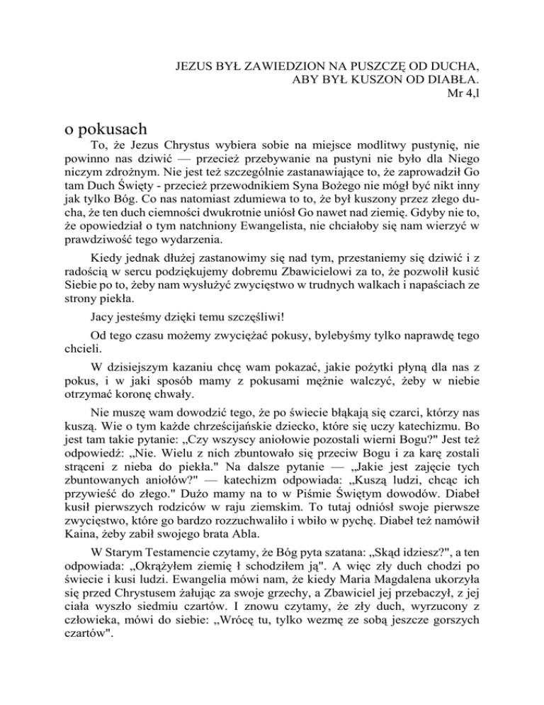 JEZUS BYŁ ZAWIEDZION NA PUSZCZĘ OD DUCHA, ABY BYŁ KUSZON OD DIABŁA. Mr 4,l o pokusach To, że Jezus Chrystus wybiera sobie na miejsce modlitwy pustynię, nie powinno nas dziwić — przecież przebywanie na pustyni nie było dla Niego niczym zdrożnym. Nie jest też szczególnie zastanawiające to, że zaprowadził Go tam Duch Święty - przecież przewodnikiem Syna Bożego nie mógł być nikt inny jak tylko Bóg. Co nas natomiast zdumiewa to to, że był kuszony przez złego ducha, że ten duch ciemności dwukrotnie uniósł Go nawet nad ziemię. Gdyby nie to, że opowiedział o tym natchniony Ewangelista, nie chciałoby się nam wierzyć w prawdziwość tego wydarzenia. Kiedy jednak dłużej zastanowimy się nad tym, przestaniemy się dziwić i z radością w sercu podziękujemy dobremu Zbawicielowi za to, że pozwolił kusić Siebie po to, żeby nam wysłużyć zwycięstwo w trudnych walkach i napaściach ze strony piekła. Jacy jesteśmy dzięki temu szczęśliwi! Od tego czasu możemy zwyciężać pokusy, bylebyśmy tylko naprawdę tego chcieli. W dzisiejszym kazaniu chcę wam pokazać, jakie pożytki płyną dla nas z pokus, i w jaki sposób mamy z pokusami mężnie walczyć, żeby w niebie otrzymać koronę chwały. Nie muszę wam dowodzić tego, że po świecie błąkają się czarci, którzy nas kuszą. Wie o tym każde chrześcijańskie dziecko, które się uczy katechizmu. Bo jest tam takie pytanie: „Czy wszyscy aniołowie pozostali wierni Bogu?" Jest też odpowiedź: „Nie. Wielu z nich zbuntowało się przeciw Bogu i za karę zostali strąceni z nieba do piekła." Na dalsze pytanie — „Jakie jest zajęcie tych zbuntowanych aniołów?" — katechizm odpowiada: „Kuszą ludzi, chcąc ich przywieść do złego." Dużo mamy na to w Piśmie Świętym dowodów. Diabeł kusił pierwszych rodziców w raju ziemskim. To tutaj odniósł swoje pierwsze zwycięstwo, które go bardzo rozzuchwaliło i wbiło w pychę. Diabeł też namówił Kaina, żeby zabił swojego brata Abla. W Starym Testamencie czytamy, że Bóg pyta szatana: „Skąd idziesz?", a ten odpowiada: „Okrążyłem ziemię ł schodziłem ją". A więc zły duch chodzi po świecie i kusi ludzi. Ewangelia mówi nam, że kiedy Maria Magdalena ukorzyła się przed Chrystusem żałując za swoje grzechy, a Zbawiciel jej przebaczył, z jej ciała wyszło siedmiu czartów. I znowu czytamy, że zły duch, wyrzucony z człowieka, mówi do siebie: „Wrócę tu, tylko wezmę ze sobą jeszcze gorszych czartów". Trzeba więc walczyć i opierać się pokusom. Gdybyśmy zapytali tych chrześcijan, którzy dziś jęczą w piekle - a których przeznaczeniem było przecież niebo - gdybyśmy więc zapytali ich, dlaczego poszli na zatracenie, odpowiedzieliby nam: „Dlatego, że ulegaliśmy pokusom". A co zapewniło szczęście wieczne Świętym? Dlaczego królują teraz w niebie? Na takie pytanie ci szczęśliwi mieszkańcy wysokości odpowiedzieliby jednogłośnie: „Przy pomocy łaski Bożej opieraliśmy się pokusom i odnosiliśmy zwycięstwa nad czartem". Co to jest pokusa? Jest to namawianie człowieka przez złego ducha, żeby zrobił to, czego Bóg zabrania, albo żeby nie robił tego, co Stwórca poleca i nakazuje. Bóg chce, żebyśmy poranne i wieczorne modlitwy odmawiali na kolanach i z uszanowaniem, żebyśmy w niedziele i święta byli na Mszy Świętej — a jeśli to możliwe i na innych nabożeństwach — żebyśmy kochali wszystkich ludzi (a więc także i nieprzyjaciół!), żebyśmy pościli w nakazane dni, żebyśmy się starali poznać i dobrze wypełniać obowiązki swojego stanu, żebyśmy chętnym sercem darowywali urazy, powstrzymywali się od przekleństw, od mówienia źle o ludziach, od szkalowania ich, wypowiadania wulgarnych słów, robienia rzeczy niemoralnych. Żąda też, żeby dzieci szanowały swoich rodziców, a podwładni przełożonych. I jeżeli mimo podszeptów złego ducha nie przekraczacie tych Bożych zasad, to nie ulegacie pokusie, a jeżeli idziecie za jego podszeptami, pokusa odnosi nad wami zwycięstwo. Dobrze jest w czasie doświadczania pokusy zadać sobie proste pytanie: „Czy w godzinie śmierci byłbym zadowolony, że poszedłem za tym piekielnym podszeptem?" Czy wiecie, dlaczego szatan z taką zaciekłością stara się doprowadzić człowieka do upadku? Bo chce, żeby stworzenia okazywały wzgardę swojemu Bogu. Jakie to szczęście, że Jezus Chrystus stał się dla nas wzorem i przykładem we wszystkich sytuacjach życiowych! Kiedy, na przykład, spotyka nas pogarda, wpatrujmy się w Niego, jak idzie przed nami z koroną cierniową na głowie, jak Go ubierają w czerwony płaszcz i traktują jak głupca. Kiedy cierpimy, możemy znajdować umocnienie w obrazie Zbawiciela, który pokryty ranami, w strasznych boleściach umiera na krzyżu. Kiedy prześladują nas źli ludzie, nie narzekajmy na to, skoro wiemy, że Jezus za swoich katów idzie na śmierć. Kiedy opadają nas diabelskie pokusy, nie upadajmy na duchu, pamiętając o tym, że i naszego ukochanego Zbawiciela piekielny duch dwa razy podnosił ponad ziemię. A więc zawsze i wszędzie, w każdym cierpieniu i w każdej pokusie, miejmy przed oczyma duszy Boga, który idzie przed nami, i który pomoże nam zwyciężyć. Te myśli powinny być dla chrześcijanina ogromnym pokrzepieniem - bo i on na pewno nie ulegnie pokusie, jeżeli tylko będzie się uciekał do Boga. Pokusy są o tyle pożyteczne, że pouczają nas o naszej nicości i słabości. A skoro jesteśmy tak słabi, to, jak mówi Święty Augustyn, powinniśmy dziękować Bogu za ustrzeżenie przed grzechem tak samo, jak za przebaczenie win, które już popełniliśmy. To, że tak często wpadamy w pułapki diabła, bierze się stąd, że jesteśmy za bardzo pewni swoich postanowień i przyrzeczeń. Kiedy nie dręczą nas smutki, kiedy wszystko dzieje się po naszej myśli, wtedy jesteśmy za bardzo zadufani w sobie, wydaje się nam, że nic nie może 