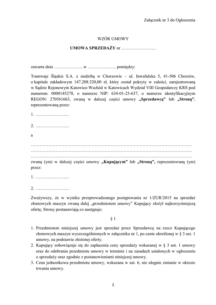 Załącznik nr 3 do Ogłoszenia WZÓR UMOWY UMOWA SPRZEDAŻY nr …………………… zawarta dnia ……………….. w ……………….. pomiędzy: Tramwaje Śląskie S.A. z siedzibą w Chorzowie – ul. Inwalidzka 5, 41-506 Chorzów, o kapitale zakładowym 147.208.320,00 zł, który został pokryty w całości, zarejestrowaną w Sądzie Rejonowym Katowice-Wschód w Katowicach Wydział VIII Gospodarczy KRS pod numerem: 0000145278, o numerze NIP: 634-01-25-637, o numerze identyfikacyjnym REGON: 270561663, zwaną w dalszej części umowy „Sprzedawcą” lub „Stroną”, reprezentowaną przez: 1. ………………….. 2. ………………….. a ………………………………………………………………………………………………… ………………………………………………………………………………………………… ………………………………………………………………………………………………… zwaną (ym) w dalszej części umowy „Kupującym” lub „Stroną”, reprezentowaną (ym) przez: 1. ………………….. 2. ………………….. Zważywszy, że w wyniku przeprowadzonego postępowania nr 1/ZUR/2015 na sprzedaż złomowych maszyn zwaną dalej „przedmiotem umowy” Kupujący złożył najkorzystniejszą ofertę, Strony postanawiają co następuje: §1 1. Przedmiotem niniejszej umowy jest sprzedaż przez Sprzedawcę na rzecz Kupującego złomowych maszyn wyszczególnionych w załączniku nr 1, po cenie określonej w § 3 ust. 1 umowy, na podstawie złożonej oferty. 2. Kupujący zobowiązuje się do zapłacenia ceny sprzedaży wskazanej w § 3 ust. 1 umowy oraz do odebrania przedmiotu umowy w terminie i na zasadach ustalonych w ogłoszeniu o sprzedaży oraz zgodnie z postanowieniami niniejszej umowy. 3. Cena jednostkowa przedmiotu umowy, wskazana w ust. 6, nie ulegnie zmianie w okresie trwania umowy. 1 4. Cena jednostkowa nie obejmuje demontażu, odbioru, załadunku, transportu, wywozu przedmiotu umowy oraz porządkowania terenu po jej demontażu z placu składowego zlokalizowanego u Sprzedawcy, a także wszelkich innych kosztów ponoszonych przez Kupującego, związanych z nabyciem przedmiotu umowy chyba, że w ogłoszeniu o sprzedaży zastrzeżono inaczej. 5. Demontażu, odbioru, załadunku, transportu, porządkowanie terenu oraz wywozu przedmiotu umowy Kupujący dokona własnymi środkami i na własny koszt z miejsca wskazanego przez Sprzedawcę. 6. Cena przedmiotu umowy: Ilość szt. Lp. Nazwa 1 Maszyny złomowe wg załącznika nr 1 Cena netto zł/szt. 4 §2 1. Odbioru przedmiotu umowy mogą dokonać wyłącznie osoby posiadające pisemne upoważnienie Kupującego. 2. Strony ustalają, iż demontaż, odbiór, załadunek oraz wywóz przedmiotu umowy nastąpi w terminie 10 dni roboczych od dnia podpisania umowy, tj. do dnia …………………. . Po upływie wskazanego terminu Sprzedający ma prawo do naliczania kar umownych zgodnie z § 5. 3. Strony zgodnie ustalają, że z chwilą upływu terminu określonego w ust. 2 przechodzą na Kupującego korzyści i ciężary związane z przedmiotem umowy oraz niebezpieczeństwo przypadkowej utraty lub uszkodzenia przedmiotu umowy. 4. Wydanie złomowych maszyn nastąpi w dni robocze, od poniedziałku do piątku, w godzinach od 06.00 do 14.00, nie wcześniej niż po uiszczeniu ceny sprzedaży, o której mowa w § 3 ust. 1. 5. O terminie demontażu i odbioru przedmiotu umowy Kupujący zawiadomi Sprzedawcę z wyprzedzeniem co najmniej dwóch dni roboczych. 6. Informację o zamiarze odbioru przedmiotu umowy należy zgłosić telefoniczne lub faksem bezpośrednio osobie uprawnionej do kontaktu wskazanej w § 9 ust. 4a niniejszej umowy. 7. Wskazaną informację można również przesłać w formie elektronicznej na adres: [email protected]. 8. Sprzedawca wyda Kupującemu wypełnioną „Kartę przekazania odpadu”. W momencie odbioru Kupujący jest zobowiązany potwierdzić przyjęcie złomowych maszyn na karcie przekazania odpadu. „Karta przekazania odpadu” zostanie sporządzona w odpowiedniej liczbie egzemplarzy – po jednym dla Sprzedawcy i Kupującego oraz kierowcy, według wzoru określonego w załączniku nr 5 do Rozporządzenia Ministra Środowiska z dnia 12 grudnia 2014r. w sprawie wzorów dokumentów stosowanych na potrzeby ewidencji odpadów (Dz.U. z 2014r., poz. 1973). 9. Kupujący ponosi odpowiedzialność prawną za wszelkie skutki zdarzeń zagrażających zdrowiu i życiu osób uczestniczących w demontażu i załadunku złomowych maszyn. 2 §3 1. Kupujący zapłaci Sprzedawcy kwotę …………….. zł netto (słownie złotych: ………………. złotych) tytułem ceny sprzedaży przedmiotu umowy przelewem na rachunek bankowy Sprzedawcy o numerze 23 1240 1111 0000 4839 6893 w Banku Pekao S.A., minimum na dwa dni robocze przed planowanym odbiorem przedmiotu umowy. 2. W tytule przelewu Kupujący wskaże datę i numer umowy. 3. Za dzień zapłaty uznaje się datę wpływu środków pieniężnych na wskazany powyżej rachunek bankowy. 4. Sprzedawca w terminie 7 dni od dnia zapłaty wystawi fakturę dokumentującą wpłatę ceny sprzedaży przedmiotu umowy, o której mowa w § 3 ust. 1, wskazując, że podatek od towarów i usług rozlicza Kupujący jako „odwrotne obciążenie”. 5. Kupujący upoważnia Sprzedawcę do wystawienia faktury bez jego podpisu. 6. Protokół zdawczo-odbiorczy złomowanych maszyn podpisują osoby wskazane w § 9 ust. 4 niniejszej umowy. §4 Strony postanawiają, iż podpisany przez Sprzedawcę i Kupującego protokół zdawczoodbiorczy, stanowiący załącznik nr 2 do niniejszej umowy, potwierdzać będzie prawidłowe: załadunek, uporządkowanie terenu oraz wywóz złomowanych maszyn przez Kupującego oraz brak jakichkolwiek zastrzeżeń Kupującego do stanu technicznego, właściwości, jakości i ilości przedmiotu umowy. §5 1. Jeżeli odbiór przedmiotu umowy nie nastąpi w umówionym 
