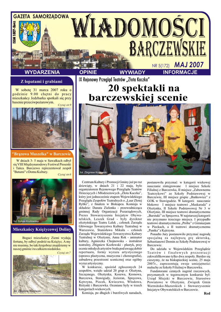 NR 5(172) WYDARZENIA Z łopatami i grabiami W sobotę 31 marca 2007 roku o godzinie 9.00 chętni do pracy mieszkańcy Jedzbarka spotkali się przy basenie przeciwpożarowym. OPINIE WYWIADY IX Rejonowy Przegląd Teatrów „Złota Kaczka” MAJ 2007 INFORMACJE 20 spektakli na barczewskiej scenie Czytaj str.9 "Brązowa Muszelka" w Barczewie W dniach 3- 5 maja w Suwałkach odbył się VIII Międzynarodowy Festiwal Piosenki i Tańca. Barczewo reprezentował zespół "Batumi" z Domu Kultury. Czytaj str.6 fot. Syliwa Kozłowska Mieszkańcy Księżycowej Doliny Bogaci mieszkańcy Ziemi wydają fortunę, by odbyć podróż na Księżyc. A my nie musimy, bo taki krajobraz znajdziemy w naszej gminie i to całkiem niedaleko. Czytaj str.7 fot. Zbigniew Kozłowski "Józef Piłsudski na Kasztance", obraz W. Kossaka fot. Zbigniew Kozłowski Centrum Kultury i Promocji Gminy już po raz dziewiąty, w dniach 21 i 22 maja, było organizatorem Rejonowego Przeglądu Teatrów Dziecięcych i Młodzieżowych „Złota Kaczka”, który jest jednocześnie etapem Wojewódzkiego Przeglądu Zespołów Teatralnych o „Laur Złotej Rybki”, z finałem w Biskupcu. Komisja w składzie: Danuta Zielonka - przewodnicząca gminnej Rady Organizacji Pozarządowych, Prezes Stowarzyszenia Inicjatyw Obywatelskich, Leszek Grad - były dyrektor olsztyńskiego Teatru Lalek , członek Zarządu Głównego Towarzystwa Kultury Teatralnej w Warszawie, Stanisława Mikuła - członek Zarządu Wojewódzkiego Towarzystwa Kultury Teatralnej w Olsztynie, Anna Rok - animator kultury, Agnieszka Chojnowska - instruktor teatralny, Zbigniew Kozłowski - plastyk, przy ocenie młodych artystów brała pod uwagę dobór repertuaru, formy wyrazu artystycznego (oprawa plastyczna, muzyczna i choreografia), zabudowę przestrzeni scenicznej oraz ogólny wyraz artystyczny. W konkursie, spośród zgłoszonych 24 zespołów, wzięło udział 20 grup z: Olsztyna, Szczęsnego, Olsztynka, Kosewa, Kronowa, Barczewa, Stawigudy, Jezioran, Spręcowa, Kętrzyna, Piecek, Kwiecewa, Włodowa, Różynki i Barczewka. Oceniane były w trzech kategoriach wiekowych. Komisja, po długich i burzliwych naradach, postanowiła przyznać: w kategorii wiekowej nauczanie zintegrowane I miejsce Szkole Filialnej z Barczewka, II miejsce „Zabawnemu Teatrzykowi” ze Szkoły Podstawowej w Barczewie, III miejsce grupie „Bańkowice” z GOK w Stawigudzie. W kategorii nauczanie blokowe I miejsce teatrowi „Maskarada” z Olsztynka, II Szkole Podstawowej Nr 3 w fot. archiwum Olsztynie, III miejsce teatrowi dramatycznemu „Barstuki” ze Spręcowa. W najstarszej kategorii nie przyznano trzeciego miejsca. I przypadło teatrowi dramatycznemu „Próba” z Gimnazjum w Pieckach, a II teatrowi dramatycznemu „Panika” z Kętrzyna. Ponadto Jury postanowiło przyznać nagrodę specjalną za najlepszą grę aktorską, Sebastianowi Domin ze Szkoły Podstawowej w Barczewie. Do udziału w Wojewódzkim Przeglądzie Te a t r ó w i f i n a ł o w y c h p r e z e n t a c j i zakwalifikowano tylko dwa zespoły. Bardzo się cieszymy, że na biskupieckiej scenie, 25 maja 2007r., zaprezentują swoje umiejętności maluchy ze Szkoły Filialnej w Barczewku. Fundatorami cennych nagród rzeczowych, przyznanych w tegorocznym konkursie był: Urząd Miejski w Barczewie, Starostwo Powiatowe w Olsztynie, Związek Gmin Warmińsko-Mazurskich i Stowarzyszenie Inicjatyw Obywatelskich w Barczewie. Red Informacje KRONIKA POLICYJNA Pożar w Prólach Zdarzenie miało miejsce dnia 14.04.2007 r. w miejscowości Próle, gm. Barczewo. Z bliżej nieokreślonych przyczyn spaliły się zabudowania inwentarskie, straty wynoszą 300.000 złotych. Uszkodzenia ciała Zdarzenie miało miejsce 07.04.2007r. na terenie Zajazdu przy ul. Warmińskiej w Barczewie. Dwóch sprawców dokonało pobicia poszkodowanego. Przyczyną pobicia było obrażenie słowne dziewczyny jednego ze sprawców. Sprawcy zostali zatrzymani przez policję z KP Barczewo. Kradzież z włamaniem Zdarzenie miało miejsce 21.04.2007 r. w miejscowości Łęgajny. Zdarzenia kryminalne zaistniałe na terenie miasta i gminy Barczewo w kwietniu 2007 roku Nieznany sprawca poprzez zerwanie kłódki dostał się na strychu skąd dokonał zaboru kabli, roweru i płyty pilśniowej o łącznej wartości 1050 złotych. Prowadzenie samochodu w stanie nietrzeźwości, wręczenie korzyści majątkowej Zdarzenie miało miejsce 16.04.2007 w Barczewie. Sprawca, obywatel Niemiec będąc w stanie nietrzeźwości kierował pojazdem osobowym marki VW Golf. Po zatrzymaniu i przywiezieniu do KP Barczewo proponował funkcjonariuszom tut. Komisariatu pieniądze w kwocie 100 Euro, w zamian za odstąpienie od czynności. Następnie wręczył jednemu z funkcjonariuszy złoty zegarek. Wobec sprawcy sąd zastosował areszt tymczasowy na okres trzech miesięcy. Kradzież z włamaniem do sklepu „Alkohole za Grosze” Zdarzenie miało miejsce 15.04.2007 r. W Barczewie. Dwóch sprawców, poprzez wybicie szyby wystawowej z wnętrza sklepu dokonało Miejska Przychodnia Zdrowia informuje 6 ton śmieci z nielegalnego wysypiska W związku z planowanym remontem i r eorganizacją pods tacji P o g o to w ia Ratunkowego w Barczewie od dnia 1 lipca 2007 r. lekarz pogotowia nie będzie udzielał porad ambulatoryjnych w przychodni w godzinach nocnych i w dniach wolnych od pracy. Zgodnie z umową z Narodowym Funduszem Zdrowia przychodnia w Barczewie czynna jest od poniedziałku do piątku, w godzinach 8- 18. W nocy oraz w dni wolne od pracy pacjentów przyjmuje ambulatorium internistyczno- pediatryczne w Olsztynie, ul. Żołnierska (Szpital Dziecięcy). W uzasadnionych przypadkach będzie możliwość zamówienia wizyty domowej lekarza ogólnego. W sytuacji nagłego pogorszenia stanu zdrowia lub urazu należy zawsze dzwonić na telefon alarmowy Pogotowia Ratunkowego 999 lub 112. Lekarz Jacek Pomorski 28 kwietnia 2007 roku, sołtys Barczewka, p. Beata Sierpińska- Marcińczyk (nauczyciel Fot. W. Zenderowski