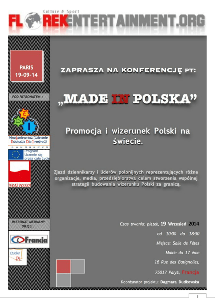 !1 ! ! jako oficjalny partner: ! ! Konferencji towarzyszyć będzie wystawa fotograficzna, w ramach projektu "Mnożenie przez Dzielenie - Edukacja dla Integracji" (EDI) finansowanego ze środków Unii Europejskiej w ramach Programu «Uczenie się przez caĿe życie« (Lifelong Learning Programme LLP), akcji « Projekty partnerskie Grundtviga ». ! PROGRAM KONFERENCJI 18.IX.2014 CZWARTEK Godzina Wydarzenie 14:00 - 19:00 • Zakwaterowanie uczestników w hotelu 19:30 - 22:30 • Kolacja przywitalna w restauracji Tifinagh 17 avenue Rachel, 75018 Paris Métro : Blanche ! ! ! ! ! ! ! !2 19.IX.2014 PIĄTEK Godzina 08:00-09:00 ! ! 10:00-10:05 10:05-10:30 10:30 -12:30 ! ! ! ! ! ! ! ! ! ! ! ! ! Wydarzenie Śniadanie w hotelu ! Powitanie i uroczyste otwarcie: Anita Wójtowicz- Prezes stowarzyszenia Florek&Entertainment Barbara Detyniecki - Konsul RP we Francji ! Prezentacja inaugurująca konferencje: Prof. Marek Więckowski, dyrektor Stacji Naukowej PAN w Paryżu. « Promocja i wizerunek Polski w świetle koncepcji marketingu terytorialnego » ! • Wypowiedzi zaproszonych gości: - Pani Joanna Karasek, dyrektor Instytutu Polskiego w Paryżu: « Budowa marki « Polska » przez administrację centralną w Polsce, ! - Pan Janusz Ptak Sekretarz Generalny EFPSNT « Kilka refleksji na temat promocji Polski » rola stowarzyszen technicznych w promocji a w szczegolnosci SITPF i europejskiej federacji EFPSNT oraz doswiadczen wlasnych, ze spojrzeniem na aspekt polityczno-ekonomiczno-turystyczny promocji. ! - Pani Bożena Bertaud, prezes Union Franco-Polonaise: « Działalność stowarzyszenia Union Franco-Polonaise» ! - Pan Alain Schneider, zastępca konsula generalnego Francji w Krakowie, były dyrektor Instytutu Francuskiego w Krakowie: « Pologne/France - images croisés hier et aujourd’hui ». ! • Omawiane tematy: 1. 2. 4. 5. Aktualny wizerunek Polski w UE. Polska widziana oczami Polaków w Polsce i za granicą. Poprawiać wizerunek czy może „wymyślić go na nowo”. Historia i kultura Polski a jej współczesność - promocja i konstruktywny dialog. !3 12:30-12:40 • Pan Benjamin Mallo zastępca mera 17-ej dzielnicy Paryża, « wizja Francuzów o Polakach oraz stosunki polsko-francuskie wczoraj i dzis. » 12:40-15:00 • Przerwa obiadowa Le Boeuf Volant, 4 rue Mariotte, 75017 Paris ! !- Pani Małgorzata Kobierska, dyrektor Programu "Etudier PL" 15:00-15:20 « Studia w Polsce - szansa dla młodzieży polonijnej » ! ! - Odczyt referatu Pana Michała Lipinskiego, dyrektora konkursu w 15:20-15:30 fundacji "Teraz Polska » przez Pana Tomasza Wójtowicza. ! ! - Pani Elisabeth Wysoczanska, prezes firmy VISOANSKA - HAUTE Cosmetique: « Kilka propozycji, jak poprawić wizerunek Polski w UE », 15:30-16:10 ! ! 16:10-16:30 ! 16:30-17:10 ! 17:20-18:00 19:30 • Dyskusja otwarta z udziałem uczestników konferencji : - Problemy - co o nas myślą za granicą - Jak zmienić negatywny wizerunek? - Sposoby skutecznej mediatyzacji - Jak wpływać na wizerunek (techniki – propozycje)? • Przerwa na kawę ! Warsztaty – wspólne opracowanie strategii, propozycje, rozmowy - każdy z uczestników przedstawia swoją ! propozycję strategii i sposobu przekazywania informacji oraz wpływania na wizerunek Polski. ! • Podsumowanie i zakończenie konferencji • Kolacja ! ! ! ! !4 ! ! Organizator i koordynator projektu: Stowarzyszenie: Florek&Entertainment W konferencji weźmie udziaĿ 50 przedstawicieli Polonii z caĿego świata, organizacje partnerskie z 9 krajów Unii Europejskiej : 1.Stowarzyszenie „Integracja” w SuwaĿkach – Polska; 2. Stichting Euro Polonia (Fundacja Euro Polonia) – Holandia; ! 3. Polnische Frauen in Wirtschaft und Kultur e.V. (Stowarzyszenie Polki w gospodarce i kulturze) – Niemcy; ! 4. Místní skupina Polského kulturně-osvětového svazu v Jablunkově (Miejscowe KoĿo Polskiego Związku Kulturalno-Oświatowego w JabĿonkowie) – Czechy; ! 5. Polska Riksförbundet i Sverige (Zrzeszenie Organizacji Polonijnych w Szwecji) – Szwecja; ! 6. Enosi ton Polonon stin Ellada - Prigkipas Mieszko (Zrzeszenie Polaków w Grecji „Książę Mieszko”) – Grecja; ! 7. Biedrība "Rodacy" (Towarzystwo „Rodacy”) – ðotwa; ! 8. Viešoji įstaiga Vilniaus trečiojo amžiaus universitetas (Uniwersytet Trzeciego Wieku w Wilnie) – Litwa; ! 9. Florek&Entertainment (Stowarzyszenie Florek&Entertainment) – Francja. ! 10. Stowarzyszenie Międzynarodowe Forum Kobiet - Polska ! oraz ponad 10 przedstawicieli instytucji i organizacji polskich i francuskich ! ! !5 ! Stowarzyszenie Florek&Entertainment jest oficjalnym partnerem w projekcie "Mnożenie przez Dzielenie - Edukacja dla Integracji" (EDI)wspóĿfinansowanego ze środków Unii Europejskiej w ramach Programu Uczenie się przez caĿe życie (Lifelong Learning Programme - LLP), akcji Projekty partnerskie Grundtviga. Wdrażany przez organizacje partnerskie z 9 krajów Unii Europejskiej jest największym projektem rozpowszechnianym obecnie w ramach LLP. Ma na celu zwiększenie skuteczności edukacji nieformalnej osób dorosĿych w zakresie integracji europejskiej realizowanej na szczeblu lokalnym przez zwykĿych obywateli w sytuacjach codziennych, w miejscach pracy i aktywności pozazawodowej. Edukacja dla Integracji (EDI) to nieformalny, otwarty projekt powoĿany przez partnerstwo organizacji pozarządowych prowadzonych przez Polonię i Polaków za granicą w krajach Unii Europejskiej. Jesteśmy wszędzie i dziaĿamy na rzecz aktywnej, przyjaznej integracji, promując Polskę i Polaków. Od 1 sierpnia 2013 dziewięć organizacji rozpoczęĿo realizację wspólnego przedsięwzięcia w ramach akcji Projekty Partnerskie Grundtviga. ! PATRONAT NAD KONFERENCJĄ OBJĘLI: PATRONAT MEDIALNY: # !6