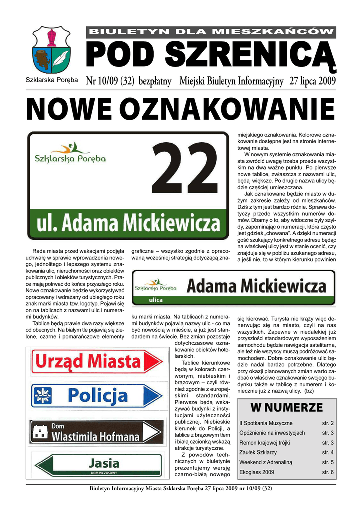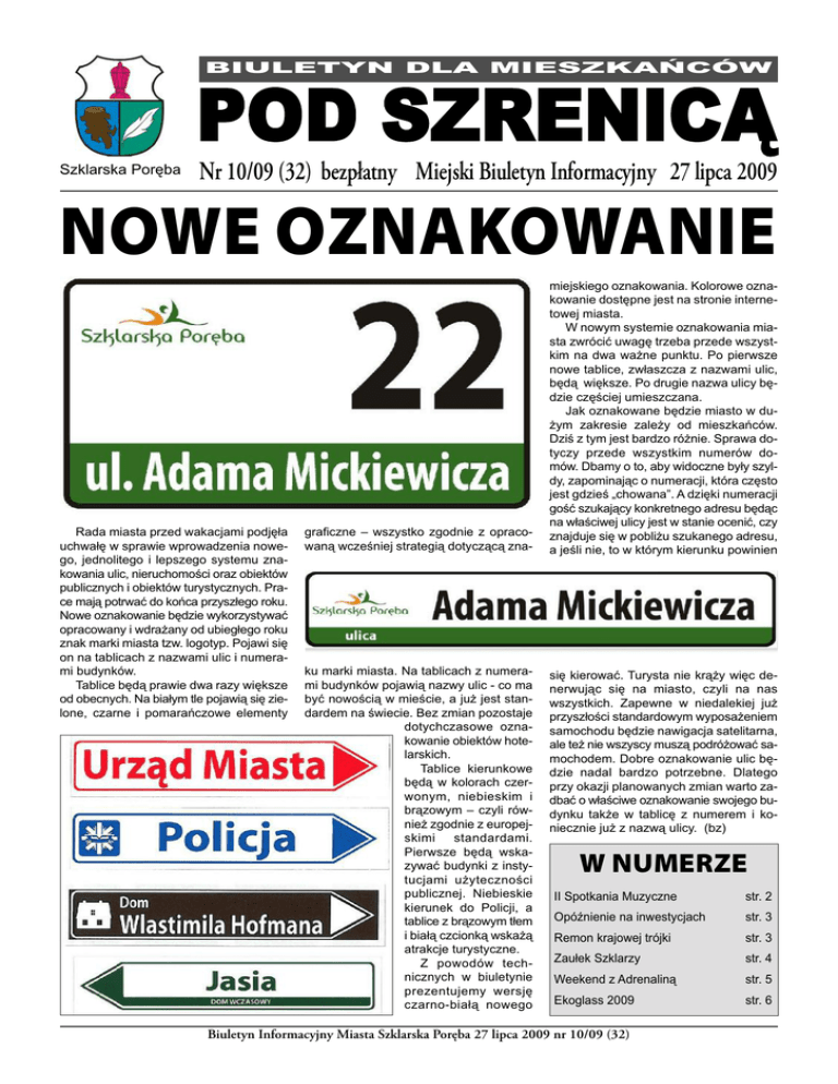 POD SZRENICĄ BIULETYN DLA MIESZKAŃCÓW Szklarska Poręba Nr 10/09 (32) bezpłatny Miejski Biuletyn Informacyjny 27 lipca 2009 NOWE OZNAKOWANIE Rada miasta przed wakacjami podjęła uchwałę w sprawie wprowadzenia nowego, jednolitego i lepszego systemu znakowania ulic, nieruchomości oraz obiektów publicznych i obiektów turystycznych. Prace mają potrwać do końca przyszłego roku. Nowe oznakowanie będzie wykorzystywać opracowany i wdrażany od ubiegłego roku znak marki miasta tzw. logotyp. Pojawi się on na tablicach z nazwami ulic i numerami budynków. Tablice będą prawie dwa razy większe od obecnych. Na białym tle pojawią się zielone, czarne i pomarańczowe elementy graficzne – wszystko zgodnie z opracowaną wcześniej strategią dotyczącą zna- ku marki miasta. Na tablicach z numerami budynków pojawią nazwy ulic - co ma być nowością w mieście, a już jest standardem na świecie. Bez zmian pozostaje dotychczasowe oznakowanie obiektów hotelarskich. Tablice kierunkowe będą w kolorach czerwonym, niebieskim i brązowym – czyli również zgodnie z europejskimi standardami. Pierwsze będą wskazywać budynki z instytucjami użyteczności publicznej. Niebieskie kierunek do Policji, a tablice z brązowym tłem i białą czcionką wskażą atrakcje turystyczne. Z powodów technicznych w biuletynie prezentujemy wersję czarno-białą nowego miejskiego oznakowania. Kolorowe oznakowanie dostępne jest na stronie internetowej miasta. W nowym systemie oznakowania miasta zwrócić uwagę trzeba przede wszystkim na dwa ważne punktu. Po pierwsze nowe tablice, zwłaszcza z nazwami ulic, będą większe. Po drugie nazwa ulicy będzie częściej umieszczana. Jak oznakowane będzie miasto w dużym zakresie zależy od mieszkańców. Dziś z tym jest bardzo różnie. Sprawa dotyczy przede wszystkim numerów domów. Dbamy o to, aby widoczne były szyldy, zapominając o numeracji, która często jest gdzieś „chowana”. A dzięki numeracji gość szukający konkretnego adresu będąc na właściwej ulicy jest w stanie ocenić, czy znajduje się w pobliżu szukanego adresu, a jeśli nie, to w którym kierunku powinien się kierować. Turysta nie krąży więc denerwując się na miasto, czyli na nas wszystkich. Zapewne w niedalekiej już przyszłości standardowym wyposażeniem samochodu będzie nawigacja satelitarna, ale też nie wszyscy muszą podróżować samochodem. Dobre oznakowanie ulic będzie nadal bardzo potrzebne. Dlatego przy okazji planowanych zmian warto zadbać o właściwe oznakowanie swojego budynku także w tablicę z numerem i koniecznie już z nazwą ulicy. (bz) W NumErZE II Spotkania Muzyczne str. 2 Remon krajowej trójki str. 3 Opóźnienie na inwestycjach str. 3 Zaułek Szklarzy str. 4 Ekoglass 2009 str. 6 Weekend z Adrenaliną Biuletyn Informacyjny Miasta Szklarska Poręba 27 lipca 2009 nr 10/09 (32) str. 5 KOmuNIKATY II SPOTKANIA muZYCZNE W dniach 01- 06 lipca 2009 w Szklarskiej Porębie gościliśmy Chór Eksperymentalny Szkoły Muzycznej z Warszawy oraz dwa zespoły chóralne z Ukrainy oraz Pieśni i Tańca z Białorusi. Pierwsze spotkanie zostało zainaugurowane 01 lipca w sali Urzędu Miejskiego w Szklarskiej Porębie. Zespoły wystąpiły również w sąsiednich miastach: Świeradowie, Piechowicach, Wojcieszycach i Cieplicach. Tematyką II Spotkań Muzycznych obok mu- zyki sakralnej, świeckiej i dawnej jest także muzyka filmowa i współczesna. Wykonawcami utworów jest młodzież biorąca udział we wszystkich koncertach i konkursach krajowych i międzynarodowych. Instrumenty na których zagrają to m.in. : fortepian, gitara, harfa czy organy. Nad przebiegiem i realizacją koncertów czuwała pani Ewa Marchwicka – dyrygent z Akademii Muzycznej w Warszawie. (MOKSiAL) POLONIA Z BIAŁOruSI I uKrAINY POD SZrENICĄ W dniach 30.06 – 09.07. 2009 r. w Szklarskiej Porębie gościliśmy zespoły polonijne z Białorusi i Ukrainy. W różnych miejscach miasta przez kilka dni mieliśmy okazję podziwiać zdolności taneczne i wokalne pięciu zespołów ze Wschodu. Prezentowany repertuar był bardzo zróżnicowany pod względem artystycznym. Wystąpiły dwa zespoły taneczne „Kwiat Bukowiny” i „Białe Skrzydła”. Wdzięk i urok młodych tancerzy oraz profesjonalne stroje za każdym razem wzbogacały występy wykonawców w charakterystycznych tańcach ludowych polskich, ukraińskich, białoruskich i rumuńskich. Zespoły chóralne i estradowe w swoich wykonaniach przybliżyły Nam polską kulturę kresową przeplataną z elementami tradycji białoruskiej i ukraińskiej. W repertuarze pojawiły się przede wszystkim pieśni patriotyczne, ludowe oraz wykonania współczesne. Po udanych występach goście zachwycali się naszym regionem podczas górskich wycieczek. (MOKSiAL) TurNIEJE SZACHOWE I rOZGrYWKI TENISA STOŁOWEGO Pierwszy turniej szachowy i turniej tenisa stołowego odbył się 13 czerwca podczas tegorocznej imprezy „Bawmy się razem” w Parku Miejskim Esplanada. Zmagania sportowe trwały nieprzerwalnie ok. 6 godzin. Zawodnicy walczyli bardzo ambitnie i do końca. Mimo lekkiego wiatru, utrudniającego grę, turnieje przyniosły sporą satysfakcję. Wychodząc naprzeciw rosnącemu zapotrzebowaniu i zainteresowaniu rozgrywkami wśród dużej rzeszy lo- kalnych „sportowców”, postanowiliśmy turnieje zorganizować w Miejskim Ośrodku Kultury, Sportu i Aktywności Lokalnej. Wszystkich chętnych do wzięcia udziału w zajęciach zapraszamy w każdą środę w godzinach 16:00 – 18:00. Organizator : Moksial Kontakt: Mirosław Tecław – Tel. 075 717 36 14, 503 155 241 e:mail: [email protected] (MOKSiAL) I mArATON KArKONOSKI 01.08.09 PIĘKNO KArKONOSZY W BIEGu…. 1 sierpnia odbędzie się I Maraton Karkonoski. Po raz pierwszy w historii uczestnicy maratonu będą zmagali się z siłami nieprzewidywalnych Karkonoszy i własnymi słabościami w biegu na dystansie ok.43 km. Trasa prowadzi grzbietem Karkonoszy: Szrenica – Śnieżka – Szreni
