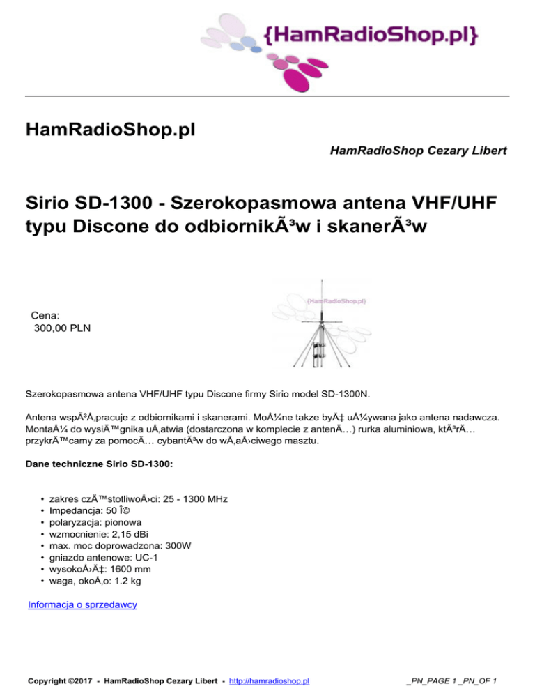 HamRadioShop.pl HamRadioShop Cezary Libert Sirio SD-1300 - Szerokopasmowa antena VHF/UHF typu Discone do odbiorników i skanerów Cena: 300,00 PLN Szerokopasmowa antena VHF/UHF typu Discone firmy Sirio model SD-1300N. Antena współpracuje z odbiornikami i skanerami. Możne takze być używana jako antena nadawcza. Montaż do wysiÄ™gnika uÅ‚atwia (dostarczona w komplecie z antenÄ…) rurka aluminiowa, którÄ… przykrÄ™camy za pomocÄ… cybantów do wÅ‚aÅ›ciwego masztu. Dane techniczne Sirio SD-1300: • • • • • • • • zakres czÄ™stotliwoÅ›ci: 25 - 1300 MHz Impedancja: 50 Ω polaryzacja: pionowa wzmocnienie: 2,15 dBi max. moc doprowadzona: 300W gniazdo antenowe: UC-1 wysokość: 1600 mm waga, okoÅ‚o: 1.2 kg Informacja o sprzedawcy Copyright ©2017 - HamRadioShop Cezary Libert - http://hamradioshop.pl _PN_PAGE 1 _PN_OF 1