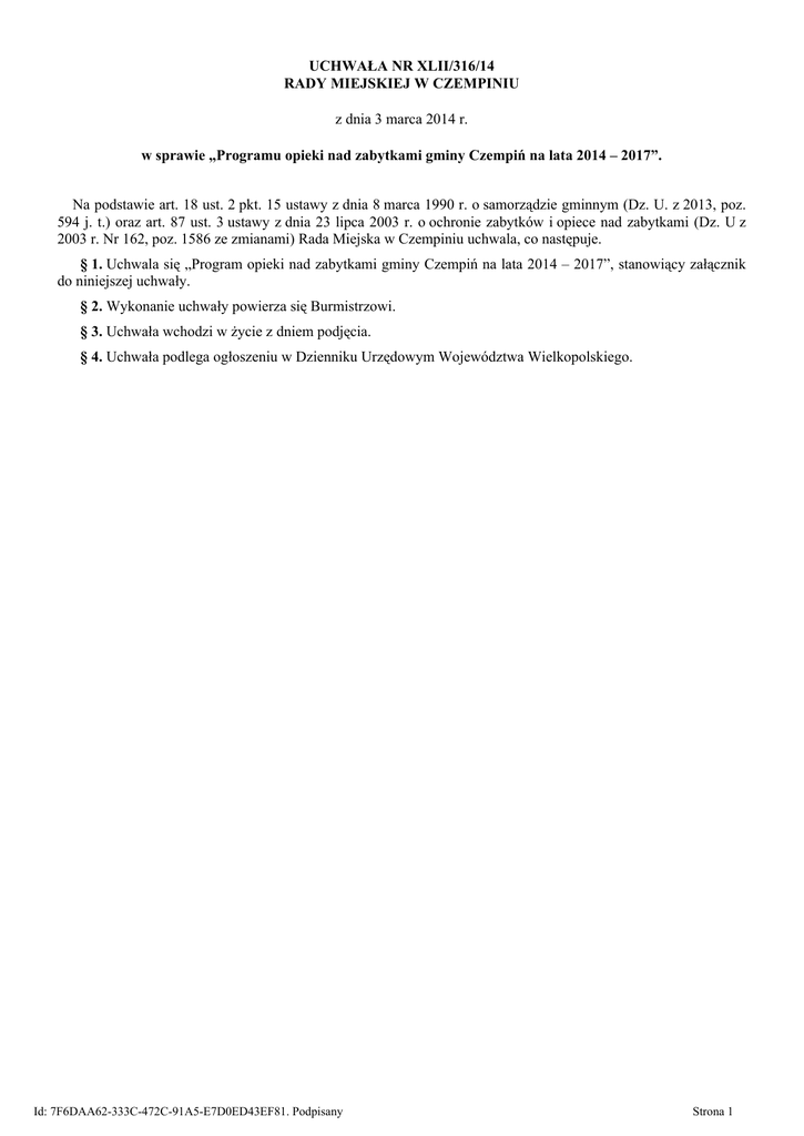 UCHWAŁA NR XLII/316/14 RADY MIEJSKIEJ W CZEMPINIU z dnia 3 marca 2014 r. w sprawie „Programu opieki nad zabytkami gminy Czempiń na lata 2014 – 2017”. Na podstawie art. 18 ust. 2 pkt. 15 ustawy z dnia 8 marca 1990 r. o samorządzie gminnym (Dz. U. z 2013, poz. 594 j. t.) oraz art. 87 ust. 3 ustawy z dnia 23 lipca 2003 r. o ochronie zabytków i opiece nad zabytkami (Dz. U z 2003 r. Nr 162, poz. 1586 ze zmianami) Rada Miejska w Czempiniu uchwala, co następuje. § 1. Uchwala się „Program opieki nad zabytkami gminy Czempiń na lata 2014 – 2017”, stanowiący załącznik do niniejszej uchwały. § 2. Wykonanie uchwały powierza się Burmistrzowi. § 3. Uchwała wchodzi w życie z dniem podjęcia. § 4. Uchwała podlega ogłoszeniu w Dzienniku Urzędowym Województwa Wielkopolskiego. Id: 7F6DAA62-333C-472C-91A5-E7D0ED43EF81. Podpisany Strona 1 Załącznik do uchwały Nr XLII/316/14 Rady Miejskiej w Czempiniu z dnia 3 marca 2014r. PROGRAM OPIEKI NAD ZABYTKAMI GMINY CZEMPIŃ NA LATA 2014 -2017 CZEMPIŃ 2013 Id: 7F6DAA62-333C-472C-91A5-E7D0ED43EF81. Podpisany Strona 2 SPIS TREŚCI str. 1. Wstęp 1.1. Położenie i krótka charakterystyka gminy………………………………5 1.2. Cel opracowania gminnego programu opieki nad zabytkami………...8 1.3. Podstawa prawna opracowania gminnego programu opieki nad zabytkami……………………………………………………………...8 2. Uwarunkowania zewnętrzne ochrony zasobów dziedzictwa kulturowego 2.1. Relacje gminnego programu opieki nad zabytkami z opracowaniami wykonanymi na poziomie województwa……………………………....10 2.1.1 Strategia rozwoju województwa wielkopolskiego…………………….10 2.1.2. Plan zagospodarowania przestrzennego województwa wielkopolskiego………………………………………………………….12 2.1.3. Inne dokumenty o zasięgu województwa, których problematyka związana jest z dziedzictwem kulturowym…………………………...16 3. Zasoby dziedzictwa i krajobrazu kulturowego gminy 3.1. Obiekty zabytkowe nieruchome o najwyższym znaczeniu dla gminy wpisane do rejestru zabytków………………………………………….17 3.2. Wykaz obiektów zabytkowych nieruchomych znajdujących się w gminnej ewidencji zabytków…………………………………………20 3.3. Zespoły najcenniejszych zabytków ruchomych na terenie gminy….26 3.4. Krajobraz kulturowy – obszarowe wpisy do rejestru zabytków (układy urbanistyczne, parki kulturowe, parki krajobrazowe)………27 3.5. Zabytki archeologiczne…………………………………………………29 3.5.1. Wykaz stanowisk archeologicznych wpisanych do rejestru zabytków z terenu gminy…………………………………………………………..29 3.5.2. Wykaz stanowisk o własnej formie krajobrazowej………………….29 3.5.3. Zestawienie liczbowe stanowisk archeologicznych zewidencjonowanych i wpisanych do rejestru zabytków, łącznie z ich funkcją oraz krótką analizą chronologiczną (opis koncentracji stanowisk archeologicznych – uwarunkowania fizjograficzne)……………….29 2 Id: 7F6DAA62-333C-472C-91A5-E7D0ED43EF81. Podpisany Strona 3 4. Uwarunkowania wewnętrzne ochrony zasobów dziedzictwa i krajobrazu kulturowego 4.1. Stan zachowania i obszary największego zagrożenia zabytków…35 4.1.1. Stan zachowania zabytków nieruchomych wpisanych do rejestru zabytków………………………………………………………………..35 4.1.2. Stan zachowania zabytków ruchomych……………………………..47 4.1.3. Stan zachowania zabytków archeologicznych oraz istotne zagrożenia dla zabytków archeologicznych…………………………48 4.1.4. Obszary największego zagrożenia dla zabytków w gminie……….50 4.2. Uwarunkowania wynikające ze Studium uwarunkowań i kierunków zagospodarowania przestrzennego gminy …………………………..53 4.3. Uwarunkowania wynikające z miejscowych planów zagospodarowania przestrzennego gminy……………………………………………………57 4.4. Uwarunkowania wynikające z ochrony przyrody i równowagi ekologicznej………………………………………………………………58 5. Cele gminnego programu opieki nad zabytkami (art. 87 ustawy z dnia 23 lipca 2003 r. o ochronie zabytków i opiece nad zabytkami oraz inne określone przez gminę)………………………………………60 6. Kierunki działań dla realizacji gminnego programu opieki nad zabytkami……………………………………………………………………61 6.1. Gminna ewidencja zabytków…………………………………………..61 6.1.1. Sporządzenie gminnej ewidencji zabytków nieruchomych…………61 6.1.2. Sporządzenie gminnej ewidencji zabytków archeologicznych……..61 6.1.3. Inwentaryzacja obiektów tzw. małej architektury…………………….62 6.2. Edukacja i promocja w zakresie ochrony zabytków…………………62 6.3. Działania zmierzające do poprawy stanu zachowania dziedzictwa kulturowego……………………………………………………………...63 6.4. Określenie zasobów zabytkowych, które można wykorzystać dla tworzenia np. tras turystycznych, ścieżek dydaktycznych, organizacji festynów……………………………………………………………………63 6.5. Określenie sposobu realizacji poszczególnych celów gminnego programu opieki nad zabytkami…………………………………………66 7. Instrumentarium realizacji gminnego programu opieki nad zabytkami…………………………………………………………………...67 3 Id: 7F6DAA62-333C-472C-91A5-E7D0ED43EF81. Podpisany Strona 4 8. Monitoring działania gminnego programu opieki nad zabytkami...68 9. Niektóre zewnętrzne źródła finansowania gminnego programu opieki nad zabytkami ……………………………………………………..69