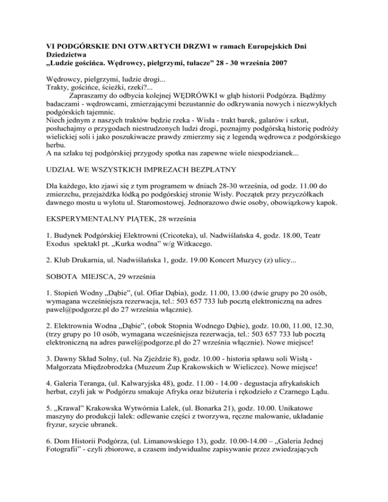 VI PODGÓRSKIE DNI OTWARTYCH DRZWI w ramach Europejskich Dni Dziedzictwa „Ludzie gościńca. Wędrowcy, pielgrzymi, tułacze” 28 - 30 września 2007 Wędrowcy, pielgrzymi, ludzie drogi... Trakty, gościńce, ścieŜki, rzeki?... Zapraszamy do odbycia kolejnej WĘDRÓWKI w głąb historii Podgórza. Bądźmy badaczami - wędrowcami, zmierzającymi bezustannie do odkrywania nowych i niezwykłych podgórskich tajemnic. Niech jednym z naszych traktów będzie rzeka - Wisła - trakt barek, galarów i szkut, posłuchajmy o przygodach niestrudzonych ludzi drogi, poznajmy podgórską historię podróŜy wielickiej soli i jako poszukiwacze prawdy zmierzmy się z legendą wędrowca z podgórskiego herbu. A na szlaku tej podgórskiej przygody spotka nas zapewne wiele niespodzianek... UDZIAŁ WE WSZYSTKICH IMPREZACH BEZPŁATNY Dla kaŜdego, kto zjawi się z tym programem w dniach 28-30 września, od godz. 11.00 do zmierzchu, przejaŜdŜka łódką po podgórskiej stronie Wisły. Początek przy przyczółkach dawnego mostu u wylotu ul. Staromostowej. Jednorazowo dwie osoby, obowiązkowy kapok. EKSPERYMENTALNY PIĄTEK, 28 września 1. Budynek Podgórskiej Elektrowni (Cricoteka), ul. Nadwiślańska 4, godz. 18.00, Teatr Exodus spektakl pt. „Kurka wodna” w/g Witkacego. 2. Klub Drukarnia, ul. Nadwiślańska 1, godz. 19.00 Koncert Muzycy (z) ulicy... SOBOTA MIEJSCA, 29 września 1. Stopień Wodny „Dąbie”, (ul. Ofiar Dąbia), godz. 11.00, 13.00 (dwie grupy po 20 osób, wymagana wcześniejsza rezerwacja, tel.: 503 657 733 lub pocztą elektroniczną na adres [email protected] do 27 września włącznie). 2. Elektrownia Wodna „Dąbie”, (obok Stopnia Wodnego Dąbie), godz. 10.00, 11.00, 12.30, (trzy grupy po 10 osób, wymagana wcześniejsza rezerwacja, tel.: 503 657 733 lub pocztą elektroniczną na adres [email protected] do 27 września włącznie). Nowe miejsce! 3. Dawny Skład Solny, (ul. Na Zjeździe 8), godz. 10.00 - historia spławu soli Wisłą Małgorzata Międzobrodzka (Muzeum śup Krakowskich w Wieliczce). Nowe miejsce! 4. Galeria Teranga, (ul. Kalwaryjska 48), godz. 11.00 - 14.00 - degustacja afrykańskich herbat, czyli jak w Podgórzu smakuje Afryka oraz biŜuteria i rękodzieło z Czarnego Lądu. 5. „Krawal” Krakowska Wytwórnia Lalek, (ul. Bonarka 21), godz. 10.00. Unikatowe maszyny do produkcji lalek: odlewanie części z tworzywa, ręczne malowanie, układanie fryzur, szycie ubranek. 6. Dom Historii Podgórza, (ul. Limanowskiego 13), godz. 10.00-14.00 – „Galeria Jednej Fotografii” - czyli zbiorowe, a czasem indywidualne zapisywanie przez zwiedzających wspomnień, historii, a nawet plotek na temat związany z głównym, archiwalnym zdjęciem wystawy. Początek nowego cyklu wystaw w Domu Historii mający stworzyć Kronikę fotograficzną wraz z zapiskami". 7. Galeria “Rękawka”, (ul. Limanowskiego 13), godz. 11.00-18.00 wystawa “Znane i nieznane zaułki Podgórza”, godz. 14.00-18.00 “Zaprojektuj i pomaluj Drzwi Otwartych Dni” - warsztaty plastyczne dla kaŜdego. 8. Spółdzielnia Pracy Rękodzieła Artystycznego „Wanda”, (ul. Rękawka 32), godz. 11.00 13.30. Gobeliny, kilimy i makaty, czyli - pokazy sztuki tkactwa artystycznego. 9. Galeria Lach Antyki (Rynek Podgórski 2/5), godz. 11.00 - 13.00. Najstarsza w Krakowie działająca nieprzerwanie od 1950 roku pracownia renowacji mebli antycznych. “Opowieści z myszką czyli rzecz o charakterze, indywidualnościach i pięknie mebli antycznych z kolekcji Galerii”. 10. Uzdrowisko Mateczny - Day spa, (ul. Rydlówka 8), godz.11.00 - o przeszłości i czasie obecnym uzdrowiska, oprowadzanie Ela Lang. 11. „Format” - Sztukaterie gipsowe, (ul. Limanowskiego 48), godz. 12.30 i 14.00 - pokaz tajników sztuki tworzenia sztukaterii gipsowych. 12. Pracownia Pozłotnicza „Ossolin Art.”, (ul. Węgierska 13), godz. 13.30 i 14.30 - sztuka złocenia ram, konserwacji obrazów oraz zwiedzanie zakamarków pracowni. 13. Galeria Adaptator (ul. Krakusa 10), godz.14.30, Azjatyckie wędrówki z podgórskim etnografem – spotkanie z dr Januszem Kamockim. 14. Cafe RęKawka, (ul. Brodzińskiego 4b), godz. 14.30 - 17.00, wędrówka za aromatem kawy, znad Wisły, z Podgórza - do Afryki, na Hawaje, do Ameryki Łacińskiej i do Azji. Rozmowy wokół kawy o kawie - przy kawie i kawowym ciastku. 15. „Apteka pod Orłem”, Muzeum Historyczne Miasta Krakowa (Pl. Bohaterów Getta 18), godz. 15.00 - historia getta w Podgórzu - oprowadzanie po ekspozycji oraz krótki spacer Małgorzata Polzer. 16. Kościół św. Józefa, (Rynek Podgórski), godz. 12.00, 12.30, 13.00, 13.30 - wyjście na wieŜę oraz zwiedzanie kamieniołomu im. Jana Pawła II. Nowe Miejsce! 17. Dawna Lodownia, Miejska, Zespół Szkół Gastronomicznych nr 2 im. Odona Bujwida, (ul. Zamojskiego 6), godz. 14.00 i 15.00 - licząca 130 lat lodownia miejska i inne tajemnice najstarszej Szkoły Gastronomicznej w Krakowie - oprowadzanie Adam Dziedzic. 18. Dom „POD LIPKAMI”, (ul. Zamojskiego 18), godz. 14.00 - 16.00, jeden z najstarszych budynków Podgórza (istniał juŜ na pewno w 1779 r.). Wejście na poddasze, podwórze oraz do niewielkiej lodowni wykutej w skałach, dla odwaŜnych teŜ do piwnicy. Zapraszają Państwo Janina Rehman i Stanisław Jerzy Tomasz. Nowe Miejsce! 19. Budynek Podgórskiej Elektrowni (Cricoteka), (ul. Nadwiślańska 4), godz. 17.00 "Kijem Wisły zawracanie, czyli o co się flisak z flisakiem pokłócić potrafi” - rzecz o barkach, galarach, szkutach i krypach. Otwarcie wystawy „Bulwary Wiślane”, przygotowanej przez Muzeum InŜynierii Miejskiej. Bulwary Wiślane - Waldemar Brzoskwinia (Muzeum InŜynierii Miejskiej), Parostatkiem po Wiśle - Zbigniew Siedlarz (Stowarzyszenie Miłośników Ziemi Niepołomickiej), Tradycje flisackie i obecne moŜliwości Ŝeglugi na Wiśle - Jarosław KałuŜa i Józef Ratajczak (www.flis.info), Galary, barki, statki górnej Wisły od XIX do dziś oraz Statki Flisa - Bolesław Rybarczyk. Plenerowa pre