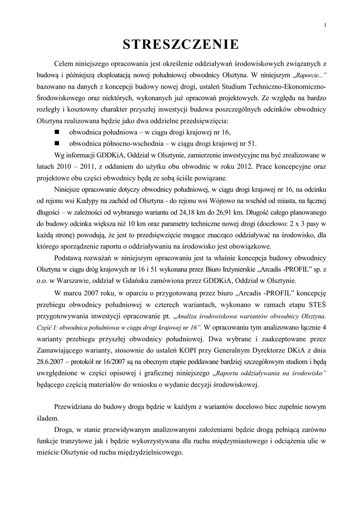 I STRESZCZENIE Celem niniejszego opracowania jest określenie oddziaływań środowiskowych związanych z budową i późniejszą eksploatacją nowej południowej obwodnicy Olsztyna. W niniejszym „Raporcie...” bazowano na danych z koncepcji budowy nowej drogi, ustaleń Studium Techniczno-EkonomicznoŚrodowiskowego oraz niektórych, wykonanych już opracowań projektowych. Ze względu na bardzo rozległy i kosztowny charakter przyszłej inwestycji budowa poszczególnych odcinków obwodnicy Olsztyna realizowana będzie jako dwa oddzielne przedsięwzięcia: obwodnica południowa – w ciągu drogi krajowej nr 16, obwodnica północno-wschodnia – w ciągu drogi krajowej nr 51. Wg informacji GDDKiA, Oddział w Olsztynie, zamierzenie inwestycyjne ma być zrealizowane w latach 2010 – 2011, z oddaniem do użytku obu obwodnic w roku 2012. Prace koncepcyjne oraz projektowe obu części obwodnicy będą ze sobą ściśle powiązane. Niniejsze opracowanie dotyczy obwodnicy południowej, w ciągu drogi krajowej nr 16, na odcinku od rejonu wsi Kudypy na zachód od Olsztyna - do rejonu wsi Wójtowo na wschód od miasta, na łącznej długości – w zależności od wybranego wariantu od 24,18 km do 26,91 km. Długość całego planowanego do budowy odcinka większa niż 10 km oraz parametry techniczne nowej drogi (docelowo: 2 x 3 pasy w każdą stronę) powodują, że jest to przedsięwzięcie mogące znacząco oddziaływać na środowisko, dla którego sporządzenie raportu o oddziaływaniu na środowisko jest obowiązkowe. Podstawą rozważań w niniejszym opracowaniu jest ta właśnie koncepcja budowy obwodnicy Olsztyna w ciągu dróg krajowych nr 16 i 51 wykonana przez Biuro Inżynierskie „Arcadis -PROFIL” sp. z o.o. w Warszawie, oddział w Gdańsku zamówiona przez GDDKiA, Oddział w Olsztynie. W marcu 2007 roku, w oparciu o przygotowaną przez biuro „Arcadis -PROFIL” koncepcję przebiegu obwodnicy południowej w czterech wariantach, wykonano w ramach etapu STEŚ przygotowywania inwestycji opracowanie pt. „Analiza środowiskowa wariantów obwodnicy Olsztyna. Część I: obwodnica południowa w ciągu drogi krajowej nr 16”. W opracowaniu tym analizowano łącznie 4 warianty przebiegu przyszłej obwodnicy południowej. Dwa wybrane i zaakceptowane przez Zamawiającego warianty, stosownie do ustaleń KOPI przy Generalnym Dyrektorze DKiA z dnia 28.6.2007 – protokół nr 16/2007 są na obecnym etapie poddawane bardziej szczegółowym studiom i będą uwzględnione w części opisowej i graficznej niniejszego „Raportu oddziaływania na środowisko” będącego częścią materiałów do wniosku o wydanie decyzji środowiskowej. Przewidziana do budowy droga będzie w każdym z wariantów docelowo biec zupełnie nowym śladem. Droga, w stanie przewidywanym analizowanymi założeniami będzie drogą pełniącą zarówno funkcje tranzytowe jak i będzie wykorzystywana dla ruchu międzymiastowego i odciążenia ulic w mieście Olsztynie od ruchu międzydzielnicowego. II Opisując korzyści wynikające z budowy obwodnicy Olsztyna jako nowego odcinka DK 16 (wariant inwestycyjny) należy w szczególności podkreślić następujące aspekty przemawiające za realizacją przedsięwzięcia, takie jak: Poprawa bezpieczeństwa ruchu drogowego. Poprawa płynności ruchu. Większa płynność ruchu wpływa istotnie na zmniejszenie negatywnych skutków ruchu drogowego (hałas, szkodliwe związki chemiczne itd.). Zwiększenie przepustowości dróg wylotowych i ulic miejskich. Skrócenie czasu podróży i uzyskanie większej płynności ruchu a w związku z tym ograniczenie zużycia paliwa przez pojazdy. Po oddaleniu części strumienia pojazdów poza obszar zwartej zabudowy miasta zmniejszenie presji akustycznej i wibracji na liczne budynki mieszkalne. Oczyszczanie ścieków deszczowych spływających z drogi do wód powierzchniowych. Realizacja postulatów społecznych dotyczących budowy obwodnicy Olsztyna W „Raporcie...” przeanalizowano następujące warianty: wariant „ZERO” – bezinwestycyjny oraz dwa warianty inwestycyjne, proponowane w analizowanej koncepcji budowlanej Biura Arcadis-Profil i zalecony przez KOPI – wariant II (niebieski) i wariant III (czerwony). Jak wynika z zawartych w opracowaniu analiz aktualnego stanu układu komunikacyjnego w mieście – możliwości przepustowości ulic, przy niepodejmowaniu przedsięwzięcia (wariant „ZERO”), przy prognozowanym wzroście natężenia ruchu, nastąpi dalsze pogarszanie sytuacji komunikacyjnej w mieście. Zbyt duże, jak na obecne możliwości istniejących ulic natężenia ruchu pojazdów, w tym ciężkich, związanych także z ruchem tranzytowym, powodują pogarszanie się stanu nawierzchni na tych ulicach oraz ich „korkowanie się”, zwłaszcza w godzinach szczytu. W przypadku pozostania przy wariancie bezinwestycyjnym, nastąpi dalszy spadek przepustowości, niszczenie nawierzchni a wraz z tym wzrost ponadnormatywnego klimatu akustycznego. Będzie się pogarszał komfort podróżowania, istniejący stan drogi nie zapewni należytego bezpieczeństwa jej użytkownikom. Obecnie brak wzdłuż większości głównych ciągów komunikacyjnych w mieście zabezpieczeń akustycznych budynków sąsiadujących z tymi ulicami i pozostawienie układu komunikacyjnego w stanie istniejącym będzie powiększać negatywne oddziaływania na tę zabudowę. Dlatego zachowanie wariantu „Zero” – jako szkodliwego środowiskowo i nie spełniającego odpowiednio swych funkcji komunikacyjnych, nie powinno być brane pod uwagę. Zwraca się uwagę, że budowa obwodnicy poprawi, jak wynika z analiz ruchowych warunki podróżowania w całym mieście. W przypadku wyboru jakiegokolwiek wariantu „inwestycyjnego” przewiduje się następujący zakres inwestycji: budowa nowej drogi o profilu docelowo dwujezdniowym, docelowo dla każdej jezdni trzypasmowym z utwardzonymi poboczami i poboczami gruntowymi; budowa dróg serwisowych wzdłuż ni