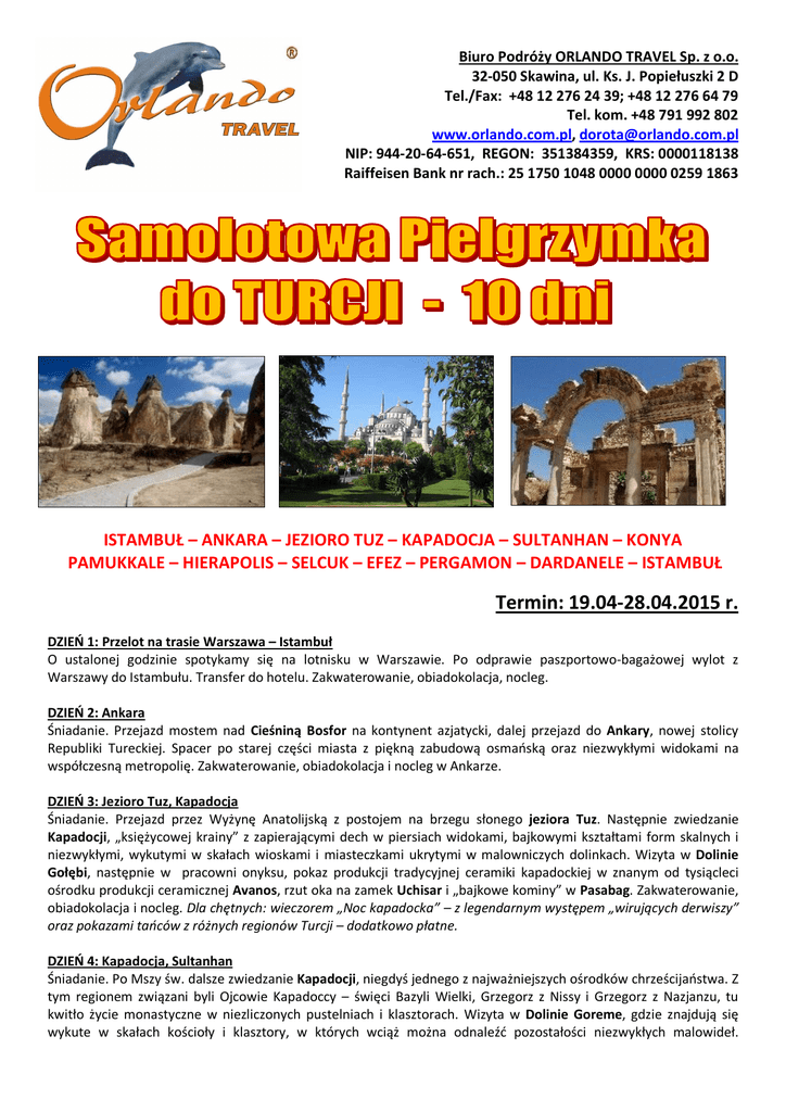 Biuro Podróży ORLANDO TRAVEL Sp. z o.o. 32-050 Skawina, ul. Ks. J. Popiełuszki 2 D Tel./Fax: +48 12 276 24 39; +48 12 276 64 79 Tel. kom. +48 791 992 802 www.orlando.com.pl, [email protected] NIP: 944-20-64-651, REGON: 351384359, KRS: 0000118138 Raiffeisen Bank nr rach.: 25 1750 1048 0000 0000 0259 1863 ISTAMBUŁ – ANKARA – JEZIORO TUZ – KAPADOCJA – SULTANHAN – KONYA PAMUKKALE – HIERAPOLIS – SELCUK – EFEZ – PERGAMON – DARDANELE – ISTAMBUŁ Termin: 19.04-28.04.2015 r. DZIEŃ 1: Przelot na trasie Warszawa – Istambuł O ustalonej godzinie spotykamy się na lotnisku w Warszawie. Po odprawie paszportowo-bagażowej wylot z Warszawy do Istambułu. Transfer do hotelu. Zakwaterowanie, obiadokolacja, nocleg. DZIEŃ 2: Ankara Śniadanie. Przejazd mostem nad Cieśniną Bosfor na kontynent azjatycki, dalej przejazd do Ankary, nowej stolicy Republiki Tureckiej. Spacer po starej części miasta z piękną zabudową osmańską oraz niezwykłymi widokami na współczesną metropolię. Zakwaterowanie, obiadokolacja i nocleg w Ankarze. DZIEŃ 3: Jezioro Tuz, Kapadocja Śniadanie. Przejazd przez Wyżynę Anatolijską z postojem na brzegu słonego jeziora Tuz. Następnie zwiedzanie Kapadocji, „księżycowej krainy” z zapierającymi dech w piersiach widokami, bajkowymi kształtami form skalnych i niezwykłymi, wykutymi w skałach wioskami i miasteczkami ukrytymi w malowniczych dolinkach. Wizyta w Dolinie Gołębi, następnie w pracowni onyksu, pokaz produkcji tradycyjnej ceramiki kapadockiej w znanym od tysiącleci ośrodku produkcji ceramicznej Avanos, rzut oka na zamek Uchisar i „bajkowe kominy” w Pasabag. Zakwaterowanie, obiadokolacja i nocleg. Dla chętnych: wieczorem „Noc kapadocka” – z legendarnym występem „wirujących derwiszy” oraz pokazami tańców z różnych regionów Turcji – dodatkowo płatne. DZIEŃ 4: Kapadocja, Sultanhan Śniadanie. Po Mszy św. dalsze zwiedzanie Kapadocji, niegdyś jednego z najważniejszych ośrodków chrześcijaństwa. Z tym regionem związani byli Ojcowie Kapadoccy – święci Bazyli Wielki, Grzegorz z Nissy i Grzegorz z Nazjanzu, tu kwitło życie monastyczne w niezliczonych pustelniach i klasztorach. Wizyta w Dolinie Goreme, gdzie znajdują się wykute w skałach kościoły i klasztory, w których wciąż można odnaleźć pozostałości niezwykłych malowideł. Biuro Podróży ORLANDO TRAVEL Sp. z o.o. 32-050 Skawina, ul. Ks. J. Popiełuszki 2 D Tel./Fax: +48 12 276 24 39; +48 12 276 64 79 Tel. kom. +48 791 992 802 www.orlando.com.pl, [email protected] NIP: 944-20-64-651, REGON: 351384359, KRS: 0000118138 Raiffeisen Bank nr rach.: 25 1750 1048 0000 0000 0259 1863 Następnie przejazd w stronę Konya z krótkim postojem w Sultanhan, fantastycznie zachowanym tureckim karawanseraju. Zakwaterowanie, obiadokolacja i nocleg w Konya. DZIEŃ 5: Konya Śniadanie. Wizyta w centrum dawnego antycznego Ikonium, miasta do którego przybył i głosił Dobrą Nowinę o Chrystusie święty Paweł, dziś tętniącego życiem tureckiego Konya. Miasto w średniowieczu stało się stolicą seldżuckiego sułtanatu Rumu, czego pozostałością jest tutejszy meczet sułtana Aladyna. Msza św. w kościele św. Pawła, jedynym miejscu upamiętniającym działalność Apostoła w Ikonium. Następnie wizyta w Muzeum Mevlany, znajdującym się w dawnym klasztorze „wirujących derwiszów”, będącym jednym z najważniejszych miejsc kultu dla wyznawców islamu. Zakwaterowanie, obiadokolacja i nocleg w Pamukkale. DZIEŃ 6: Pamukkale, Hierapolis , Selcuk, Efez Śniadanie. Spacer po ruinach starożytnego Hierapolis, starożytnego miasta, które służyło jako „antyczne sanatorium”. Wody z tutejszych źródeł wykorzystywano w celach leczniczych. Pośród popadłych w ruinę budowli znajdują się pozostałości po antycznym martyrium, miejscu męczeńskiej śmierci św. Filipa Apostoła. Następnie wizyta przy słynnych na całym świecie naturalnych „basenach” Pamukkale - Bawełnianego Zamku, cudu natury będącego dziełem tryskających tu gorących źródeł bogatych w związki mineralne. Przejazd do Selcuk, tureckiej wioski, która powstała na obrzeżach starożytnego Efezu. Wizyta w ruinach Bazyliki św. Jana, zbudowanej niegdyś na grobie Apostoła. Następnie zwiedzanie świetnie zachowanych ruin antycznego Efezu, miasta związanego ze św. Janem Ewangelistą oraz św. Pawłem, będącym niegdyś ważnym ośrodkiem chrześcijańskim, miejscem gdzie Sobór efeski ogłosił Maryję Matką Boga. Wizyta w starożytnym teatrze będącego świadkiem działalności apostolskiej św. Pawła. Zakwaterowanie, obiadokolacja i nocleg w ok. Efezu. DZIEŃ 7: Efez, Pergamon Śniadanie. Msza św. w położonym nieopodal Efezu Meryemana – Domku Matki Bożej, miejscu gdzie zgodnie z tutejszą tradycją potwierdzoną wizjami bł. Katarzyny Emmerich Matka Boża miała spędzić ostatnie lata swego życia. Następnie krótka wizyta w starożytnym Pergamonie, jednym z miast, w których św. Jan założył pierwsze wspólnoty chrześcijańskie, znane jako „Siedem Kościołów Apokalipsy”. Przejazd na obiadokolację i nocleg w okolice miasteczka Assos, znanego z odwiedzin św. Pawła. DZIEŃ 8: Dardanele, Istambuł Śniadanie. Przejazd przez krainę zwaną Troadą, przez którą Apostoł Paweł zmierzał w drodze na kontynent europejski. Przeprawa promowa przez Cieśninę Dardanele do Europy, następnie przejazd wzdłuż wybrzeża Morza Marmara do hotelu na obiadokolację i nocleg w Istambule. DZIEŃ 9: Istambuł Rano po śniadaniu zwiedzanie Istambułu jednego z najpiękniejszych miast świata położonego nad Złotym Rogiem na styku dwóch kontynentów u wejścia do Bosforu. Prastare greckie Bizancjum, przekształcone w Nowy Rzym, nazwany ku czci fundatora Konstantynopolem ostatecznie stało się tureckim Istambułem. Wizyta w Świątyni Mądrości Bożej Hagia Sofia, dawnej katedrze Konstantynopola zamienionej przez Turków w meczet. Zwiedzanie pozo