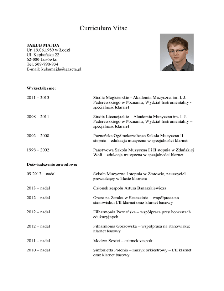 Curriculum Vitae JAKUB MAJDA Ur. 19.06.1989 w Łodzi Ul. Kapitańska 22 62-080 Lusówko Tel. 509-790-934 E-mail: [email protected] Wykształcenie: 2011 – 2013 Studia Magisterskie - Akademia Muzyczna im. I. J. Paderewskiego w Poznaniu, Wydział Instrumentalny specjalność klarnet 2008 – 2011 Studia Licencjackie – Akademia Muzyczna im. I. J. Paderewskiego w Poznaniu, Wydział Instrumentalny – specjalność klarnet 2002 – 2008 Poznańska Ogólnokształcąca Szkoła Muzyczna II stopnia – edukacja muzyczna w specjalności klarnet 1998 – 2002 Państwowa Szkoła Muzyczna I i II stopnia w Zduńskiej Woli – edukacja muzyczna w specjalności klarnet Doświadczenie zawodowe: 09.2013 – nadal Szkoła Muzyczna I stopnia w Złotowie, nauczyciel prowadzący w klasie klarnetu 2013 – nadal Członek zespołu Artura Banaszkiewicza 2012 – nadal Opera na Zamku w Szczecinie – współpraca na stanowisku: I/II klarnet oraz klarnet basowy 2012 – nadal Filharmonia Poznańska – współpraca przy koncertach edukacyjnych 2012 – nadal Filharmonia Gorzowska – współpraca na stanowisku: klarnet basowy 2011 – nadal Modern Sextet – członek zespołu 2010 – nadal Sinfonietta Polonia – muzyk orkiestrowy – I/II klarnet oraz klarnet basowy 2010 – nadal Kwartet Jorgi – współpraca muzyczna 2008 – nadal Orkiestra Miasta Poznania przy MPK – I klarnet oraz klarnet basowy Kursy/szkolenia: 23.11. oraz 7.12.2013 24 - 25.10.2012 22.09.2012 18.07 - 22.08.2012 24 - 26.04.2012 17 - 20.04.2012 22 - 24.10.2008 22 - 23.04.2008 8 - 15.07.2007 29.07 - 4.08.2006 CENSA w Warszawie – Podstawy instrumentacji na szkolne zespoły kameralne – instrumenty dęte Warsztaty Klarnetowo – Saksofonowe w Ostrowie Wielkopolskim, Karel Dohnal – wykładowca Warsztaty Klarnetowe w ZSM w Poznaniu, Kornel Wolak – wykładowca Rodzic Najlepszym Nauczycielem Dziecka – Fundacja SIC Poznań – wykłady edukacyjne dotyczące zagrożeń współczesnego świata wobec dziecka - uzyskanie certyfikatu Mistrzowski Kurs Klarnetowy – wykładowca prof. Algidras Budrys Mistrzowski Kurs Klarnetowy – wykładowca prof. Spyros Mourikis II Mistrzowski Kurs Klarnetowy w Jastrzębiu Zdrój Kurs Mistrzowski – wykładowca Florent Heau (klarnet) V Letnie Kursy Muzyczne w Łebie – wykładowca Wojciech Mrozek (klarnet) IV Letnie Kursy Muzyczne w Łebie – wykładowca Wojciech Mrozek (klarnet) Osiągnięcia: 14 – 18.05.2013 15 – 20.05.2012 10 -14.05.2011 21 – 21.04.2010 3.12.2007 7 – 8.04.2006 1.03.2002 Udział w X Festiwalu Klarnetowym w Piotrkowie Trybunalskim Udział w Ogólnopolskim Konkursie Młodych Muzyków im. Karola Kurpińskiego - XV Akademicki Konkurs Klarnetowy we Włoszakowicach Udział w IX Festiwalu Klarnetowym w Piotrkowie Trybunalskim IV Zachodniopomorski Festiwal Klarnetowy Wyróżnienie z Kwartetem klarnetowym w kategorii zespoły V Makroregionalny Konkurs Instrumentów Dętych „Etiuda 2007” Szczecin Wyróżnienie I stopnia II Zachodniopomorski Festiwal Klarnetowy Szczecin Wyróżnienie II stopnia w Kategorii „Soliści” I Makroregionalny Konkurs Interpretacji Łódź II miejsce Umiejętności: - język angielski w mowie i piśmie na poziomie średnim Zainteresowania: - muzyka kameralna, jazzowa oraz klezmerska - sport (futsal) - książki Wyrażam zgodę na przetwarzanie moich danych osobowych zawartych w przesłanym CV dla potrzeb niezbędnych w procesie rekrutacji, zgodnie z ustawą z dnia 29.08.1997 roku o Ochronie danych Osobowych (Dz.U.Nr. 133 poz.883) Jakub Majda