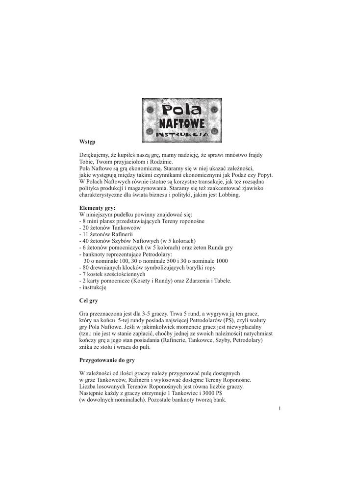 Wstęp Dziękujemy, że kupiłeś naszą grę, mamy nadzieję, że sprawi mnóstwo frajdy Tobie, Twoim przyjaciołom i Rodzinie. Pola Naftowe są grą ekonomiczną. Staramy się w niej ukazać zależności, jakie występują między takimi czynnikami ekonomicznymi jak Podaż czy Popyt. W Polach Naftowych równie istotne są korzystne transakcje, jak też rozsądna polityka produkcji i magazynowania. Staramy się też zaakcentować zjawisko charakterystyczne dla świata biznesu i polityki, jakim jest Lobbing. Elementy gry: W niniejszym pudełku powinny znajdować się: - 8 mini plansz przedstawiających Tereny roponośne - 20 żetonów Tankowców - 11 żetonów Rafinerii - 40 żetonów Szybów Naftowych (w 5 kolorach) - 6 żetonów pomocniczych (w 5 kolorach) oraz żeton Runda gry - banknoty reprezentujące Petrodolary: 30 o nominale 100, 30 o nominale 500 i 30 o nominale 1000 - 80 drewnianych klocków symbolizujących baryłki ropy - 7 kostek sześciościennych - 2 karty pomocnicze (Koszty i Rundy) oraz Zdarzenia i Tabele. - instrukcję Cel gry Gra przeznaczona jest dla 3-5 graczy. Trwa 5 rund, a wygrywa ją ten gracz, który na końcu 5-tej rundy posiada najwięcej Petrodolarów (P$), czyli waluty gry Pola Naftowe. Jeśli w jakimkolwiek momencie gracz jest niewypłacalny (tzn.: nie jest w stanie zapłacić, choćby jednej ze swoich należności) natychmiast kończy grę a jego stan posiadania (Rafinerie, Tankowce, Szyby, Petrodolary) znika ze stołu i wraca do puli. Przygotowanie do gry W zależności od ilości graczy należy przygotować pulę dostępnych w grze Tankowców, Rafinerii i wylosować dostępne Tereny Roponośne. Liczba losowanych Terenów Roponośnych jest równa liczbie graczy. Następnie każdy z graczy otrzymuje 1 Tankowiec i 3000 P$ (w dowolnych nominałach). Pozostałe banknoty tworzą bank. 1 Ilość dostępnych tankowców i rafinerii Gracze wybierają też kolor swoich Szybów Naftowych i biorą 8 żetonów je reprezentujących. Dodatkowo każdy gracz otrzymuje okrągły żeton pomocniczy w kolorze swoich szybów. Służy on do oznaczania bieżących kosztów w Tabeli kosztów. Za każdym razem, gdy zwiększają lub zmniejszają się koszty utrzymania szybów i tankowców gracz przesuwa odpowiedni swój żeton tak, aby wyznaczał on aktualne koszty. Baryłki ropy odkładamy na bok w dostępne dla wszystkich miejsce. Żeton Runda gry kładziemy na 1 toru Rundy gry. Zasady Gra trwa 5 rund, a każda runda, dla usprawnienia rozgrywki, podzielona jest na 10 Faz: 1. Faza Lobbingu ZASADY LICYTACJI 2. Faza Popytu 3. Faza Zdarzenia Losowego 4. Faza Infrastruktury Gracze muszą licytować 5. Faza Licytacji w taki sposób, aby mogli 6. Faza Wydobycia wpłacić zalicytowane 7. Faza Zaopatrzenia Rafinerii kwoty. Minimalną kwotą 8. Faza Opłat licytacji jest 100 P$, 9. Faza Giełdy i wielokrotności 100. 10. Faza Dochodów z Rafinerii Faza Lobbingu Każdy z graczy w tajemnicy przed innymi musi zadeklarować pewną kwotę, po czym wszyscy jednocześnie pokazują zadeklarowane sumy. Ten, kto zadeklarował najwięcej wygrywa Fazę Lobbingu. Następnie wszyscy gracze wpłacają do banku zadeklarowane sumy. Zwycięzca Fazy Lobbingu posiada szereg przywilejów: 1. Działa jako pierwszy w każdej Fazie (z wyjątkiem Fazy Giełdy, o czym później). Pozostali gracze działają w kolejności ruchu wskazówek zegara. 2. Może wskazać gracza, który musi zignorować Zdarzenie Losowe, chyba że opis Zdarzenia Losowego mówi inaczej. 3. Rozstrzyga wszystkie remisy w grze. 4. Jeden raz może dodać lub wycofać część już zadeklarowanych w Fazie Giełdy baryłek ropy – dokładnie tyle ile posiada tankowców (szerzej o tym w opisie Fazy Giełdy). 5. Decyduje, co zostanie wystawione na licytacji w Fazie Licytacji. Uwaga: Jeśli w pierwszej rundzie po zadeklarowaniu sum w Fazie Lobbingu jest remis, o tym kto zwyciężył decyduje rzut kostką. Uwaga: Nie można zadeklarować 0. 2 Faza Popytu Teraz należy ustalić obowiązujący w danej rundzie Popyt na ropę. Należy rzucić tyloma kostkami sześciościennymi w kolorze białym, ilu jest graczy a następnie dodać do siebie poszczególne wyniki. Pozostawiamy wyniki na kostkach widoczne do końca rundy, tak, aby wszyscy widzieli, jaki jest aktualny Popyt. Będzie to jeszcze potrzebne w Fazie Giełdy. Faza Zdarzenie Losowego Dowolny gracz wykonuje rzut 2 czarnymi kostkami. Sumując wynik rzutu otrzymujemy liczbę od 2 do 12. Odczytujemy z tabeli Zdarzeń przyporządkowane do wyniku wydarzenie i wprowadzamy jego działanie do gry. Należy pamiętać, że gracz, który wygrał lobbing może wskazać gracza (siebie lub innego), który ignoruje zdarzenie. Faza Infrastruktury W tej fazie każdy gracz może: a) kupić 2 Szyby Naftowe lub zlikwidować 1 już istniejący i należący do niego. b) kupić 2 Tankowce lub zlikwidować 1 już istniejący i należący do niego. c) kupić 1 Rafinerię (Rafinerii nie można zlikwidować) Po zakupieniu Tankowca lub Rafinerii gracz wpłaca należną kwotę do banku i bierze do siebie żeton symbolizujący zakupiony tankowiec bądź rafinerię. Jeżeli likwiduje odkłada żeton do puli (nie otrzymuje jednak zwrotu P$). Jeżeli w puli skończą się żetony Tankowców lub Rafinerii nie można ich kupować. Jeżeli gracz kupuje Szyb Naftowy po wpłaceniu należności ustawia żeton w swoim kolorze na karcie odpowiedniego Terenu roponośnego. Uwaga: Podczas gry każdy gracz musi posiadać przynajmniej 1 Tankowiec lub1 Szyb lub 1 Rafinerię. Nie można nic nie posiadać. Tankowce: Tankowiec kosztuje 500 P$. Ponadto jego posiadacz w Fazie Opłat musi opłacić koszt jego funkcjonowania w wysokości 200 P$. Na 1 Tankowcu można przechowywać do 5 baryłek ropy. 3 Szyby Naftowe i Tereny Roponośne Na karcie Terenu Roponośnego zaznaczamy kupione szyby. Charakterystyka szybu zależy od charakterystyki Terenu Roponośnego, na jakim zostanie postawiony. Każdy Teren Roponośny opisany jest 4 elementami: kosztem postaw