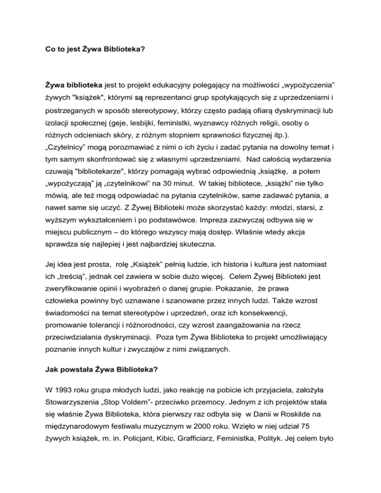 Co to jest Żywa Biblioteka? Żywa biblioteka jest to projekt edukacyjny polegający na możliwości „wypożyczenia” żywych "książek", którymi są reprezentanci grup spotykających się z uprzedzeniami i postrzeganych w sposób stereotypowy, którzy często padają ofiarą dyskryminacji lub izolacji społecznej (geje, lesbijki, feministki, wyznawcy różnych religii, osoby o różnych odcieniach skóry, z różnym stopniem sprawności fizycznej itp.). „Czytelnicy” mogą porozmawiać z nimi o ich życiu i zadać pytania na dowolny temat i tym samym skonfrontować się z własnymi uprzedzeniami. Nad całością wydarzenia czuwają "bibliotekarze", którzy pomagają wybrać odpowiednią „książkę, a potem „wypożyczają” ją „czytelnikowi” na 30 minut. W takiej bibliotece, „książki” nie tylko mówią, ale też mogą odpowiadać na pytania czytelników, same zadawać pytania, a nawet same się uczyć. Z Żywej Biblioteki może skorzystać każdy: młodzi, starsi, z wyższym wykształceniem i po podstawówce. Impreza zazwyczaj odbywa się w miejscu publicznym – do którego wszyscy mają dostęp. Właśnie wtedy akcja sprawdza się najlepiej i jest najbardziej skuteczna. Jej idea jest prosta, rolę „Książek” pełnią ludzie, ich historia i kultura jest natomiast ich „treścią”, jednak cel zawiera w sobie dużo więcej. Celem Żywej Biblioteki jest zweryfikowanie opinii i wyobrażeń o danej grupie. Pokazanie, że prawa człowieka powinny być uznawane i szanowane przez innych ludzi. Także wzrost świadomości na temat stereotypów i uprzedzeń, oraz ich konsekwencji, promowanie tolerancji i różnorodności, czy wzrost zaangażowania na rzecz przeciwdziałania dyskryminacji. Poza tym Żywa Biblioteka to projekt umożliwiający poznanie innych kultur i zwyczajów z nimi związanych. Jak powstała Żywa Biblioteka? W 1993 roku grupa młodych ludzi, jako reakcję na pobicie ich przyjaciela, założyła Stowarzyszenia „Stop Voldem”- przeciwko przemocy. Jednym z ich projektów stała się właśnie Żywa Biblioteka, która pierwszy raz odbyła się w Danii w Roskilde na międzynarodowym festiwalu muzycznym w 2000 roku. Wzięło w niej udział 75 żywych książek, m. in. Policjant, Kibic, Grafficiarz, Feministka, Polityk. Jej celem było postawienie uczestnikom wyzwania poprzez zmierzenie się twarzą twarz ze stereotypami i własnymi uprzedzeniami. Metoda Żywej Biblioteki okazała się bardzo skutecznym narzędziem, pomocnym przy promocji idei tolerancji i różnorodności. Najlepszym dowodem na to była lawina podobnych akcji w całej Europie, zorganizowano je już m.in. w Finlandii, Hiszpanii, Islandii, Niemczech, Norwegii, Portugalii, Serbii, Słowenii, Szwecji, Wielkiej Brytanii, czy na Węgrzech. Od 2003 roku żywa biblioteka wykorzystywana jest przez program Rady Europy w ramach edukacji na temat praw człowieka. Każda Żywa Biblioteka na świecie jest częścią globalnego ruchu pod patronatem Human Library Organization –organizacji, która wymyśliła metodę Żywej Biblioteki, i która wprowadziła proces standaryzacji Żywych Bibliotek. (http://humanlibrary.org/) Żywa Biblioteka w Polsce. Żywe Biblioteki są organizowane w Polsce od 2007 roku, m.in. w Warszawie, Wrocławiu, Bydgoszczy, Łodzi, Krakowie, Gdańsku, Poznaniu, Koszalinie, Zielonej Górze, Olsztynie czy Radomiu. Pierwsza Żywa Biblioteka w Polsce odbyła się w Warszawie ramach wydarzenia „Globalna Wioska – Święto Różnorodności” jako część ogólnoeuropejskiej kampanii „Każdy inny – wszyscy równi” (All Different, all Equal – Kampania Młodzieży na rzecz Równości, Praw Człowieka i Uczestnictwa) prowadzonej przez Radę Europy od czerwca 2006 do września 2007. Głównym organizatorem było stowarzyszenie Lambda Warszawa. Był to projekt edukacyjny zmierzający do ukazania różnorodności społecznej, budowania postawy otwartości, wspierania tolerancji i dialogu. Książkami wtedy byli: Żydówka – matka rabina, Nigeryjczyk, Wietnamka, Syryjka – muzułmanka, Japonka – katoliczka, Polak – buddysta, szereg osób niepełnosprawnych: niewidomy, dwóch uczniów bardzo słabo widzących, niepełnosprawny umysłowo, dwie osoby poruszające się na wózku, dwie osoby z Instytutu Głuchoniemych, a także osoba bezdomna i opiekun bezdomnych (Warszawa, Plac Konstytucji, 3 marca 2007) We Wrocławiu istnieje Stowarzyszenie Diversja, które jest organizatorem Żywej Biblioteki we współpracy z Human Library Organization. Za jego sprawą powstały standardy organizowania Żywej Bilblioteki: http://www.zywabiblioteka.pl/tl_files/doc/ZB_standardy.pdf Warto zajrzeć na ich stronę www.zywabiblioteka.pl, oraz do katalogu książek: http://www.zywabiblioteka.pl/tl_files/doc/Prologi/Katalog%20Ksiazek/Katalog%20Ksia zek/Katalog%20Ksiazek/RAPORT/Katalog%20Ksiazek%20edycja%20specjalna_do %20druku.pdf Bibliografia: www.zywabiblioteka.org.pl http://issuu.com/haveasign/docs/__b_booklet_net2# www.zywabiblioteka.pl http://www.zywabiblioteka.pl/tl_files/doc/ZB_standardy.pdf Dlaczego powstały filmy Żywej Biblioteki w CEO? Pomysł na stworzenie filmów Żywej Biblioteki powstał w Centrum Edukacji Obywatelskiej przy tworzeniu programu: „Nienawiść. Jestem Przeciw”. Nie spełniają one w pełni idei Żywej Biblioteki ponieważ nie można z daną „książką” porozmawiać i zadać jej swoich pytań. Jednak nadal dają one możliwość spotkanie z „daną” osobą (m.in. gej, osoba niepełnosprawna), poznanie jej, wysłuchanie jej historii, zastanowienie się nad własnymi postawami i sposobem myślenia o grupie społecznej, do której ta osoba należy. Oto pięć pytań zadawanych rozmówcom: 1. Określ w 5 słowach kim jesteś (np. Polka/Polak, buddystka/buddysta, kobieta/mężczyzna, szefowa/szef itp...) 2. Które z tych określeń jest dla Ciebie najistotniejsze? Dlaczego? 3. Jak reagują na to inni? Czy spotykasz się z aktami nietolerancji i mowy nienawi