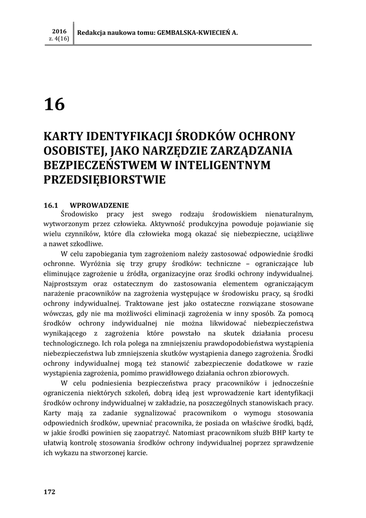 2016 z. 4(16) Redakcja naukowa tomu: GEMBALSKA-KWIECIEŃ A. 16 KARTY IDENTYFIKACJI ŚRODKÓW OCHRONY OSOBISTEJ, JAKO NARZĘDZIE ZARZĄDZANIA BEZPIECZEŃSTWEM W INTELIGENTNYM PRZEDSIĘBIORSTWIE 16.1 WPROWADZENIE Środowisko pracy jest swego rodzaju środowiskiem nienaturalnym, wytworzonym przez człowieka. Aktywność produkcyjna powoduje pojawianie się wielu czynników, które dla człowieka mogą okazać się niebezpieczne, uciążliwe a nawet szkodliwe. W celu zapobiegania tym zagrożeniom należy zastosować odpowiednie środki ochronne. Wyróżnia się trzy grupy środków: techniczne – ograniczające lub eliminujące zagrożenie u źródła, organizacyjne oraz środki ochrony indywidualnej. Najprostszym oraz ostatecznym do zastosowania elementem ograniczającym narażenie pracowników na zagrożenia występujące w środowisku pracy, są środki ochrony indywidualnej. Traktowane jest jako ostateczne rozwiązane stosowane wówczas, gdy nie ma możliwości eliminacji zagrożenia w inny sposób. Za pomocą środków ochrony indywidualnej nie można likwidować niebezpieczeństwa wynikającego z zagrożenia które powstało na skutek działania procesu technologicznego. Ich rola polega na zmniejszeniu prawdopodobieństwa wystąpienia niebezpieczeństwa lub zmniejszenia skutków wystąpienia danego zagrożenia. Środki ochrony indywidualnej mogą też stanowić zabezpieczenie dodatkowe w razie wystąpienia zagrożenia, pomimo prawidłowego działania ochron zbiorowych. W celu podniesienia bezpieczeństwa pracy pracowników i jednocześnie ograniczenia niektórych szkoleń, dobrą ideą jest wprowadzenie kart identyfikacji środków ochrony indywidualnej w zakładzie, na poszczególnych stanowiskach pracy. Karty mają za zadanie sygnalizować pracownikom o wymogu stosowania odpowiednich środków, upewniać pracownika, że posiada on właściwe środki, bądź, w jakie środki powinien się zaopatrzyć. Natomiast pracownikom służb BHP karty te ułatwią kontrolę stosowania środków ochrony indywidualnej poprzez sprawdzenie ich wykazu na stworzonej karcie. 172 SYSTEMY WSPOMAGANIA w INŻYNIERII PRODUKCJI Metody i narzędzia Inżynierii Produkcji dla rozwoju inteligentnych specjalizacji 2016 z. 4(16) 16.2 ŚRODKI OCHRONY INDYWIDUALNEJ – DEFINICJA Środki ochrony indywidualnej są to urządzenia lub wyposażenia przeznaczone do noszenia bądź trzymania przez pracownika w celu ochrony przed jednym lub większą liczbą zagrożeń, które mogą mieć wpływ na jego zdrowie lub bezpieczeństwo pracy. Do środków ochrony indywidualnej zalicza się: zespoły składające się z kilku urządzeń lub rodzajów wyposażenia, które zostały ze sobą połączone w celu ochrony człowieka przed jednym lub wieloma jednocześnie występującymi zagrożeniami, urządzenia lub wyposażenie ochronne, połączone rozłącznie lub nierozłącznie z nieochronnym środkiem wyposażenia indywidualnego noszonym lub też trzymanym przez osobę, w celu wykonania określonych czynności, wymienne składniki środków ochrony indywidualnej, które są istotne dla ich właściwego funkcjonowania [3]. Środki ochrony indywidualnej należą do grupy urządzeń ochronnych stanowiących bezpośrednie zabezpieczenie pracownika przed zagrożeniami występującymi w środowisku pracy. Decyzja o zastosowaniu środków ochrony indywidualnej musi być poprzedzona wszystkimi możliwymi działaniami, zarówno technicznymi jak i organizacyjnymi, mającymi na celu eliminację zagrożeń u źródła. Gdy działania zmierzające do całkowitej likwidacji występujących zagrożeń życia lub zdrowia, albo ograniczenia ich do wartości dopuszczalnych, nie przyniosą oczekiwanych rezultatów, co oznacza, że wartości stężeń lub natężeń czynników szkodliwych na stanowiskach pracy są wyższe od dopuszczalnych, stosowanie środków ochrony indywidualnej stanowi ostateczną i jedyną barierę chroniącą pracownika. Środki ochrony indywidualnej w zakresie ochrony zdrowia i bezpieczeństwa użytkowników tych środków powinny: zapewniać wystarczającą ochronę przed występującymi zagrożeniami, zaprojektowane oraz wykonane zgodnie z wymaganiami ergonomii tak, aby w przewidywanych do użycia warunkach, pracownik mógł normalnie wykonywać wszelkie czynności mimo występujących zagrożeń na stanowisku pracy. 16.3 Podział środków ochrony indywidualnej Zgodnie z normą PN-Z-08053: 1998 środki ochrony indywidualnej pod względem konstrukcji oraz ich ogólnego przeznaczenia dzielimy na 9 następujących grup: odzież ochronną – U środki ochrony kończyn dolnych – N środki ochrony kończyn górnych – R środki ochrony głowy – G środki ochrony twarzy i oczu – T środki ochrony słuchu – S 173 2016 z. 4(16) Redakcja naukowa tomu: GEMBALSKA-KWIECIEŃ A. środki ochrony układu oddechowego – D środki chroniące przed upadkiem z wysokości – W środki izolujące cały organizm – I [4]. Podział środków ochrony indywidualnej z przypisaniem odpowiedniego piktogramu przedstawia tabela 16.1. Tabela 16.1 Piktogramy dotyczące nakazu stosowania środków ochrony indywidualnej na stanowiskach pracy Grupy środków ochrony indywidualnej Znaczenie piktogramu Piktogram Rodzaje środków Środki ochrony oczu Nakaz stosowania ochrony oczu Okulary, gogle ochronne. Środki ochrony twarzy Nakaz stosowania ochrony twarzy Osłony twarzy w tym pół osłony i przyłbice, tarcze. Sprzęt ochrony głowy Nakaz stosowania ochrony głowy Hełmy ochronne, czapko hełmy, czapki, kaptury, berety, chustki. Sprzęt ochrony słuchu Nakaz stosowania ochrony narządu słuchu Wkładki, nauszniki, hełmy przeciwhałasowe. Sprzęt ochrony układu oddechowego Nakaz stosowania ochrony dróg oddechowych Środki ochrony kończyn górnych Nakaz stosowania ochrony kończyn górnych Sprzęt oczyszczający, filtrujący, autonomiczny, ucieczkowy i izolujący. Pochłaniacze, filtropochłaniacze, aparaty powietrzne butlowe i regeneracyjn