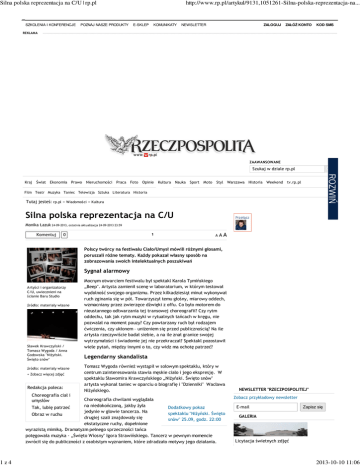 Silna polska reprezentacja na C/U | rp.pl 1z4 SZKOLENIA I KONFERENCJE http://www.rp.pl/artykul/9131,1051261-Silna-polska-reprezentacja-na... POZNAJ NASZE PRODUKTY E-SKLEP KOMUNIKATY ZALOGUJ NEWSLETTER ZAŁÓŻ KONTO KOD SMS REKLAMA ZAAWANSOWANE Szukaj w dziale rp.pl Kraj Świat Ekonomia Prawo Nieruchomości Praca Foto Opinie Kultura Nauka Sport Moto Styl Warszawa Historia Weekend tv.rp.pl Film Teatr Muzyka Taniec Telewizja Sztuka Literatura Historia Tutaj jesteś: rp.pl » Wiadomości » Kultura Silna polska reprezentacja na C/U Przełącz Monika Łazuk 24-09-2013, ostatnia aktualizacja 24-09-2013 23:59 Komentuj 1 0 A AA Polscy twórcy na festiwalu Ciało/Umysł mówili różnymi głosami, poruszali różne tematy. Każdy pokazał własny sposób na zobrazowania swoich intelektualnych poszukiwań Sygnał alarmowy Artyści i organizatorzy C/U, uwiecznieni na ścianie Baru Studio źródło: materiały własne Sławek Krawczyński / Tomasz Wygoda / Anna Godowska "Niżyński. Święto snów" źródło: materiały własne + Zobacz więcej zdjęć Redakcja poleca: Choreografia ciał i umysłów Mocnym otwarciem festiwalu był spektakl Karola Tymińskiego „Beep". Artysta zamienił scenę w laboratorium, w którym testował wydolność swojego organizmu. Przez kilkadziesiąt minut wykonywał ruch zginania się w pół. Towarzyszył temu głośny, miarowy oddech, wzmacniany przez zwierzęce dźwięki z offu. Co było motorem do nieustannego odtwarzania tej transowej choreografii? Czy rytm oddechu, tak jak rytm muzyki w rytualnych tańcach w kręgu, nie pozwalał na moment pauzy? Czy powtarzany ruch był rodzajem ćwiczenia, czy ukłonem – uniżeniem się przed publicznością? Na ile artysta rzeczywiście badał siebie, a na ile znał granice swojej wytrzymałości i świadomie jej nie przekraczał? Spektakl pozostawił wiele pytań, między innymi o to, czy widz ma ochotę patrzeć? Legendarny skandalista Tomasz Wygoda również wystąpił w solowym spektaklu, który w centrum zainteresowania stawia męskie ciało i jego ekspresję. W spektaklu Sławomira Krawczyńskiego „Niżyński. Święto snów" artysta wykonał taniec w oparciu o biografię i "Dzienniki" Wacława Niżyńskiego. Choreografia chwilami wyglądała na niedokończoną, jakby żyła Tak, lubię patrzeć Dodatkowy pokaz jedynie w głowie tancerza. Na spektaklu "Niżyński. Święto Obraz w ruchu drugiej szali znajdowały się snów" 25.09, godz. 22:00 ekstatyczne ruchy, dopełnione wyrazistą mimiką. Dramatyzm pełnego sprzeczności tańca potęgowała muzyka - „Święto Wiosny" Igora Strawińskiego. Tancerz w pewnym momencie zwrócił się do publiczności z osobistym wyznaniem, które zdradzało motywy jego działania. NEWSLETTER "RZECZPOSPOLITEJ" Zobacz przykładowy newsletter E-mail Zapisz się GALERIA Poprzednie Następne Licytacja świetnych zdjęć 2013-10-10 11:06 Silna polska reprezentacja na C/U | rp.pl 2z4 http://www.rp.pl/artykul/9131,1051261-Silna-polska-reprezentacja-na... Niestabilność emocjonalna czyniła z Niżyńskiego artystę nieprzewidywalnego, ale dzięki temu genialnego. Tomasz Wygoda w doskonały sposób pokazał to wewnętrzne rozdarcie, używając przy tym jedynie kostiumu i własnego ciała. Shit Out of Luck Festiwal C/U miał również mocną reprezentację polskich artystek i tancerek. Kaya Kołodziejczyk wystąpiła z pokazem przedpremierowym spektaklu „SOL". W zadymionej przestrzeni umieściła kilkadziesiąt żarówek, które lekko tliły, imitując robaczki świętojańskie. Początek, wypełniony dźwiękami lasu i ptaków zdradzał inspiracje artystki ruchem back-tothe-land, który postuluje zwrot w kierunku ekologii i odcięciu się od tempa miasta. Na scenie wielokrotnie wykorzystano motyw światła i ciemności. Tytułowe „SOL" czyli słońce czasami wyznaczało trasę ruchu, ale też decydowało o naszym wyobrażeniu na temat przestrzeni. Kiedy natężenie światła było duże, można było zobaczyć trakcję kolejową, rozrysowaną na podłodze i tylnej ścianie sceny. Białe linie podkreślały trójwymiarowość przestrzeni i nadawały scenie głębi. Kolejnym motywem determinującym ruch tancerki było europalety, rozrzucone w nieładzie. Stanowiły one niepewny grunt, który wymuszał na tancerce dużą uważność. W spektaklu pojawił się motyw instytucji kulturalnych (i wszystkich innych), które zamiast bezpiecznych procedur i wsparcia wprowadzają chaos. Artystka podkreśliła ten stan zdaniem: „Siedzimy w rozpędzonym samochodzie, w którym brakuje kierowcy". W języku angielskim tego typu sytuacje bez wyjścia określane są skrótem S.O.L, czyli „Shit Out of Luck". POLECAMY PLUS MINUS Szkiełko&oko Ckliwość i autoironia Anita Wach na potrzeby projektu „Gloria!" powołała Kwartet patetyczny. Do współpracy zaprosiła Magdę Jędrę, Annę Steller i Magdalenę Tukę. Tancerki wcielały się w role infantylnych, rozemocjonowanych kobiet, które patrzą w niebo i snują opowieści pełne absurdu. Artystki wyciągnęły na światło dzienne formy ekspresji, zepchnięte przez współczesnych artystów do piwnicy. Z rozmarzonymi oczami mówiły o swoich uczuciach, marzeniach, o potrzebie uniesienia. Ich role były przerysowane, wygłaszane monologi pełne banałów i poezji niskich lotów. W spektaklu użyto wielu tradycyjnych, teatralnych środków wyrazu. Głośna i wzniosła muzyka, majestatyczna scenografia, nastrojowe światła – wszystko to mogło porwać publiczność i wciągnąć ją w melodramatyczne przeżycia bohaterek. Czy porwało? Aktorki zdradzały autoironiczne podejście do własnych ról, poczucie sztuczności wykreowanego świata sprawiło, że publiczność pozostała zdystansowana względem dramatów, rozgrywających się na scenie. Poprzednia 1 Następna 2 KLIENT ZOBOWIĄZUJE Jak państwa firma poprawia relacje konsument - klient? Opisz i wygraj. MŁODA MARKA SUKCESU Konkurs dla młodych, dynamicznych polskich marek Wyprawa śladem pol