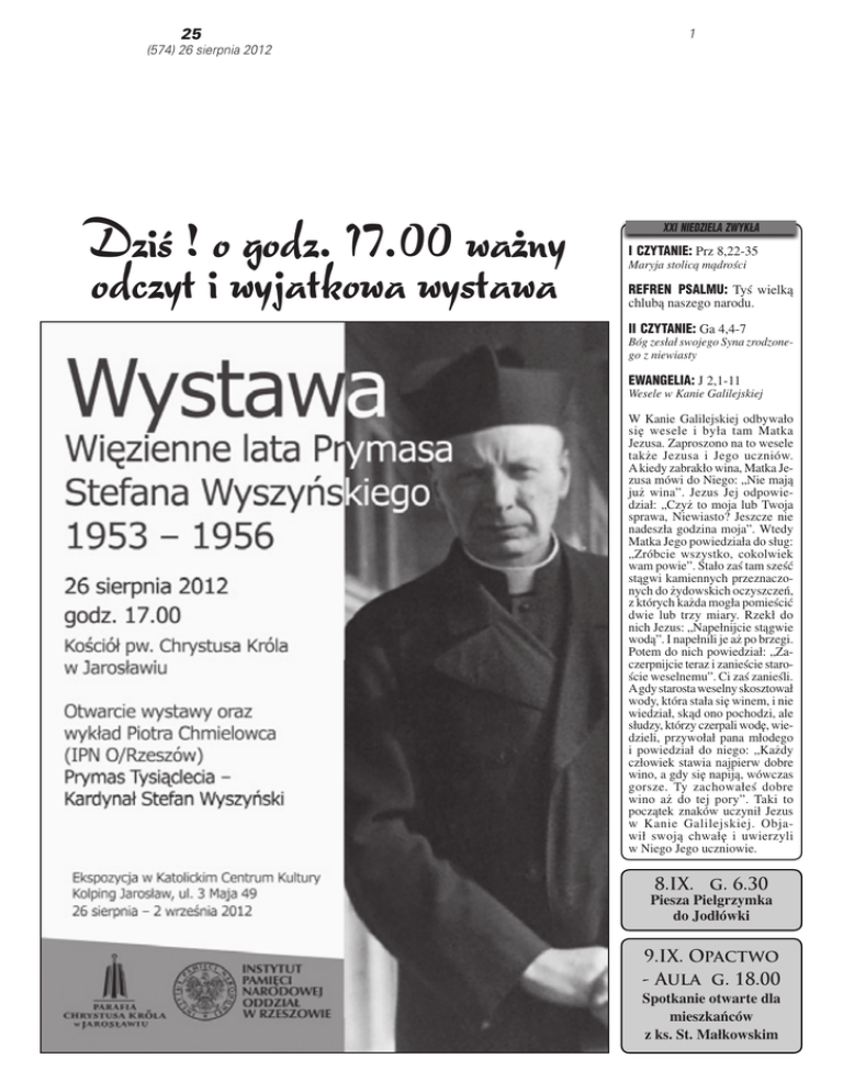25 1 (574) 26 sierpnia 2012 Dziś ! o godz. 17.00 ważny odczyt i wyjatkowa wystawa XXI NIEDZIELA ZWYKŁA I CZYTANIE: Prz 8,22-35 Maryja stolicą mądrości REFREN PSALMU: Tyś wielką chlubą naszego narodu. II CZYTANIE: Ga 4,4-7 Bóg zesłał swojego Syna zrodzonego z niewiasty EWANGELIA: J 2,1-11 Wesele w Kanie Galilejskiej 14 sierpnia 2012 r. W Kanie Galilejskiej odbywało się wesele i była tam Matka Jezusa. Zaproszono na to wesele także Jezusa i Jego uczniów. A kiedy zabrakło wina, Matka Jezusa mówi do Niego: „Nie mają już wina”. Jezus Jej odpowiedział: „Czyż to moja lub Twoja sprawa, Niewiasto? Jeszcze nie nadeszła godzina moja”. Wtedy Matka Jego powiedziała do sług: „Zróbcie wszystko, cokolwiek wam powie”. Stało zaś tam sześć stągwi kamiennych przeznaczonych do żydowskich oczyszczeń, z których każda mogła pomieścić dwie lub trzy miary. Rzekł do nich Jezus: „Napełnijcie stągwie wodą”. I napełnili je aż po brzegi. Potem do nich powiedział: „Zaczerpnijcie teraz i zanieście staroście weselnemu”. Ci zaś zanieśli. A gdy starosta weselny skosztował wody, która stała się winem, i nie wiedział, skąd ono pochodzi, ale słudzy, którzy czerpali wodę, wiedzieli, przywołał pana młodego i powiedział do niego: „Każdy człowiek stawia najpierw dobre wino, a gdy się napiją, wówczas gorsze. Ty zachowałeś dobre wino aż do tej pory”. Taki to początek znaków uczynił Jezus w Kanie Galilejskiej. Objawił swoją chwałę i uwierzyli w Niego Jego uczniowie. 8.IX. g. 6.30 Piesza Pielgrzymka do Jodłówki 9.IX. Opactwo - Aula g. 18.00 Spotkanie otwarte dla mieszkańców z ks. St. Małkowskim 2 Chrystus Królem Uroczystość Najświętszej Maryi Wspólne Przesłanie Do Narodów Panny Częstochowskiej Polski i Rosji Uroczystość NMP Częstochowskiej, obchodzona 26 sierpnia, ściśle związana jest z sanktuarium maryjnym w Częstochowie, w którym od końca XIV wieku otaczany jest wielką czcią obraz Bożej Rodzicielki. Pochodzenie obrazu, osnute legendami, pozostaje dotąd niewyjaśnione. Obraz Matki Bożej do Częstochowy sprowadził Władysław Opolczyk, książę opolski, z zamku w Bełżcu gdzie cieszył się szczególnym kultem wiernych i umieścił w ufundowanym przez siebie klasztorze, do którego sprowadził z Węgier ojców paulinów. Obraz bardzo szybko zasłynął cudami. W roku 1429 król Władysław Jagiełło w liście do papieża Marcina V pisał o tym miejscu, że na Jasnej Górze koło Częstochowy dzieją się często tajemnice licznych cudów. Obraz przedstawia Maryję z Dzieciątkiem Jezus na ręku. Z czasem klasztor na Jasnej Górze stał się twierdzą obronną stawiającą czoło najazdowi szwedzkiemu w 1655 r. Zwycięska obrona Jasnej Góry sprawiła, że sanktuarium to zdobyło sławę w całej Polsce. W roku 1717 biskup Szembek dokonał pierwsze koronacji obrazu koronami papieskimi. Po wielu staraniach paulinów papież Pius X w roku 1904 ustanowił dla sanktuarium specjalne święto Matki Bożej Częstochowskiej na 24 sierpnia. Papież ten podarował także korony, którymi powtórnie ukoronowano obraz w 1910 roku. Następnie papież Pius XI, w roku 1931 ustalił obchód święta na 26 sierpnia. Od 1956 roku święto obchodzone jest w całej Polsce. Jordi Savall honorowym obywatelem Na nadzwyczajnej Sesji Rady Miasta tytuł Honorowego Obywatela Miasta Jarosławia otrzymał w styczniu, ale odebrał go dopiero 20 sierpnia – Jordi Savall. Jordi Savall do Jarosławia przyjechał po raz drugi. Jego pierwszy koncert w naszym mieście, w 2004 r. na Festiwalu Muzyki Dawnej „Pieśń Naszych Korzeni”, był niezapomnianym doświadczeniem, owocem tego koncertu jest skomponowany przez artystę utwór „Jaroslaw”, który ukazał się na jednej z płyt muzyka pt. „Misique du temps et de l’instant”. To między innymi zadecydowało o przyznaniu przez Radę Miasta Jordi Savallowi tytułu honorowego obywatela. W poczuciu odpowiedzialności za teraźniejszość i przyszłość naszych Kościołów i narodów oraz kierując się pasterską troską, w imieniu Kościoła Katolickiego w Polsce i Rosyjskiego Kościoła Prawosławnego, zwracamy się ze słowem pojednania do wiernych naszych Kościołów, do naszych narodów i do wszystkich ludzi dobrej woli. W Chrystusie Bóg jednał ze sobą świat, nie poczytując ludziom ich grzechów, nam zaś przekazując słowo jednania Ikona Matki Bożej Smoleńskiej (2 Kor 5,19) Chrystusa, stały się wielkim Wyznając prawdę, że Jezus zgorszeniem, dlatego też poChrystus jest naszym pokojem dejmujemy nowe wysiłki, i pojednaniem (por. Ef 2,14; które mają zbliżyć nasze KośRz 5,11), i mając świadomość cioły i narody oraz uczynić powołania powierzonego nam nas bardziej wiarygodnymi w duchu Chrystusowej Ewan- świadkami Ewangelii wobec gelii, pragniemy wnieść swój współczesnego świata. wkład w dzieło zbliżenia naszych Kościołów i pojednania Po II wojnie światowej i bolesnych doświadczeniach atenaszych narodów. izmu, który narzucono naszym narodom, wchodzimy dzisiaj 1. Dialog i pojednanie na drogę duchowej i materialNasze bratnie narody łączy nej odnowy. Jeśli ma być ona nie tylko wielowiekowe są- trwała musi przede wszystkim siedztwo, ale także bogate dokonać się odnowa człowiechrześcijańskie dziedzictwo ka, a przez człowieka odnowa Wschodu i Zachodu. Świa- relacji między Kościołami domi tej długiej wspólnoty i narodami. dziejów i tradycji wyrastającej z Ewangelii Chrystusa, która Drogą ku takiej odnowie jest wywarła decydujący wpływ na braterski dialog. Ma on dotożsamość, duchowe oblicze pomóc w lepszym poznaniu i kulturę naszych narodów, się, odbudowaniu wzajemnea także całej Europy, wkracza- go zaufania i w taki sposób my na drogę szczerego dialogu doprowadzić do pojednania. w nadziei, że przyczyni się on Pojednanie zaś zakłada rówdo uleczenia ran przeszłości, nież gotowość do przebaczenia po