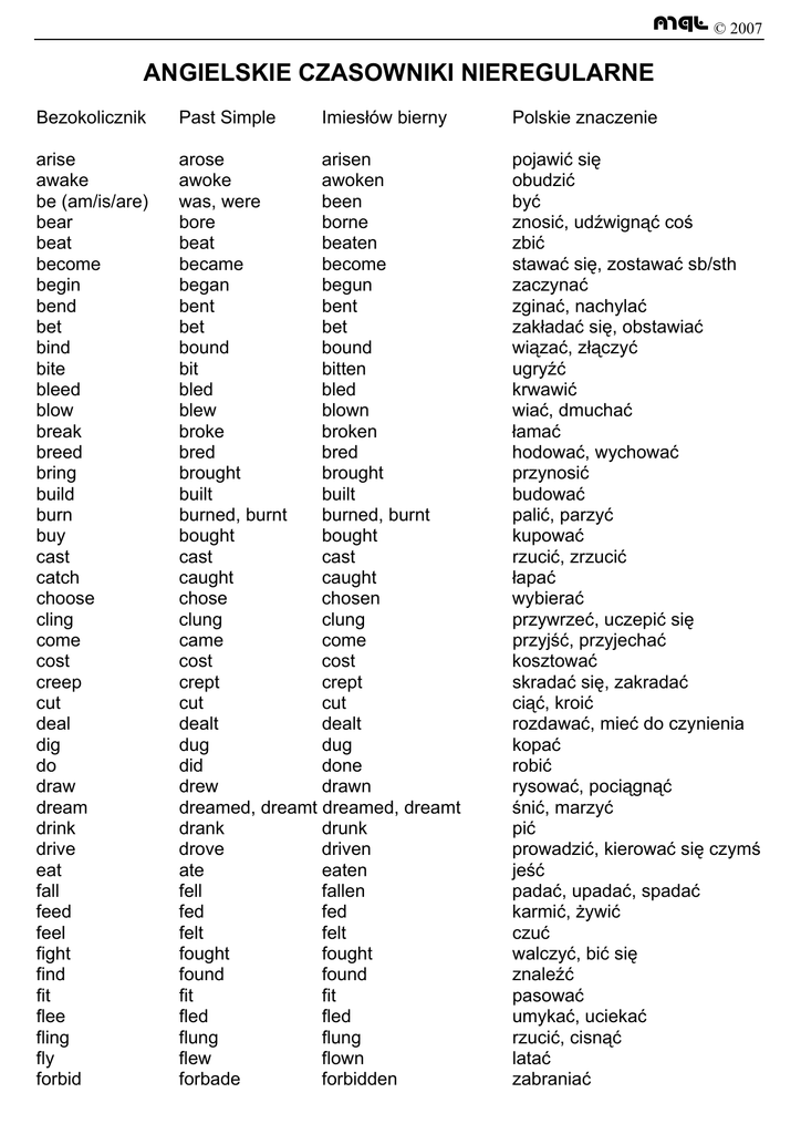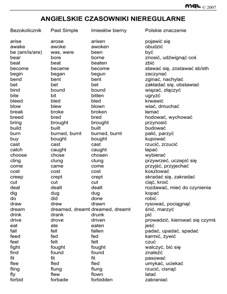 mql © 2007 ANGIELSKIE CZASOWNIKI NIEREGULARNE Bezokolicznik Past Simple Imiesłów bierny arise awake be (am/is/are) bear beat become begin bend bet bind bite bleed blow break breed bring build burn buy cast catch choose cling come cost creep cut deal dig do draw dream drink drive eat fall feed feel fight find fit flee fling fly forbid arose arisen awoke awoken was, were been bore borne beat beaten became become began begun bent bent bet bet bound bound bit bitten bled bled blew blown broke broken bred bred brought brought built built burned, burnt burned, burnt bought bought cast cast caught caught chose chosen clung clung came come cost cost crept crept cut cut dealt dealt dug dug did done drew drawn dreamed, dreamt dreamed, dreamt drank drunk drove driven ate eaten fell fallen fed fed felt felt fought fought found found fit fit fled fled flung flung flew flown forbade forbidden Polskie znaczenie pojawić się obudzić być znosić, udźwignąć coś zbić stawać się, zostawać sb/sth zaczynać zginać, nachylać zakładać się, obstawiać wiązać, złączyć ugryźć krwawić wiać, dmuchać łamać hodować, wychować przynosić budować palić, parzyć kupować rzucić, zrzucić łapać wybierać przywrzeć, uczepić się przyjść, przyjechać kosztować skradać się, zakradać ciąć, kroić rozdawać, mieć do czynienia kopać robić rysować, pociągnąć śnić, marzyć pić prowadzić, kierować się czymś jeść padać, upadać, spadać karmić, żywić czuć walczyć, bić się znaleźć pasować umykać, uciekać rzucić, cisnąć latać zabraniać mql © 2007 forget forgive forsake foretell freeze get give go grind grow hang have hear hide hit hold hurt keep kneel knit know lay (put) lead leap learn leave lend let lie (recline) light lose make mean meet pay prove put quit read ride ring rise run saw say see seek sell send forgot forgave forsook foretold froze got gave went ground grew hung had heard hid hit held hurt kept knelt, kneeled knit, knitted knew laid led leapt, leaped learnt, learned left lent let lay lighted, lit lost made meant met paid proved put quit read [red] rode rang rose ran sawed said saw sought sold sent forgotten forgiven forsaken foretold frozen got given gone ground grown hung had heard hidden hit held hurt kept knelt, kneeled knit, knitted known laid led leapt, leaped learnt, learned left lent let lain lighted, lit lost made meant met paid proved, proven put quit read [red] ridden rung risen run sawn said seen sought sold sent zapominać wybaczać porzucać, zaniechać przepowiadać, przewidywać zamarzać dostawać dawać iść zemleć, rozkruszyć, zgrzytać rosnąć zawieszać (np. obraz) mieć słyszeć chować, ukrywać uderzać trzymać, utrzymywać ranić, boleć trzymać klękać, klęczeć robić na drutach znać, wiedzieć położyć, kłaść prowadzić skoczyć, skakać uczyć się opuszczać, wyjeżdżać pożyczać pozwalać leżeć, kłaść się zapalać, rozpalać, oświetlać tracić robić znaczyć, oznaczać spotykać płacić udowadniać, dowieść kłaść rzucać, opuszczać czytać jeździć dzwonić podnosić się, wzrastać biec piłować mówić widzieć szukać, poszukiwać sprzedawać wysyłać, słać mql © 2007 set shake shed shine shoot show shrink shut sing sink sit slay sleep slide sling speak spend spin split spread spring stand steal stick sting stink strike strive swear sweep swim swing take teach tear tell think throw tread wake wear weep understand win wind wring write set shook shed shone shot showed shrank shut sang sank sat slew slept slid slung spoke spent spun split spread sprang stood stole stuck stung stank struck strove swore swept swam swung took taught tore told thought threw trod woke wore wept understood won wound wrung wrote set shaken shed shone shot shown shrunk shut sung sunk sat slain slept slid slung spoken spent spun split spread sprung stood stolen stuck stung stunk struck striven sworn swept swum swung taken taught torn told thought thrown trodden woken worn wept understood won wound wrung written umieszczać, ustawiać trząść, potrząsać zrzucać, pozbywać się świecić, błyszczeć strzelać pokazywać kurczyć się, zbiegać zamykać śpiewać tonąć (o statku), zapadać się siedzieć, siadać zabijać spać ślizgać się, zjeżdżać cisnąć, miotać mówić spędzać, wydawać kręcić, zakręcić czymś/ się dzielić, rodzielać rozkładać, rozpościerać przeskakiwać, wyskakiwać stać kraść wbijać, wtykać, przyklejać żądlić śmierdzieć, cuchnąć uderzyć zmagać się z czymś przysięgać, przeklinać zmiatać, zamiatać pływać machnąć, zakołysać brać uczyć drzeć, rozdzierać mówić myśleć rzucać kroczyć, stąpać budzić nosić, ubierać coś płakać, szlochać rozumieć wygrywać nawijać, nakręcać, wić się wykręcić, wyżąć coś, wycisnąć pisać