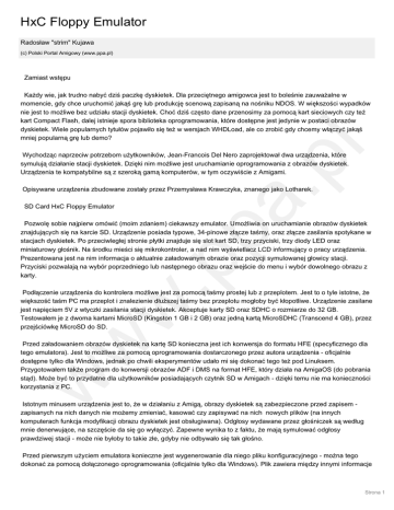 HxC Floppy Emulator Radosław "strim" Kujawa (c) Polski Portal Amigowy (www.ppa.pl) Zamiast wstępu l Każdy wie, jak trudno nabyć dziś paczkę dyskietek. Dla przeciętnego amigowca jest to boleśnie zauważalne w momencie, gdy chce uruchomić jakąś grę lub produkcję scenową zapisaną na nośniku NDOS. W większości wypadków nie jest to możliwe bez udziału stacji dyskietek. Choć dziś często dane przenosimy za pomocą kart sieciowych czy też kart Compact Flash, dalej istnieje spora biblioteka oprogramowania, które dostępne jest jedynie w postaci obrazów dyskietek. Wiele popularnych tytułów pojawiło się też w wersjach WHDLoad, ale co zrobić gdy chcemy włączyć jakąś mniej popularną grę lub demo? .p Wychodząc naprzeciw potrzebom użytkowników, Jean-Francois Del Nero zaprojektował dwa urządzenia, które symulują działanie stacji dyskietek. Dzięki nim możliwe jest uruchamianie oprogramowania z obrazów dyskietek. Urządzenia te kompatybilne są z szeroką gamą komputerów, w tym oczywiście z Amigami. w .p pa Opisywane urządzenia zbudowane zostały przez Przemysława Krawczyka, znanego jako Lotharek. SD Card HxC Floppy Emulator Pozwolę sobie najpierw omówić (moim zdaniem) ciekawszy emulator. Umożliwia on uruchamianie obrazów dyskietek znajdujących się na karcie SD. Urządzenie posiada typowe, 34-pinowe złącze taśmy, oraz złącze zasilania spotykane w stacjach dyskietek. Po przeciwległej stronie płytki znajduje się slot kart SD, trzy przyciski, trzy diody LED oraz miniaturowy głośnik. Na środku mieści się mikrokontroler, a nad nim wyświetlacz LCD informujący o pracy urządzenia. Prezentowana jest na nim informacja o aktualnie załadowanym obrazie oraz pozycji symulowanej głowicy stacji. Przyciski pozwalają na wybór poprzedniego lub następnego obrazu oraz wejście do menu i wybór dowolnego obrazu z karty. w Podłączenie urządzenia do kontrolera możliwe jest za pomocą taśmy prostej lub z przeplotem. Jest to o tyle istotne, że większość taśm PC ma przeplot i znalezienie dłuższej taśmy bez przeplotu mogłoby być kłopotliwe. Urządzenie zasilane jest napięciem 5V z wtyczki zasilania stacji dyskietek. Akceptuje karty SD oraz SDHC o rozmiarze do 32 GB. Testowałem je z dwoma kartami MicroSD (Kingston 1 GB i 2 GB) oraz jedną kartą MicroSDHC (Transcend 4 GB), przez przejściówkę MicroSD do SD. w Przed załadowaniem obrazów dyskietek na kartę SD konieczna jest ich konwersja do formatu HFE (specyficznego dla tego emulatora). Jest to możliwe za pomocą oprogramowania dostarczonego przez autora urządzenia - oficjalnie dostępne tylko dla Windows, jednak po chwili eksperymentów udało mi się dokonać tego też pod Linuksem. Przygotowałem także program do konwersji obrazów ADF i DMS na format HFE, który działa na AmigaOS (do pobrania stąd). Może być to przydatne dla użytkowników posiadających czytnik SD w Amigach - dzięki temu nie ma konieczności korzystania z PC. Istotnym minusem urządzenia jest to, że w działaniu z Amigą, obrazy dyskietek są zabezpieczone przed zapisem zapisanych na nich danych nie możemy zmieniać, kasować czy zapisywać na nich nowych plików (na innych komputerach funkcja modyfikacji obrazu dyskietek jest obsługiwana). Odgłosy wydawane przez głośniczek są według mnie denerwujące, na szczęście da się go wyłączyć. Zapewne wynika to z faktu, że mają symulować odgłosy prawdziwej stacji - może nie byłoby to takie złe, gdyby nie odbywało się tak głośno. Przed pierwszym użyciem emulatora konieczne jest wygenerowanie dla niego pliku konfiguracyjnego - można tego dokonać za pomocą dołączonego oprogramowania (oficjalnie tylko dla Windows). Plik zawiera między innymi informacje Strona 1 HxC Floppy Emulator Radosław "strim" Kujawa (c) Polski Portal Amigowy (www.ppa.pl) o tym, czy ma być włączony głośnik oraz o jasności wyświetlacza LCD. Na stronie autora dostępna jest instrukcja w formacie PDF, wyjaśniająca dokładnie jak podłączyć i skonfigurować emulator. USB HxC Floppy Emulator .p l Ta wersja emulatora była pierwszą ukończoną przez autora. Urządzenie jest interfejsem pomiędzy kontrolerem stacji dyskietek a drugim komputerem, który pełni funkcję serwera obrazów dyskietek. Komunikacja z komputerem udostępniającym obrazy odbywa się za pomocą szyny USB 1.1. Po jednej stronie płytki znajduje się 34-pinowe złącze taśmy. Na środku układ CPLD Altera, będący sercem tego urządzenia. Po stronie przeciwnej do złącza taśmy zamontowano złącze USB typu B oraz cztery diody informujące o stanie urządzenia. Zasilanie pobierane jest z portu USB - nie ma potrzeby osobnego jego doprowadzania jak w wersji SD. w .p pa Oprogramowanie serwujące dane dostarczane jest w wersji dla Windows oraz Linux. W przypadku wersji Windows konieczna jest instalacja sterownika. Oprogramowanie pozwala na pełną kontrolę urządzenia: zmianę serwowanych obrazów, konfigurację parametrów interfejsu wirtualnej stacji. Ilość obsługiwanych formatów obrazów jest ogromna, w tym oczywiście obsługiwane są popularne na Amidze formaty ADF i DMS (pełna lista na stronie autora). Wersja dla Linuksa jest mniej przyjazna użytkownikowi (brak GUI) oraz dostarczana tylko w postaci źródeł, które należy samemu skompilować. Niemniej jednak spełnia swoją rolę tak samo dobrze jak dla Windows. Emulator posiada też ciekawą funkcję, która pozwala na udostępnienie Amidze zawartości katalogu z PC. Dzięki temu nie trzeba samemu robić najpierw obrazu ADF katalogu. Warto zaznaczyć, że emulator USB na wszystkich typach komputerów działa w trybie "tylko do odczytu". Podsumowanie w Prawdopodobnie dla większości użytkowników atrakcyjnym rozwiązaniem będzie emulator na karty SD. Wersja USB może być atrakcyjna dla tych, którzy na jednym biurku mają Amigę oraz PC, a na nim trzymają swoje obrazy dyskietek. Stabilność i kompatybilność obu u