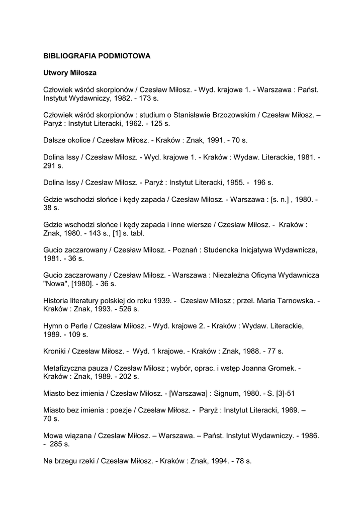 BIBLIOGRAFIA PODMIOTOWA Utwory Miłosza Człowiek wśród skorpionów / Czesław Miłosz. - Wyd. krajowe 1. - Warszawa : Państ. Instytut Wydawniczy, 1982. - 173 s. Człowiek wśród skorpionów : studium o Stanisławie Brzozowskim / Czesław Miłosz. – Paryż : Instytut Literacki, 1962. - 125 s. Dalsze okolice / Czesław Miłosz. - Kraków : Znak, 1991. - 70 s. Dolina Issy / Czesław Miłosz. - Wyd. krajowe 1. - Kraków : Wydaw. Literackie, 1981. 291 s. Dolina Issy / Czesław Miłosz. - Paryż : Instytut Literacki, 1955. - 196 s. Gdzie wschodzi słońce i kędy zapada / Czesław Miłosz. - Warszawa : [s. n.] , 1980. 38 s. Gdzie wschodzi słońce i kędy zapada i inne wiersze / Czesław Miłosz. - Kraków : Znak, 1980. - 143 s., [1] s. tabl. Gucio zaczarowany / Czesław Miłosz. - Poznań : Studencka Inicjatywa Wydawnicza, 1981. - 36 s. Gucio zaczarowany / Czesław Miłosz. - Warszawa : Niezależna Oficyna Wydawnicza "Nowa", [1980]. - 36 s. Historia literatury polskiej do roku 1939. - Czesław Miłosz ; przeł. Maria Tarnowska. Kraków : Znak, 1993. - 526 s. Hymn o Perle / Czesław Miłosz. - Wyd. krajowe 2. - Kraków : Wydaw. Literackie, 1989. - 109 s. Kroniki / Czesław Miłosz. - Wyd. 1 krajowe. - Kraków : Znak, 1988. - 77 s. Metafizyczna pauza / Czesław Miłosz ; wybór, oprac. i wstęp Joanna Gromek. Kraków : Znak, 1989. - 202 s. Miasto bez imienia / Czesław Miłosz. - [Warszawa] : Signum, 1980. - S. [3]-51 Miasto bez imienia : poezje / Czesław Miłosz. - Paryż : Instytut Literacki, 1969. – 70 s. Mowa wiązana / Czesław Miłosz. – Warszawa. – Państ. Instytut Wydawniczy. - 1986. - 285 s. Na brzegu rzeki / Czesław Miłosz. - Kraków : Znak, 1994. - 78 s. O podboju / Czesław Miłosz. Etos Komitetu Obrony Robotników / J.J. Lipski. Manipulacje pod płaszczykiem / Irena Grudzińska-Gross. - Warszawa : Unia, 1984. 31 s. Ocalenie / Czesław Miłosz. - Warszawa : Czytelnik, 1945. - 154 s. Ogród nauk / Czesław Miłosz. - Wyd. krajowe 1. - Lublin : Redakcja Wydawnictw Katolickiego Uniwersytetu Lubelskiego, 1986. - 275 s. Ogród nauk / Czesław Miłosz. - [1 pełne wyd. krajowe]. - Lublin : Norbertinum, 1991. – 284 s. Piesek przydrożny / Czesław Miłosz. - [Wyd. 1 ]. - Kraków : Znak, 1999. - 317 s. Poezje / Czesław Miłosz . - Paryż : Instytut Literacki, 1982. - 110 s. Podróż ; Kompozycja / Czesław Miłosz ; [tekst do dr. przygot. Jan Straus ; linoryt wykonał Zbigniew Dolatowski]. - Warszawa : Nakł. Warszawskiego Oddziału Towarzystwa Przyjaciół Książki, 1980. - 14 s. Poemat o czasie zastygłym / Czesław Miłosz. - Wilno : Koło Polonistów Słuchaczy Uniwersytetu Stefana Batorego, 1933. - 23 s. Rodzinna Europa / Czesław Miłosz. - Wyd. przejrz. przez autora. - Kraków : Wydaw. Literackie, 1994. – 293 s. Rodzinna Europa / Czesław Miłosz. - Paryż : Instytut Literacki, 1959. – 246 s. Rok myśliwego / Czesław Miłosz. - Kraków : Znak, 1991. - 333 s. Szukanie ojczyzny / Czesław Miłosz. - Kraków : Znak, 1992. - 217 s. Świadectwo poezji : sześć wykładów o dotkliwościach naszego wieku / Czesław Miłosz. - Kraków : Wydaw. Literackie, 2004. – 162 s. Świadectwo poezji : sześć wykładów o dotkliwościach naszego wieku / Czesław Miłosz. - Warszawa : Czytelnik, 1987. - 122 s. Świadectwo poezji : sześć wykładów o dotkliwościach naszego wieku / Czesław Miłosz. - [Kraków] : Oficyna Literacka, 1985. - S. [2], 7-91, [1] s. Światło dzienne / Czesław Miłosz. - Warszawa : Niezależna Oficyna Wydawnicza , [1980]. - 79 s. Światło dzienne / Czesław Miłosz. - Paryż : Instytut Literacki, 1953. -156 s. Tamta Ziemia / Czesław Miłosz ; Łódzki Zespół Oświaty Niezależnej. - Łódź : Solidarność Walcząca, 1987. - 11 s. Traktat moralny ; Traktat poetycki / Czesław Miłosz. - Wyd. 1 w tej ed. - Warszawa : Czytelnik, 1982. - 63 s. Traktat poetycki z moim komentarzem / Czesław Miłosz. - Kraków : Wydaw. Literackie, 2001. - 102 s. Trzy zimy / Czesław Miłosz . Głosy o wierszach / pod red. Renaty Gorczyńskiej i Piotra Kłoczowskiego. - Londyn : Aneks, 1987. - VIII, 135 s. Wiersze / Czesław Miłosz. - [Warszawa] : Oficyna Poetów, [1980]. - 108 s. Wiersze. [T.] 1-2 / Czesław Miłosz.. - Wyd. 1. – Kraków ; Wrocław : Wydaw. Literackie, 1985. - 2 t. (296 ; 383 s.) Wiersze. [T.] 1-2 / Czesław Miłosz. - Kraków ; Wrocław : Wydaw. Literackie, 1984. – 2 t. (296 ; 383 s.) Wiersze / Czesław Miłosz. - Wyd. 2. - Warszawa : Ludowa Spółdzielnia Wydawnicza, 1983. - 126 s. Wiersze wybrane / Czesław Miłosz. - Wyd. krajowe 1. - Warszawa : Państ. Instytut Wydawniczy, 1980. - 118 s. Zaczynając od moich ulic / Czesław Miłosz. - Paryż : Instytut Literacki, 1985. - 364 s. Zdobycie władzy / Czesław Miłosz. - Kraków : [s.n.], 1981. - 159 s. Ziemia Ulro / Czesław Miłosz. - Wyd. krajowe 1. - Warszawa : Państ. Instytut Wydawniczy, 1982. - 279 s. Zniewolony umysł / Czesław Miłosz. - Wyd. 2. – Kraków : Krajowa Agencja Wydawnicza. - 1990. - 294 s. Zniewolony umysł / Czesław Miłosz. - Wyd. 2. - [Warszawa] : Niezależna Oficyna Wydawnicza, 1981. - S. [4], 9-236, [1] Zniewolony umysł / Czesław Miłosz. - Paryż : Instytut Literacki , 1953. - 236 s. Życie na wyspach / Czesław Miłosz ; [wybór i oprac. Joanna Gromek]. - Kraków : Znak, 1997. - 309 s. Rozmowy, wywiady, korespondencja Herbert, Zbigniew, Miłosz, Czesław : Korespondencja : z faksymiliami listów i wierszy, fotografiami oraz aneksem zawierającym nieznane wypowiedzi Herberta o Miłoszu i Miłosza o Herbercie, a także komentarze Katarzyny Herbertowej i Marka Skwarnickiego oraz wiersze obu poetów / Zbigniew Herbert, Czesław Miłosz ; [red. Barbara Toruńczyk]. - Warszawa : Fundacja Zeszytów Literackich, cop. 2006. - 297 s Miłosz, Czesław : "Autoportret przekorny" : rozmowy / Czesław Miłosz, Aleksander Fiut. - Kraków : Wydaw. Literackie, 2003. - 532 s. Miłosz, Czesław : Conversations with Czeslaw Milosz / by Ewa Czarnecka and Aleksander Fiut ; translat