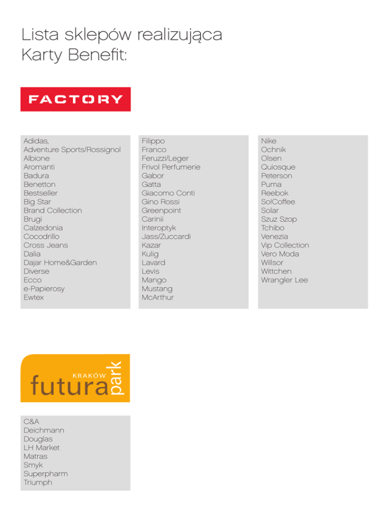 Lista sklepów realizująca Karty Benefit: Adidas, Adventure Sports/Rossignol Albione Aromanti Badura Benetton Bestseller Big Star Brand Collection Brugi Calzedonia Cocodrillo Cross Jeans Dalia Dajar Home&Garden Diverse Ecco e-Papierosy Ewtex C&A Deichmann Douglas LH Market Matras Smyk Superpharm Triumph Filippo Franco Feruzzi/Leger Frivol Perfumerie Gabor Gatta Giacomo Conti Gino Rossi Greenpoint Carinii Interoptyk Jass/Zuccardi Kazar Kulig Lavard Levis Mango Mustang McArthur Nike Ochnik Olsen Quiosque Peterson Puma Reebok So!Coffee Solar Szuz Szop Tchibo Venezia Vip Collection Vero Moda Willsor Wittchen Wrangler Lee