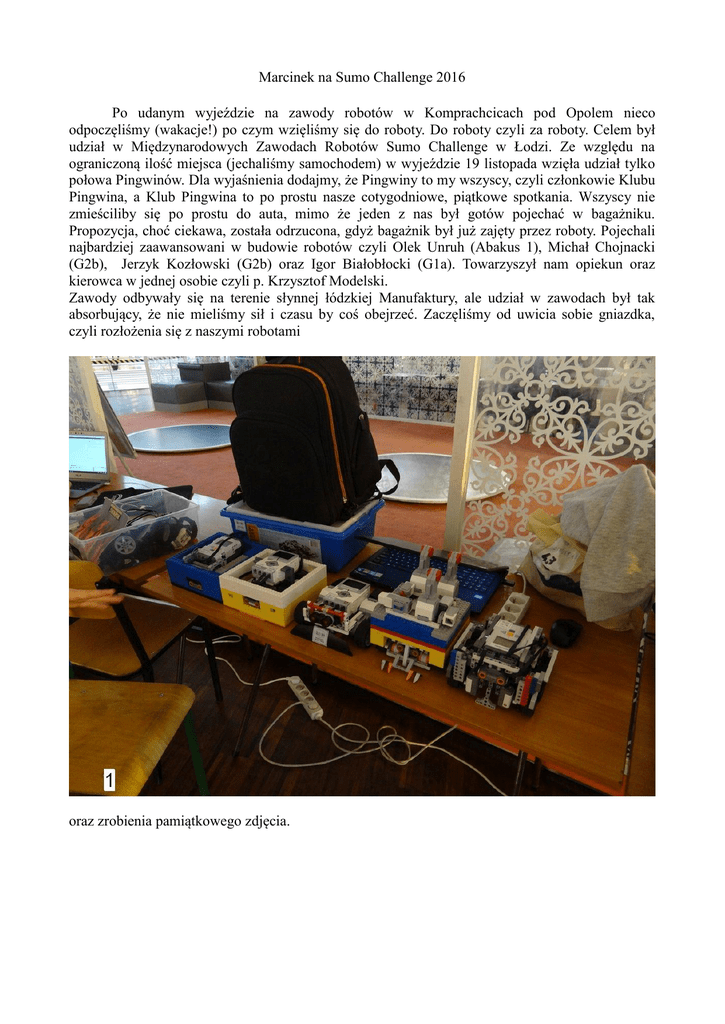 Marcinek na Sumo Challenge 2016 Po udanym wyjeździe na zawody robotów w Komprachcicach pod Opolem nieco odpoczęliśmy (wakacje!) po czym wzięliśmy się do roboty. Do roboty czyli za roboty. Celem był udział w Międzynarodowych Zawodach Robotów Sumo Challenge w Łodzi. Ze względu na ograniczoną ilość miejsca (jechaliśmy samochodem) w wyjeździe 19 listopada wzięła udział tylko połowa Pingwinów. Dla wyjaśnienia dodajmy, że Pingwiny to my wszyscy, czyli członkowie Klubu Pingwina, a Klub Pingwina to po prostu nasze cotygodniowe, piątkowe spotkania. Wszyscy nie zmieściliby się po prostu do auta, mimo że jeden z nas był gotów pojechać w bagażniku. Propozycja, choć ciekawa, została odrzucona, gdyż bagażnik był już zajęty przez roboty. Pojechali najbardziej zaawansowani w budowie robotów czyli Olek Unruh (Abakus 1), Michał Chojnacki (G2b), Jerzyk Kozłowski (G2b) oraz Igor Białobłocki (G1a). Towarzyszył nam opiekun oraz kierowca w jednej osobie czyli p. Krzysztof Modelski. Zawody odbywały się na terenie słynnej łódzkiej Manufaktury, ale udział w zawodach był tak absorbujący, że nie mieliśmy sił i czasu by coś obejrzeć. Zaczęliśmy od uwicia sobie gniazdka, czyli rozłożenia się z naszymi robotami oraz zrobienia pamiątkowego zdjęcia. Niewtajemniczonym wyjaśniamy, że widoczny na koszulce trzymanej przez p. Modelskiego napis „Marcinek RoboTeam” to nazwa naszej drużyny. Ze względu na dużą liczbę uczestników walki odbywały się w kilku turach. Najdalej zaszedł zbudowany przez Olka Unruha robot Thunder (widzimy go w powiększeniu i w akcji na zdjęciu). Thunder znalazł się wśród 8 najlepszych konstrukcji. W walkach o finał poległ w konfrontacji z pewnym wypasionym typem (oczywiście robotem), który później okazał się być zdobywcą drugiej nagrody. Sukces Olka i jego robota nie był jedynym naszym osiągnięciem. Jako przeciwnicy fałszywej skromności pochwalić możemy się też innymi sukcesami: 1. Robot Leniwcobot – ze względu na nazwę rozbawił organizatorów już w chwili rejestracji. Został przechrzczony przez nich na Leniwca. Wbrew nazwie poruszał się nieco szybciej niż leniwiec czego dowód dał podczas zawodów, gdy ku uciesze wszystkich na widok przeciwnika dał drapaka z ringu i pojechał na ring sąsiedni. By naszym robotom nie przewróciło się w głowach pozostałe sukcesy podajemy bez ich nazw: 2. Jeden z robotów niemal wszystko przegrał, ale był tak zadziorny i bojowy, że stał się ulubieńcem publiczności. 3. W naszej kolekcji znalazł się robot, który podczas walki rozpadał się, gubiąc fragmenty konstrukcji. Zdaniem jego twórcy było to zamierzone, chodziło o to, by zmylić przeciwnika. Trudno orzec, na ile to było skuteczne, ale niewątpliwą zaletą tej przypadłości było zmuszenie nas do ruchu. Po każdej walce czołgaliśmy się w poszukiwaniu zgubionych części. 4. Ciekawe zachowanie przejawiał robot, którego można by nazwać psem ale raczej nie psem bojowym. Jak tylko przeciwnik go dotknął, poddawał się sygnalizując to przewróceniem się na plecy. Od prawdziwego psa różniło go to, że zamiast czterech łap miał osiem kół oraz to, że nie szczekał. Wyliczając nasze sukcesy dodać jeszcze należy wielki sukces naszego opiekuna. Jak sam twierdzi nigdy w życiu nie zbudował żadnego robota a i tak dostał dyplom uczestnictwa w zawodach czego dowodem jest zdjęcie. Na koniec dodajmy jeszcze jeden sukces naszego opiekuna. Za swoje największe osiągnięcie uważa on mianowicie to, że udało mu się wytrzymać z nami cały dzień, od wczesnego rana do późnego wieczora. Dodajmy, że nam też udało się z nim wytrzymać. Czyli pełen sukces, było super. Zanim wyjechaliśmy z Manufaktury zrobiliśmy sobie jeszcze jedną fotkę. Tekst i zdjęcia Klub Pingwina