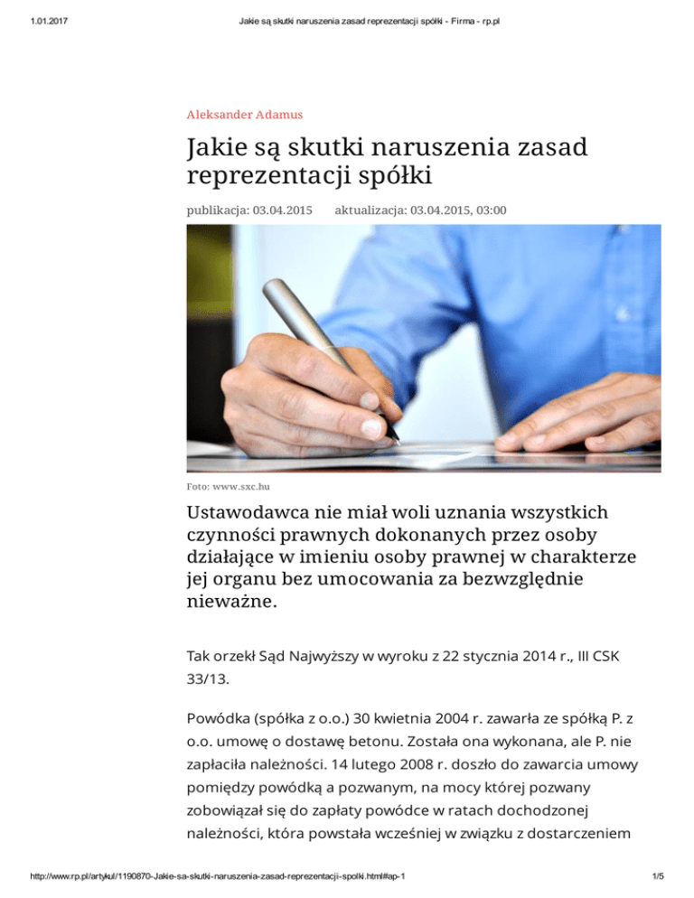 1.01.2017 Jakie są skutki naruszenia zasad reprezentacji spółki - Firma - rp.pl Aleksander Adamus Jakie są skutki naruszenia zasad reprezentacji spółki publikacja: 03.04.2015 aktualizacja: 03.04.2015, 03:00 Foto: www.sxc.hu Ustawodawca nie miał woli uznania wszystkich czynności prawnych dokonanych przez osoby działające w imieniu osoby prawnej w charakterze jej organu bez umocowania za bezwzględnie nieważne. Tak orzekł Sąd Najwyższy w wyroku z 22 stycznia 2014 r., III CSK 33/13. Powódka (spółka z o.o.) 30 kwietnia 2004 r. zawarła ze spółką P. z o.o. umowę o dostawę betonu. Została ona wykonana, ale P. nie zapłaciła należności. 14 lutego 2008 r. doszło do zawarcia umowy pomiędzy powódką a pozwanym, na mocy której pozwany zobowiązał się do zapłaty powódce w ratach dochodzonej należności, która powstała wcześniej w związku z dostarczeniem http://www.rp.pl/artykul/1190870-Jakie-sa-skutki-naruszenia-zasad-reprezentacji-spolki.html#ap-1 1/5 1.01.2017 Jakie są skutki naruszenia zasad reprezentacji spółki - Firma - rp.pl przez powódkę betonu spółce P. W rozmowach ze strony powódki dotyczących zawarcia tej umowy uczestniczył D.S. Należność ta była spłacana do maja 2009 r., a potem pozwany zaniechał dokonywania spłaty. Powódka wystąpiła na drogę sądową. Sąd rejonowy wydał nakaz zapłaty zasądzający wspomnianą należność. Rozpoznając zarzuty pozwanego od tego nakazu, sąd okręgowy uchylił nakaz i oddalił powództwo. Sąd okręgowy ustalił, że na 28 stycznia 2010 r. w KRS brak było danych o osobach wchodzących w skład zarządu powódki, uprawnionych do jej reprezentowania, bo zarząd w ogóle nie był ustanowiony. Dopiero 26 kwietnia 2010 r. wybrano D.S. na członka jednoosobowego zarządu powódki. Wobec tego, że w powodowej spółce w czasie zawierania umowy z 2008 r. nie został ustanowiony zarząd, D.S. nie mógł jej skutecznie reprezentować. Powódka wniosła apelację, która została oddalona. Oceniając sytuację prawną powódki w chwili zawierania umowy z 14 lutego 2008 r., sąd apelacyjny stwierdził, że D.S. działał jako organ powódki, ale jednocześnie nie został w tym czasie powołany w ogóle zarząd tej spółki. Regulacja prawna w art. 38 i 39 kodeksu cywilnego powoduje ten skutek, że wspomniana umowa zawarta z udziałem D.S. jest bezwzględnie nieważna. Powódka wniosła skargę kasacyjną od wyroku sądu apelacyjnego, którą Sąd Najwyższy uznał za zasadną. Aleksander Adamus, radca prawny w krakowskim biurze Rödl & Partner Zgodnie z art. 38 k.c. osoba prawna działa przez swoje organy w sposób przewidziany w ustawie i w opartym na niej statucie. Według art. 39 § 1 k.c. kto jako organ osoby prawnej zawarł umowę w jej imieniu, nie będąc jej organem albo przekraczając zakres umocowania takiego organu, obowiązany jest do zwrotu tego, co otrzymał od drugiej strony w wykonaniu umowy, oraz do naprawienia szkody, którą druga strona poniosła przez to, że zawarła umowę, nie wiedząc o braku umocowania. Regulacja ta nie http://www.rp.pl/artykul/1190870-Jakie-sa-skutki-naruszenia-zasad-reprezentacji-spolki.html#ap-1 2/5 1.01.2017 Jakie są skutki naruszenia zasad reprezentacji spółki - Firma - rp.pl przewiduje wprost możliwości konwalidacji („uzdrowienia") czynności prawnej dokonanej w warunkach w niej wskazanych. W orzecznictwie Sądu Najwyższego prezentowane są dwa poglądy na to zagadnienie. Pierwszy uznaje możliwość przyjęcia konstrukcji tzw. fałszywego organu osoby prawnej i zastosowanie w takiej sytuacji drodze analogii przepisu art. 103 k.c. dotyczącego instytucji tzw. fałszywego pełnomocnika (falsus procurator), według której, jeżeli zawierający umowę jako pełnomocnik (analogicznie – jako organ osoby prawnej) nie ma umocowania albo przekroczy jego zakres, ważność umowy zależy od jej potwierdzenia przez osobę, w której imieniu umowa została zawarta (czyli przez osobę prawną). Stanowisko przeciwne (przykładowo wyrok z 11 lipca 2012 r., II CSK 744/11) uznaje, że naruszenie zasad właściwej reprezentacji osoby prawnej wiąże się z sankcją bezwzględnej nieważności czynności prawnej. Dopuszczenie możliwości stosowania na zasadzie analogii art. 103 § 1 i 2 k.c. do sytuacji określonej hipotezą art. 39 § 1 k.c. oznaczałoby aprobatę stanu daleko idącej niepewności obrotu gospodarczego, ponieważ potwierdzanie czynności prawnych mogłoby zależeć od tego, czy skutki takiego potwierdzenia byłyby korzystne czy niekorzystne dla strony uznanej za uprawnioną do dokonania potwierdzenia. Sąd Najwyższy rozpoznający omawianą sprawę opowiedział się za stanowiskiem pierwszym, dopuszczającym wspomnianą analogię. Podobnie uznał Sąd Najwyższy w uchwale siedmiu sędziów z 14 września 2007 r., III CZP 31/07, w której wyrażono pogląd, że to, iż art. 39 § 1 k.c. zawiera jedynie normę odpowiadającą art. 103 § 3 k.c., a brak w nim odpowiedników art. 103 § 1 i 2, nie oznacza woli ustawodawcy uznania wszystkich czynności prawnych dokonanych przez osoby działające w imieniu osoby prawnej w charakterze jej organu bez umocowania za bezwzględnie nieważne. Nie normując w art. 39 k.c. sankcji dokonania czynności prawnej w imieniu osoby prawnej w charakterze jej organu bez kompetencji do tego, ustawodawca pozostawił ustalenie tej sankcji sądom przy zastosowaniu ogólnych reguł wykładni prawa. Podobieństwo instytucji organu osoby prawnej i pełnomocnictwa przemawia za http://www.rp.pl/artykul/1190870-Jakie-sa-skutki-naruszenia-zasad-reprezentacji-spolki.html#ap-1 3/5 1.01.2017 Jakie są skutki naruszenia zasad reprezentacji spółki - Firma - rp.pl stosowaniem w drodze analogii przewidującego sankcję bezskuteczności zawieszonej art. 103 § 1 i 2 k.c. w zakresie nienormowanym przepisami szczególnymi do umów zawartych w imieniu osoby prawnej przez osoby działające w charakterze organu osoby prawnej bez kompetenc