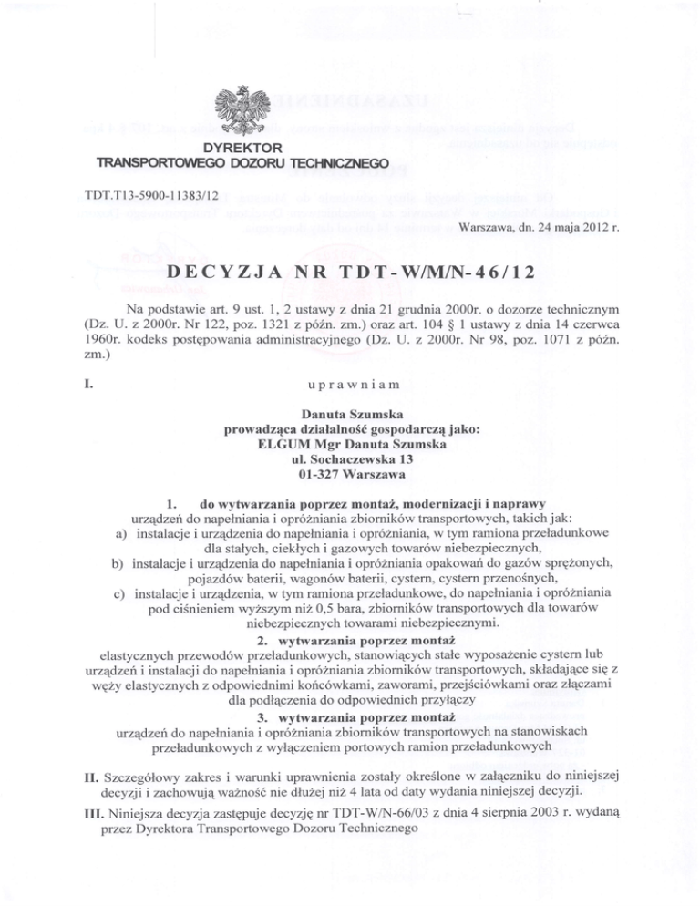 przez Dyrektora Transportowego Dozoru Technicznego