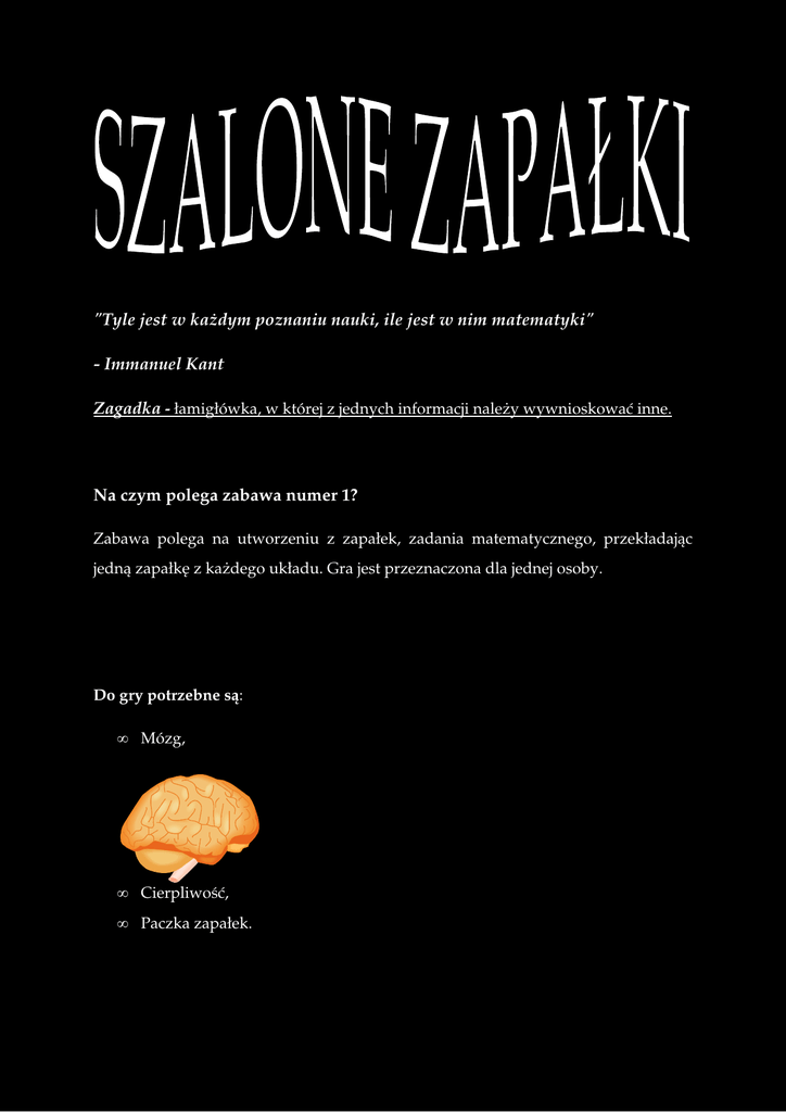 "Tyle jest w każdym poznaniu nauki, ile jest w nim matematyki" - Immanuel Kant Zagadka - łamigłówka, w której z jednych informacji należy wywnioskować inne. Na czym polega zabawa numer 1? Zabawa polega na utworzeniu z zapałek, zadania matematycznego, przekładając jedną zapałkę z każdego układu. Gra jest przeznaczona dla jednej osoby. Do gry potrzebne są: • Mózg, • Cierpliwość, • Paczka zapałek. PRZYKŁAD: Rozwiązanie: Na czym polega zabawa numer 2? W zabawie chodzi oto, aby z szesnastu zapałek przesunąć cztery i utworzyć trzy kwadraty. Rozwiązanie: Do gry potrzebne są: • Mózg, • Cierpliwość, • Paczka zapałek. Korzyści z układania oraz rozwiązywania zagadek z zapałek: Dzięki temu, że decydujemy się na tę dość nietypową w XXI w. grę, skłaniamy nasz mózg do pracy, jest to dobra forma na „zabicie” czasu, Podejście książkowe do tematu: Gry edukacyjne: Moja opinia: Według mnie warto w sposób przedstawiony powyżej spędzać swój wolny czas. Źródła: http://gry.spryciarze.pl/o-grze/rusz-zapalka http://lamiglowki.info/2010/05/14/zagadka-z-zapalkami/ http://slownikinternetowy.pl/jezyka-polskiego/zagadka.html