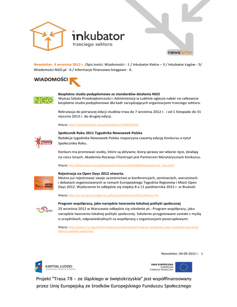 Newsletter, 4 września 2012 r. /Spis treści: Wiadomości - 1 / Inkubator Kielce – 3 / Inkubator Łagów - 5/ Wiadomości NGO.pl - 6 / Informacje finansowo-księgowe - 6. Bezpłatne studia podyplomowe ze standardów działania NGO Wyższa Szkoła Przedsiębiorczości i Administracji w Lublinie ogłasza nabór na całkowicie bezpłatne studia podyplomowe dla kadr zarządzających organizacjami trzeciego sektora. Rekrutacja do pierwszej edycji studiów trwa do 7 września 2012 r. i od 1 listopada do 31 stycznia 2013 r. do drugiej edycji. Więcej: http://swietokrzyskie.ngo.pl/wiadomosc/780074.html Społecznik Roku 2011 Tygodnika Newsweek Polska Redakcja tygodnika Newsweek Polska rozpoczyna czwartą edycję Konkursu o tytuł Społecznika Roku. Konkurs ma promować osoby, które są aktywne, biorą sprawy we własne ręce, działają na rzecz innych. Akademia Rozwoju Filantropii jest Partnerem Merytorycznym Konkursu. Więcej: http://filantropia.org.pl/pl/content/index/read/id/648/title/spolecznik_roku.html Rejestracja na Open Days 2012 otwarta. Można już rejestrować swoje uczestnictwo w konferencjach, seminariach, warsztatach i debatach organizowanych w ramach Europejskiego Tygodnia Regionów i Miast Open Days 2012. Wydarzenie to odbędzie się między 8 a 11 października 2012 r. w Brukseli. Więcej: http://ec.europa.eu/regional_policy/conferences/od2012/theme.cfm Program współpracy, jako narzędzie tworzenia lokalnej polityki społecznej 25 września 2012 w Warszawie odbędzie się szkolenie pt.: Program współpracy, jako narzędzie tworzenia lokalnej polityki społecznej. Szkolenie przygotowane zostało z myślą o urzędnikach, odpowiedzialnych za współpracę z organizacjami pozarządowymi. Więcej: http://www.cris.org.pl/informacje/wszystkie/zobacz/Program-wspolpracy-jako-narzedzie-tworzenialokalnej-polityki-spolecznej Newsletter, 04-09-2012 r. 1 Pacanów. Bajkowy ulubieniec – konkurs Europejskie Centrum Bajki im. Koziołka Matołka w Pacanowie zaprasza do udziału w konkursie „Moja ulubiona postać bajkowa, którą spotkałem w Pacanowie”. Uczestniczyć w nim mogą dzieci w wieku 6-13 lat. Prace literackie lub plastyczne można przysyłać do 28 września. Więcej: http://www.sejmik.kielce.pl/przedstaw-bajkowego-ulubienca-,32891.html Pożyczki dla podmiotów ekonomii społecznej Bank Gospodarstwa Krajowego uruchomił pożyczki dla podmiotów ekonomii społecznej. Zachęcamy do śledzenie działań z tego zakresu. Więcej: http://www.bgk.com.pl/aktualnosci/19-07-2012-preferencyjne-pozyczki-dla-podmiotow-ekonomiispolecznej Nabór wniosków do Funduszu Partnerskiego Operator Grantu Blokowego ustanowionego w ramach Szwajcarsko-Polskiego Programu Współpracy ogłasza drugi nabór wniosków do Funduszu Partnerskiego. Organizacje pozarządowe mogą być Partnerem w projekcie. Termin zakończenia naboru upływa 28 grudnia 2012 r. Więcej: http://www.swissgrant.pl/pl/szwajcarski-grant-blokowy/aktualnosci/246-ogloszenie-naboru-fp2 Regionalny Konkurs Grantowy 2012 O dotacje do 7 000 zł mogą ubiegać się organizacje pozarządowe, gminne domy kultury i gminne biblioteki oraz nieformalne grupy dorosłych z terenów wiejskich i miast do 20 000 mieszkańców. Celem projektów realizowanych w ramach Programu jest wyrównywanie szans na dobry start w dorosłe życie młodzieży w wieku gimnazjalnym i ponadgimnazjalnym (13-19 lat) z małych miejscowości, poprzez podnoszenie ich kompetencji i rozwój umiejętności społecznych. Termin składania wniosków upływa 10 października 2012 roku. Więcej: http://www.rownacszanse.pl/ Promowanie różnorodności kulturowej i artystycznej Ministerstwo Kultury i Dziedzictwa Narodowego ogłasza nabór wniosków o dofinansowanie projektów. Obszary tematyczne, w ramach których można składać projekty to edukacja artystyczna i kulturalna; dziedzictwo kulturowe, w tym dziedzictwo materialne i niematerialne oraz literatura i archiwa; muzyka i sztuki sceniczne; sztuki plastyczne i wizualne. Nabór projektów potrwa do 15 października 2012 r. Więcej:http://www.eog.gov.pl/Aktualnosci/Strony/Ruszanaborwnioskowwramachprogramuroznorodnoscwkult urze120615.aspx Newsletter, 04-09-2012 r. 2 Kielce. Seminarium powiatowe „Przedsiębiorca społeczny na rynku pracy” Świętokrzyskie Centrum Innowacji i Transferu Technologii oraz Fundacja „Regionalis” organizują seminarium dotyczące ekonomii społecznej i sytuacji III sektora w Kielcach. Uczestnicy seminarium będą mieli pierwszeństwo w procesie rekrutacji na bezpłatne warsztaty z zakładania i funkcjonowania podmiotów ekonomii społecznej, które odbędą się w dniu 24-26 września w Kieleckim Parku Technologicznym, ul. Olszewskiego 6, 25-663 Kielce. Osoby zainteresowane udziałem w seminarium prosimy o dostarczenie formularza zgłoszeniowego drogą mailową na adres: [email protected] bądź faksem na numer: (41) 344 38 77 do 10 września 2012. Data: seminarium odbędzie się 11 września 2012, w godz. 10:00-14:00, w Kielcach. Więcej: www.przedsiebiorcaspoleczny.pl Kielce. Bezpłatne szkolenie "Zarządzanie personelem" Fundacja „Fundusz Inicjatyw” (FFI) zaprasza do wzięcia udziału w bezpłatnym szkoleniu „Zarządzanie personelem”. Uczestnicy mają zapewnione bezpłatne materiały szkoleniowe, pomocnicze oraz książki. Data: 19-21 września 2012 (środa, czwartek, piątek zajęcia od 9:00 do 16:00) lub 21-23 września 2012 (piątek, zajęcia od 13:00 do 20:00, sobota, niedziela zajęcia od 9:00 do 16:00) Więcej: www.ffi.org.pl/kompetentni211/ Kielce. Szkolenie „Autoprezentacja i wystąpienia publiczne” Fundacja „Fundusz Inicjatyw” (FFI) zaprasza do wzięcia udziału w bezpłatnym szkoleniu „Autoprezentacja i wystąpienia publiczne”. Data: 19-21 września 2012 (środa, czwartek, piątek zajęcia od 9:00 do 16:00) lub 21-23 września 2012 (piątek, zajęcia od 13:00 do 20:00, sobota, niedziela zajęcia od 9:00 do 16:00) Więcej: www.ffi.org.pl/kompetentni211/ Kielce. 