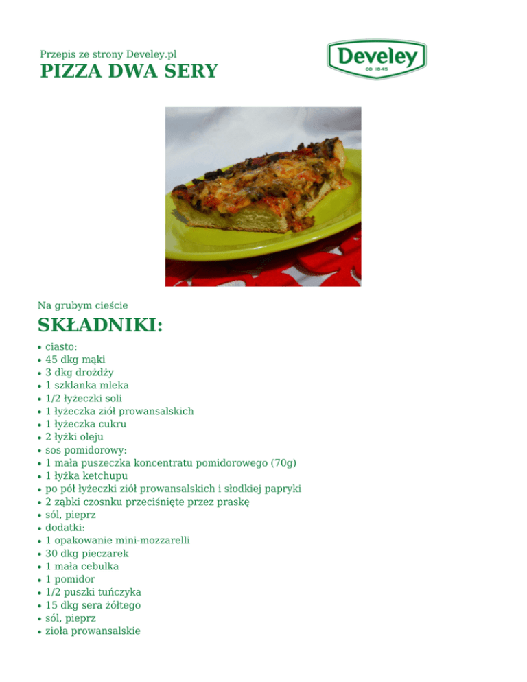 Przepis ze strony Develey.pl PIZZA DWA SERY Na grubym cieście SKŁADNIKI: ● ● ● ● ● ● ● ● ● ● ● ● ● ● ● ● ● ● ● ● ● ● ● ciasto: 45 dkg mąki 3 dkg drożdży 1 szklanka mleka 1/2 łyżeczki soli 1 łyżeczka ziół prowansalskich 1 łyżeczka cukru 2 łyżki oleju sos pomidorowy: 1 mała puszeczka koncentratu pomidorowego (70g) 1 łyżka ketchupu po pół łyżeczki ziół prowansalskich i słodkiej papryki 2 ząbki czosnku przeciśnięte przez praskę sól, pieprz dodatki: 1 opakowanie mini-mozzarelli 30 dkg pieczarek 1 mała cebulka 1 pomidor 1/2 puszki tuńczyka 15 dkg sera żółtego sól, pieprz zioła prowansalskie ● słodka i ostra papryka SPOSÓB PRZYGOTOWANIA: 1. Mleko lekko podgrzać, dodać drożdże i cukier i wymieszać. Kiedy drożdże zaczną rosnąć przelać mleko do miski z mąką. Dodać resztę składników i wyrobić ciasto. Odstawić do wyrośnięcia. 2. Z podanych składników przygotować sos pomidorowy. Pieczarki pokroić i podsmażyć do odparowania soku, doprawić. Ciasto przełożyć do tortownicy o średnicy 29 cm, posmarować sosem i rozłożyć mozzarellę. 3. Na cieście rozłożyć pieczarki, pokrojoną w piórka cebulkę, pomidora i tuńczyka. Wierzch posypać serem żółtym, ziołami prowansalskimi i słodka papryką. Zapiekać 40 minut w piekarniku rozgrzanym do 200 stopni. Podawać z ketchupem lub sosem czosnkowym. Smacznego :)