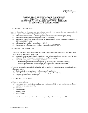 1 Załącznik Nr 6 do Regulaminu pracy WYKAZ PRAC STANOWIĄCYCH ZAGROŻENIE DLA ZDROWIA I ŻYCIA PRACOWNIKÓW BĘDĄCYCH W KONTAKCIE CZYNNYM I BIERNYM Z CZYNNIKAMI SZKODLIWYMI I. CZYNNIKI CHEMICZNE. Prace w kontakcie z chemicznymi czynnikami szkodliwymi stanowiącymi zagrożenie dla zdrowia i życia pracowników. Czynnikami tymi są: a/ substancje rakotwórcze i o prawdopodobnym działaniu rakotwórczym (/45/*), b/ substancje teratogenne i mutagenne (46/60/61/62/63*), c/ substancje szkodliwe oraz toksyczne, w tym również środki ochrony roślin (20/21/ /22/23/24/25/26/27/28*), d/ substancje łatwopalne i wybuchowe (10/34), e/ alergeny oraz substancje powodujące podrażnienia (36/37/38*). II. CZYNNIKI BIOLOGICZNE. 1. Prace w narażeniu na działanie szkodliwych czynników biologicznych : ludzkich, odzwierzęcych i roślinnych, takich jak: a/ materiał zakaźny pochodzenia ludzkiego, np. wirusy zapalenia wątroby typu B, ospy, różyczki, HIV, cytomegalii oraz bakterie, np. listeriozy itp., b/ materiały biologiczne odzwierzęce, w tym : - drobnoustroje chorób odzwierzęcych, tj. zoonozy oraz naturalne toksyny, - alergeny pochodzenia zwierzęcego, jak : wydaliny, roztocza, sierść itp. 2. Prace w narażeniu na działanie szkodliwych czynników biologicznych pochodzenia roślinnego, w tym: a/ drobnoustroje występujące w roślinach, grzyby, pleśnie, b/ naturalne toksyny roślinne, takie jak : atlatoksyny, alkaloidy itp. c/ alergeny pochodzenia roślinnego. III. CZYNNIKI FIZYCZNE. 1. Prace w narażeniu na: a/ promieniowanie jonizujące (α, β, γ oraz rentgenowskie), w tym emitowane z ekranów monitorów komputerowych, b/ laserowe, c/ nadfioletowe, d/ podczerwone, e/ mikrofalowe. ___________________ * oznaczenie skali zagrożenia czynnikami chemicznymi wg katalogu Aldricha, tzn. wg norm UE (Dział Organizacyjny – 2007) 2 2. Prace w narażeniu na silne zmienne i stałe pola magnetyczne oraz elektryczne. 3. Prace, którym towarzyszą silne wibracje mechaniczne. 4. Prace w hałasie: a/ gdy równoważny poziom dźwięku (A) hałasu ustalonego i nieustalonego mierzony zgodnie z polskimi normami przekracza 80 dB (dla ośmiogodzinnej ekspozycji na hałas), b/ gdy równoważny poziom dźwięku (A) hałasu impulsowego quasi-stacjonarnego mierzony zgodnie z wytycznymi Głównego Inspektoratu Sanitarnego przekracza 75 dB (A) /dla ośmiogodzinnej ekspozycji na hałas/. 5. Prace w narażeniu na szkodliwe działanie pyłów, w tym: a/ pyłów o działaniu zwłókniającym i drażniącym, b/ pyłów o działaniu alergennym. 6. Prace w nieodpowiednim oświetleniu. 7. Prace w obciążającym mikroklimacie środowiska pracy określonym przepisami dopuszczalnego obciążenia cieplnego (NDN) oraz najwyższym dopuszczalnym stężeniem i natężeniem czynników szkodliwych, a mianowicie: a/ prace w mikroklimacie gorącym, b/ prace w mikroklimacie zimnym, c/ prace w mikroklimacie zmiennym. Wykaz prac oraz czynników stanowiących zagrożenie dla zdrowia i życia pracowników określony jest szczegółowo w rozporządzeniu Ministra Pracy i Polityki Społecznej z dnia 29 listopada 2002 r. w sprawie najwyższych dopuszczalnych stężeń i natężeń czynników szkodliwych dla zdrowia w środowisku pracy (Dz. U. Nr 217, poz. 1833, z późniejszymi zmianami). Wykaz ten stanowić powinien podstawę określania stanu zagrożenia na poszczególnych stanowiskach pracy w Uniwersytecie Wrocławskim w toku monitorowania stanowisk oraz przyznawania i określania wysokości dodatków specjalnych przyznawanych pracownikom zatrudnionym na tych stanowiskach. Powinien również stanowić podstawę do wszczęcia roszczeń, na przykład rentowych, odszkodowawczych, w razie stwierdzenia wystąpienia trwałych negatywnych skutków zdrowotnych lub utraty życia w wyniku działania wymienionych czynników. W wymienionym wykazie należy uwzględnić te czynniki zagrożenia zdrowia i życia pracownika, które mogą powstać w trakcie prac badawczych nad nieznanymi dotąd substancjami i zjawiskami. (Dział Organizacyjny – 2007)