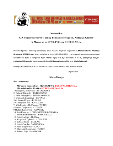 Komunikat XIX Międzynarodowy Turniej Tenisa Stołowego im. Andrzeja Grubby X Memoriał ze STAR-PEC-em 23-24.08.2014 r. Ośrodek Sportu i Rekreacji oświadcza, że w związku z tym iż regulamin X Memoriału im. Andrzeja Grubby ze STARPEC-em, który odbył się w dniach 23-24.08.2014 r. w kategorii Aamatorzy dopuszczał zawodników tylko i wyłącznie tych, którzy nigdy nie byli zrzeszeni w PZTS, podejmuje decyzje o zdyskwalifikowaniu dwóch zawodników Mirisława Sonnenfeld oraz Michała Gostół. Dlatego też klasyfikacja w kat. Amatorzy ulega przesunięciu o dwa miejsca w górę . Organizator Klasyfikacja Kat. Amatorzy: Mirosław Sonnenfeld – SKARSZEWY DYSKFALIFIKACJA Michał Gostół – IŁAWA DYSKFALIFIKACJA 1.Grzegorz Ziółkowski - BYDGOSZCZ 2. Robert Różyński - BYDGOSZCZ 3. Piotr Przybylski – SIEMIANOWICE 4. Wojciech Ratajczyk - GDYNIA 5-6. Janusz Kriger - ELBLĄG 5-6. Zbigniew Tul - KWIDZYN 7. Włodzimierz Hoffmann - TORUŃ 8.Janusz Grajkowski - TORUŃ 9.Hubert Kulczyński - GDAŃSK 10. Rafał Megger – CHOJNICE UKS ÓSEMKA 11. Paweł Bielunkiewicz - BYDGOSZCZ 12. Artur Lubnau - IŁAWA 13. Krzysztof Zgłobicki - GDAŃSK 14. Łukasz Susło - ELBLĄG 15. Artur Czapla - DĄBRÓWKA 16. Piotr Rogiewicz - SOPOT 17. Sławomir Mórawski - TORUŃ 18. Robert Ziaja - MALBORK 19. Paweł Gołębiewski - ELBLĄG 20. Adam Borkowski - GDAŃSK 21. Sławomir Hussarek - KOŹMIN 22. Zbigniew Schwarz – STAROGARD GDAŃSKI 23. Artur Gromko - ELBLĄG 24. Ireneusz Curyl - GDAŃSK 25. Mariusz Sadowski – SWAROŻYN 26. Piotr Janowicz - GDAŃSK 27. Roman Grudzień – ELBLĄG 28. Janusz Sznajder - GDAŃSK 29. Roman Góralski - IŁAWA 30. Jarosław Jagiełka - TORUŃ 31. Bartosz Peikowski – STAROGARD GDAŃSKI 32 .Jan Trzciński - GÓRA 33. Robert Bukowski – KOŹMIN 34. Lech Leszczyński - BYDGOSZCZ 35. Roman Grudzień - ELBLĄG 36. Jakub Zawistowski – SĘPÓLNO KRAJEŃSKIE 37. Henryk Wojciechowski - ELBLĄG 38. Krzysztof Wierzchucki -SĘPOLNO KRAJEŃSKIE 39. Krzysztof Rękas- STAROGARD GDAŃSKI 40. Piotr Iwicki – ELBLĄG Kat. Amatorki: 1. Magdalena Bukowska - KOŹMIN Kat. Żaczki 1. Ewa Krakowiak – GKTS Gdańsk 2. Ramona Nowak – KUKS REMUS Kościerzyna 3. Zofia Szlufik – LUKS Straszyn 4. Melania Fiodorowa – Kaliningrad 5/6 Neli Iwanowa – Kaliningrad 5/6 Julia Dietrich – LUKS Straszyn 7/8 Wiktorai Kucero – Kaliningrad 7/8 Irina Drude – Kaliningard 9-10-11 Angelika Majkowska – Lamk 9-10-11 Jana Drude – Kaliningard 9-10 -11 Agata Szurgot – KS Beniaminek Kat. Żacy 1.Dawid Michna - UKS LIS Sierakowice 2. Antoni Zgliński – KS ENERGA Toruń 3. Siergiej Strelcov– Kaliningrad 4. Andriej Pede – Kaliningrad 5/6 Adrian Kuban – LUKS Starszyn 5/6 Władysław Timofiejew – Kaliningrad 7/8 Bartosz Smolnicki – LUKS Starszyn 7/8 Fabian Peikowski – KS Beniaminek 9-10-11-12 Antoni Janikowski – MLKS Krajna Sępólno Krajeńskie 9-10-11-12 Franciszek Tuj – MTS Kwidzyn 9-10-11-12 Adam Żuk – LUKS Straszyn 9-10-11-12 Smirnow Evgenii – Kaliningard 13-14-15 Samuel Michna – UKS LIS Sierakowice 13-14-15 – Dominik Majkowski – Lamk 13-14-15 – Kamil Karpowicz – LUKS Straszyn Kat. Młodziczki 1. Martyna Kowalska – Gdańsk 2. Julia Brodowska – SLKS Olimpijczyk Jeżewo 3. Karolina Oleksik – GKST Gdańsk 4. Daria Bezwierchaja – Kaliningrad 5/6 Klaudia Cecelska – SLKS Olimpijczyk Jeżewo 5/6 Katarzyna Spiek – SLKS Olimpijczyk Jeżewo 7/8 Alena Kochetowa – Kaliningrad 7/8 Natalia Siemieńska – SLKS Olimpijczyk Jeżewo 9-10-11-12 Wiktoria Dobies – SLKS Olimpijczyk Jeżewo 9-10-11-12 Magda Rajkowska – SLKS Olimpijczyk Jeżewo 9-10-11-12 Aleksandra Nowakowska – GKTS Gdańsk 9-10-11-12 Ksenia Fiedorowa - Kaliningrad 13. Julia Rogowska – Sępólno Krajeńskie Kat. Młodzicy 1. Paweł Jarząbkowski – KS Energa Toruń 2. Jakub Maruszak - KS Energa Toruń 3. Daniel Cendrowski – SLKS Olimpijczyk Jeżewo 4. Adrian Tyburski – SLKS Olimpijczyk Jeżewo 5. /6 Szymon Szurgot – KS Beniaminek 5/6 Artiom Korżawin – Kaliningrad 7/8 Dimitr Kolesnikow – Kaliningrad 7/8 Krystian Igielski – SLKS Olimpijczyk Jeżewo 9/10 Filip Przeperski – Wielbrandowo 9/10 Roman Borowkow – Kaliningrad 11. Kamil Sobczyński – SLKS Olimpijczyk Jeżewo 12. Jan Knopik – Lipusz 13. Jakub Sawicki – LUKS Straszyn 14. Krzysztof Dziewulski – LUKS Straszyn Kat. Kadetki 1. Patrycja Rybacka – MLSK Krajna Sępólno Krajeńskie 2. Wiktoria Nikitina – Kaliningrad 3. Katarzyna Płotka – Luzino 4. Magdalena Płotka – Luzino 5. /6 Paulina Oleksik - GKTS Gdańsk 5/6 Daria Tuchto – Kaliningard 7/8 Julia Kała – MLKS Krajna Sępólno Krajeńskie 7/8 Maja Nurska – GKTS Gdańsk 9/10/11/12 Karolina Kotuniak – MLKS Krajna Sępólno Krajeńskie 9/10/11/12 Kamila Nowakowska – GKTS Gdańsk 9/10/11/12 Claudia Zielinska – KS Beniaminek 9/10/11/12 Daria Zaindinowa – Kaliningard Kat. Kadeci 1. Michał Małachowski – Kwidzyn 2. Paweł Szymański – Olimpia Unia Grudziądz 3. Bartosz Czerwiński – MRKS Gdańsk 4. Jacek Thomas – MLKS Krajna Sępólno Krajeńskie 5. /6 Tomasz Malicki – Olimpia Unia Grudziądz 5/6 Przemysław Dosz - LKS Pogoń Lębork 7/8 Karol Behrendt – Olimpia Unia Grudziądz 7/8 Przemysław Winowiecki – MLKS Krajna Sępólno Krajeńskie 9/10/11/12 Oskar Jankuniec – GKTS Gdańsk 9/10/11/12 Piotr Przypaśnik – GKTS Gdańsk 9/10/11/12 Adrian Reniecki – Olimpia Unia Grudziądz 9/10/11/12 Błażej Jędrzejewski – Kwidzyn 13. Konrad Gostymczyk – Lipnica 14. Jacek Staniszewski 15. Mariusz Wołowiecki – MRKS Gdańsk 16. Klaudiusz Hochel - MLKS Krajna Sępólno Krajeńskie 17. Kiryl Borowkov – Kaliningard 18. Roman Kraiński – LUKS Straszyn 19. Kacper Góralski – MLKS Ostróda 20. Michael Wodziński – KS Beniamiek Kat. Juniorki 1. Marcelina Kamińska – LUKS Straszyn 2. Luiza Guszczina – Kaliningrad 3. Natalia Kawecka – MTS Kwidzyn 4/5Julia Witkowska – MLKS Gdańsk 4/5Hanna Nurska – GKTS Gdańsk 6. Dżesika Ławrentiewa