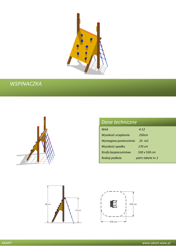 WSPINACZKA Dane techniczne Wiek 4-12 Wysokość urządzenia 250cm Wymagana powierzchnia 25 m2 Wysokość upadku 170 cm Strefa bezpieczeństwa 530 x 530 cm Rodzaj podłoża AKANT patrz tabela nr.1 www.akant.waw.pl