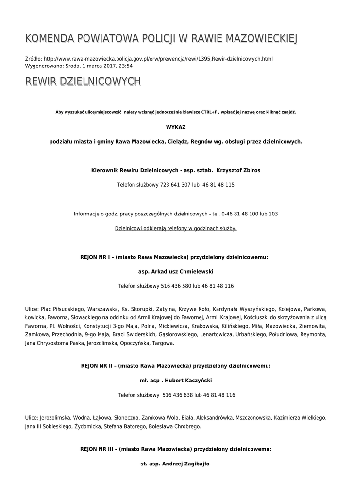 KOMENDA POWIATOWA POLICJI W RAWIE MAZOWIECKIEJ Źródło: http://www.rawa-mazowiecka.policja.gov.pl/erw/prewencja/rewi/1395,Rewir-dzielnicowych.html Wygenerowano: Środa, 1 marca 2017, 23:54 REWIR DZIELNICOWYCH Aby wyszukać ulicę/miejscowość należy wcisnąć jednocześnie klawisze CTRL+F , wpisać jej nazwę oraz kliknąć znajdź. WYKAZ podziału miasta i gminy Rawa Mazowiecka, Cielądz, Regnów wg. obsługi przez dzielnicowych. Kierownik Rewiru Dzielnicowych - asp. sztab. Krzysztof Zbiros Telefon służbowy 723 641 307 lub 46 81 48 115 Informacje o godz. pracy poszczególnych dzielnicowych - tel. 0-46 81 48 100 lub 103 Dzielnicowi odbierają telefony w godzinach służby. REJON NR I – (miasto Rawa Mazowiecka) przydzielony dzielnicowemu: asp. Arkadiusz Chmielewski Telefon służbowy 516 436 580 lub 46 81 48 116 Ulice: Plac Piłsudskiego, Warszawska, Ks. Skorupki, Zatylna, Krzywe Koło, Kardynała Wyszyńskiego, Kolejowa, Parkowa, Łowicka, Faworna, Słowackiego na odcinku od Armii Krajowej do Fawornej, Armii Krajowej, Kościuszki do skrzyżowania z ulicą Faworna, Pl. Wolności, Konstytucji 3-go Maja, Polna, Mickiewicza, Krakowska, Kilińskiego, Miła, Mazowiecka, Ziemowita, Zamkowa, Przechodnia, 9-go Maja, Braci Swiderskich, Gąsiorowskiego, Lenartowicza, Urbańskiego, Południowa, Reymonta, Jana Chryzostoma Paska, Jerozolimska, Opoczyńska, Targowa. REJON NR II – (miasto Rawa Mazowiecka) przydzielony dzielnicowemu: mł. asp . Hubert Kaczyński Telefon służbowy 516 436 638 lub 46 81 48 116 Ulice: Jerozolimska, Wodna, Łąkowa, Słoneczna, Zamkowa Wola, Biała, Aleksandrówka, Mszczonowska, Kazimierza Wielkiego, Jana III Sobieskiego, Żydomicka, Stefana Batorego, Bolesława Chrobrego. REJON NR III – (miasto Rawa Mazowiecka) przydzielony dzielnicowemu: st. asp. Andrzej Zagibajło Telefon służbowy 516 436 660 lub 46 81 48 116 Ulice: Kościuszki do skrzyżowania z ulica Faworna, Tomaszowska lewa strona, Tulipanowa, Różana, Kaczeńcowa, Akacjowa, Wierzbowa, Zielona, Osada Dolna, Przemysłowa, Solidarności Niepodległości, Polna, Zwolińskiego, Krakowska prawa strona, Południowa, Konstytucji 3-go Maja bloki. REJON NR IV – (miasto Rawa Mazowiecka) przydzielony dzielnicowemu: asp. Grzegorz Zajączkowski Telefon służbowy 516 436 662 lub 46 81 48 116 Ulice: Tomaszowska prawa strona, Prusa, Kochanowskiego, Tuwima, Konopnickiej, Żmichowskiej, Żeromskiego, Dąbrowskiej, Orzeszkowej, Sienkiewicza, Dolna, Katowicka, Tatar, Wyzwolenia, Słowackiego do ulicy Fawornej, Browarna , Cmentarna, Nowa, 1-go Maja, Księże Domki, Jeżowska, Sadowa, Wiśniowa, Ogrodowa, Piaskowa, Orzechowa, Willowa, Laskowa, Skierniewicka, Wałowska, Murarska, Jasińskiego, Żytnia, Piekarska, Podmiejska, Pszeniczna, Piwna, Chmielna, Słodowa. REJON NR V – (gmina Rawa Mazowiecka) przydzielony dzielnicowemu: mł. asp. Patryk Szymański Telefon służbowy 516 436 664 lub 46 81 48 116 Miejscowości: Byliny Stare, Zawady, Kaliszki, Ścieki, Soszyce, Pasieka Wałowska, Wałowice, Huta Wałowska, Janolin, Gaj, Lutówka, Wojska Stara, Wojska Nowa, Wilkowice, Linków, Rosocha, Rogowiec, Pokrzywna, Niwna, Kurzeszyn, Kurzeszynek, Stary Dwór, Wołucza, Helenów, Żydomice, Księża Wola, Chrusty, Zielone, Małgorzatów, Dziurdzioły, Zarzecze, Garłów, Boguszyce, Przewodowice, Julianów Raducki, Julianów, Jakubów, Zagórze, Kaleń, Konopnica, Pukinin, Byszewice, Świnice, Bogusławki Małe, Bogusławki Duże, Matyldów, Głuchówek, Kolonia Głuchówek, Podlas, Leopoldów. 50 wsi REJON NR VI – (gmina Cielądz i Regnów) przydzielony dzielnicowemu: mł.asp. Marcin Janiszewski Telefon służbowy 516 436 702 lub 46 81 48 116 Miejscowości: Brzozówka, Cielądz, Gortatowice, Grabice, Gułki, Komorów, Nowy Komorów, Kuczyna, Łaszczyn, Ossowice, Parolice, Sanogoszcz, Sierzchowy, Stolniki, Wisówka, Wylezinek, Zuski, Annosław, Kazimierzów, Nowy Regnów, Podskarbice Królewskie, Podskarbich Szlacheckie, Regnów, Rylsk, Rylsk Mały, Rylsk Duży, Sławków, Sowidół, Wólka Strońska. wsi WYKAZ podziału miasta i gminy Biała Rawska, Sadkowice wg. obsługi przez dzielnicowych. Informacje o godz. pracy poszczególnych dzielnicowych - tel. 0-46 813 25 30 REJON NR I - miasto Biała Rawska przydzielony dzielnicowemu: mł. asp. Tomasz Węgier 29 Telefon służbowy 516 436 750 lub 46 313 25 45 REJON NR II - gmina Biała Rawska, przydzielony dzielnicowemu: asp. sztab. Grzegorz Malarowicz Telefon służbowy 516 436 727 lub 46 813 25 43 Miejscowości: Babsk, Gołyń, Franopol, Studzianek, Słupce, Franklin, Aleksandrów,, Koprzywna, Krukówka, Marchaty, Nowe Przyłuski,, Podsędkowice, Przyłuski, Stanisławów, Stara Wieś, Szwejki Małe, Teresin, Wola Chojnata, Antoninów, Bronisławów, Chrząszczew, Chrząszczewek, Marianów, Pągów, Porady Górne, Rokszyce, Podlesie, Zakrzew, Zofiów, Żurawia, Żurawka, Grzymkowice, Białogórne, Biała Wieś, Błażejewice, Byki, Wilcze Piętki, Tuniki, Pachy, Dańków, Galinki, Narty, Niemirowice, Rzeczków, Orla Góra,Szczuki, Chodnów, Gośliny, Janów, Józefów, Konstantynów, Nowy Chodnów,Wólka Lesiewska, Jelitów, Julianów Lesiewski, Lesiew, Ossa, Rosławowice,Teodozjów, Wólka Babska, Zofianów REJON NR III - gmina Sadkowice przydzielony dzielnicowemu: sierż.sztab. Konrad Truszkowski Telefon służbowy 516 436 758 lun 46 413 25 41 Miejscowości: Sadkowice, Nowe Sadkowice, Kaleń, Paprotnia, Gogolin, Celinów, Nowe Szwejki, Nowy Kaleń, Olszowa Wola, Bujały, Rzymiec, Szwejki Wielkie, Pilawy, Lutobory, Nowe Lutobory, Lubania, Żelazna, Włądysławów, Skarbkowa, Lipna, Trębaczew, Kłopoczyn, Jajkowice, Zaborze, Broniew, Rudka, Nowy Kłopoczyn, Rokitnica-Kąty, Lewin, Zabłocie, Przyłuski, Studzianki, Gacpary, Turobowice Ocena: 0/5 (0) Tweetnij