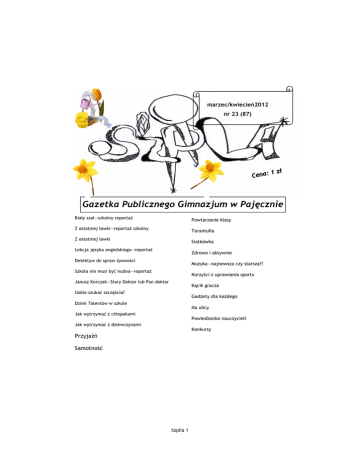marzec/kwiecień2012 nr 23 (87) 1 zł Cena: Gazetka Publicznego Gimnazjum w Pajęcznie Biały szał—szkolny reportaż Powtarzanie klasy Z ostatniej ławki—reportaż szkolny Tarantulla Z ostatniej ławki Siatkówka Lekcja języka angielskiego—reportaż Zdrowo i aktywnie Detektyw do spraw żywności Muzyka—najnowsza czy starsza?! Szkoła nie musi być nudna—reportaż Korzyści z uprawiania sportu Janusz Korczak—Stary Doktor lub Pan doktor Kącik gracza Gdzie szukać szczęścia? Gadżety dla każdego Dzień Talentów w szkole Na ulicy Jak wytrzymać z chłopakami Powiedzonka nauczycieli Jak wytrzymać z dziewczynami Konkursy Przyjaźń Samotność Szpila 1 P iątek. Każdy uczeń Publicznego Gimnazjum w Pajęcznie budzi się rano z myślą, że to ostatni dzień, po którym w zupełności odda się odpoczynkowi w czasie dwudniowego weekendu. W numerze: W dniu 21 marca, w pierwszym dniu wiosny, odbył się w naszej szkole Dzień Talentów. Uczniowie uczestniczyli w różnych projektach oraz konkursach np. matematycznych, fizycznych, przyrodniczych, zabawach oraz potyczkach językowych i literackich. B Zawsze w numerze: ohaterem dzisiejszego reportażu jest pan Jan Nowak, woźny w Publicznym Gimnazjum w Pajęcznie , wygląda on przeciętnie. Zawsze ma na sobie sweter i ogrodniczki. Od Redakcji Aktualności Porady Sport T W ak, co prawda, mawiają kryminaliści, ale w Twoim akurat przypadku sprawa wygląda po- Kącik gadżetów Recenzje Kącik poetycki Opowiadania Powiedzonka nauczycieli Rozrywka (humor, rebusy, zagadki, ciekawostki) dobnie: Powtórka roku to nie tragedia, chodź i nic przyjemnego. Konkurs Szpila 2 iosna to czas, kiedy chcemy zadbać o nasze ciało i zrzucić „parę kilo” do wakacji. Od Redakcji Drodzy Czytelnicy ! W końcu nadeszła długo wyczekiwana wiosna! Słońce świeci coraz jaśniej, dni są dłuższe, a nam aż chce się rano wstawać, by ujrzeć błękitne, niezachmurzone niebo jaśniejące słońcem. Wszystko budzi się do życia, nawet my, szczególnie trzecioklasiści, bo przecież powoli zbliża się moment wybierania dalszej szkoły. Może nie dla wszystkich jest to przyjemne, w końcu przypomina nam to, że już niedługo trzeba będzie rozstać się z przyjaciółmi, nauczycielami i całym wspaniałym okresem gimnazjum. A do Waszych rąk trafia kolejny, tym razem już wiosenny numer „Szpili”. A w nim między innymi sprawozdanie z obchodzenia w naszej szkole „Dnia talentów”, wiele ciekawych reportaży na temat codziennego życia z „ostatniej ławki” oraz mnóstwo innych, interesujących tematów. Zachęcam również do brania udziału w naszym konkursie, w którym do wygrania jest dodatkowy dzień neutralny. Pytania i informacje na ostatniej stronie. Miłego czytania ! Redaktor Naczelna Katarzyna Nowak Szpila 3 Aktualności Dzień Zakochanych 14 lutego w naszym gimnazjum także obchodziliśmy walentynki, można powiedzieć, dzień okazywania uczuć. Z tej okazji osoby ze szkolnej gazetki- „Szpili” zajęły się sprzedażą kwiatów i walentynek, które licznie kupowali uczniowie naszej szkoły, po to, by wręczyć upominek swojej sympatii lub przyjacielowi. Można było to zrobić anonimowo, przekazując sprzedającym tylko dane adresata, choć niekoniecznie, bo przecież niemądrze bać się okazywać drugiemu człowiekowi własnych uczuć ;-). Przez Samorząd Szkolny natomiast dla naszych uczniów zorganizowana była dyskoteka, która odbyła się na jednym ze szkolnych korytarzy. Licznie przybyła młodzież fantastycznie bawiła się pod czujnym okiem kilku nauczycieli. Tłusty czwartek 16 lutego w naszej szkole do nabycia były pyszne pączki, których sprzedażą zajął się Samorząd Szkolny, a przed tym kupnem i całą organizacją p. Joanna Strzelczak. Małe słodkości sprzedane zostały w mgnieniu oka. Uczniowie i nauczyciele kosztowali wręcz z przyjemnością! ;-) Występ wirtuozów każdym zaprezentowanym utworze uczniowie, ale i również nauczyciele mieli za zadanie odgadnąć jego tytuł. Dobre odpowiedzi były nagrodzone. Muzycy potrafili doskonale zainteresować wszystkich obecnych, toteż dlatego w hali sportowej panowała wspaniała atmosfera! Grający zaprezentowali nam muzykę z filmów, seriali, a nawet bajek, np. takich jak „Złotopolscy”, „Piraci z Karaibów”, „Titanic”, „Różowa pantera”, „Gliniarz z Beverly Hills” i wiele innych. Międzynarodowy Dzień Kobiet! 8 marca również obchodziliśmy ten miły dla dziewczyn i kobiet dzień. Z tej okazji Samorząd Szkolny zajął się aranżacją naszej szkolnej jednodniowej kawiarenki „Schoco-cafe”, która cieszyła się dużym zainteresowaniem. Można tam było zakupić gorącą czekoladę, ale i małe słodkości, usiąść przy stoliku i porozmawiać ze znajomymi. Poza tym dziewczyny z każdej z klas dostały od szkolnych kolegów drobne upominki lub też wspólnie udali się na pizzę. Dzień ten przebiegł w niesamowicie miłej atmosferze i oby ich w naszej szkole było jak najwięcej . ;-) 7 marca, czyli w środę, do naszej szkoły przybyło trzech muzyków, którzy na instrumentach prezentowali nam muzykę filmową. Cały koncert, na który przybyła w uroczystych strojach prawie cała młodzież naszego gimnazjum wraz z nauczycielami, przybrał formę konkursu, ponieważ po Szpila 4 Kasia Lancman ;-) & Klaudia Dźbik ;-) „Biały szał” - szkolny reportaż Zima. Biel, śnieg i rozwrzeszczani z radości uliczni chuligani. Gimnazjum w godzinach przedpołudniowych. Lekki gwar unosi się mimowolnie na pustoszejącym korytarzu. Jest po dzwonku. Zagorzali fani czekania na ostatnią chwilę leniwie podnoszą się z podłogi, gdy nauczyciel zbliża się w stronę podekscytowanej klasy. Dlaczego tak podekscytowanej? Dobrze znam misterny plan większości zafascynowanych zimą uczniów. W powietrzu buzuje chęć oddania się szalonej, białej zabawie. Wyjątkowej, bo możliwej tylko ten jeden raz w roku. I zaraz słyszę, jak ma